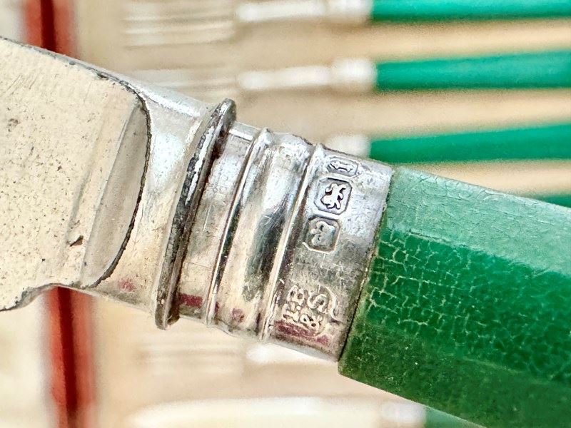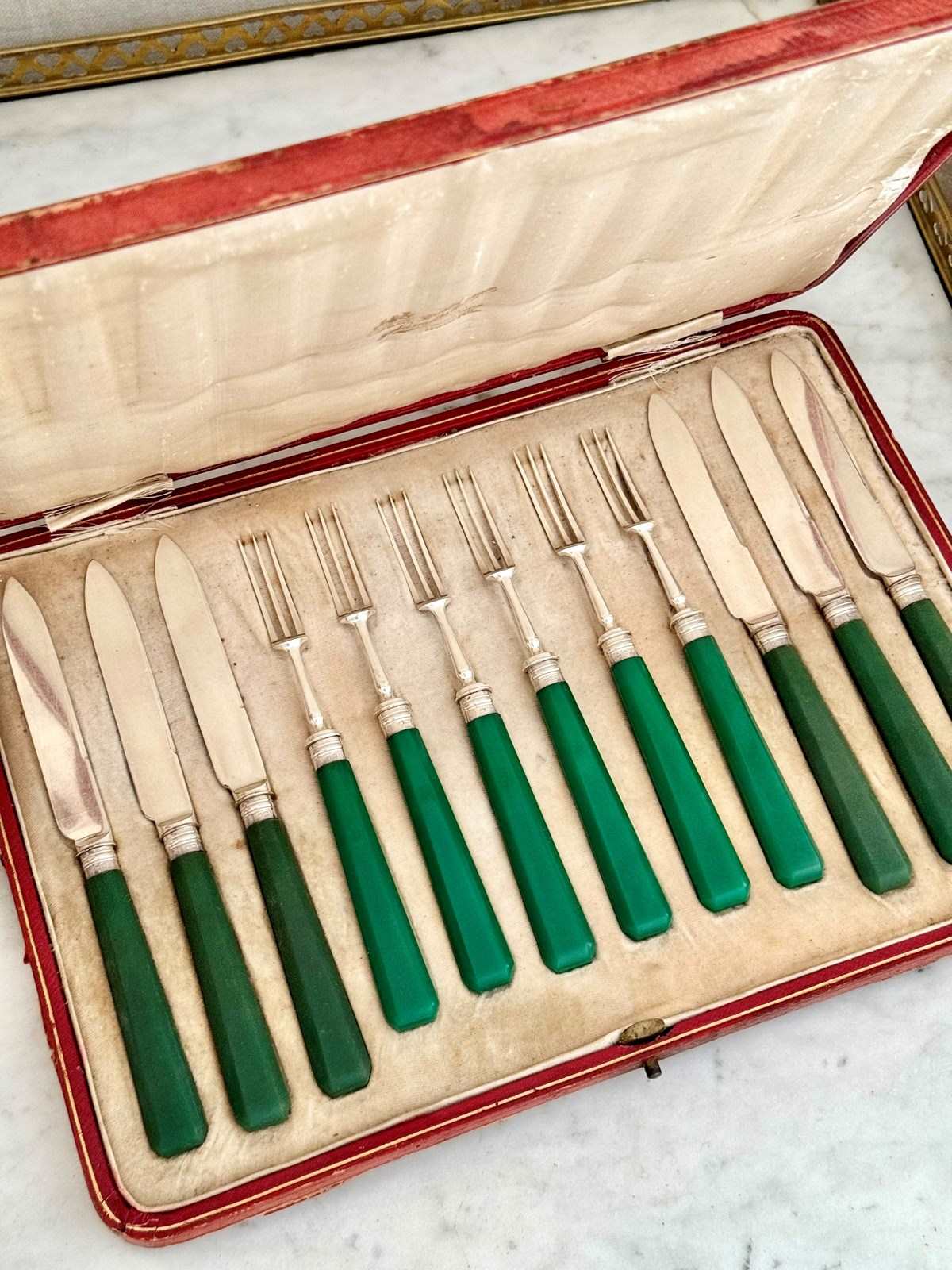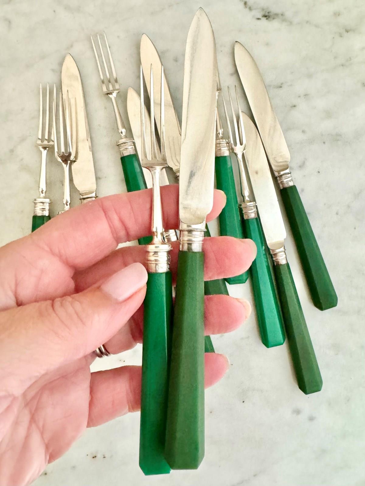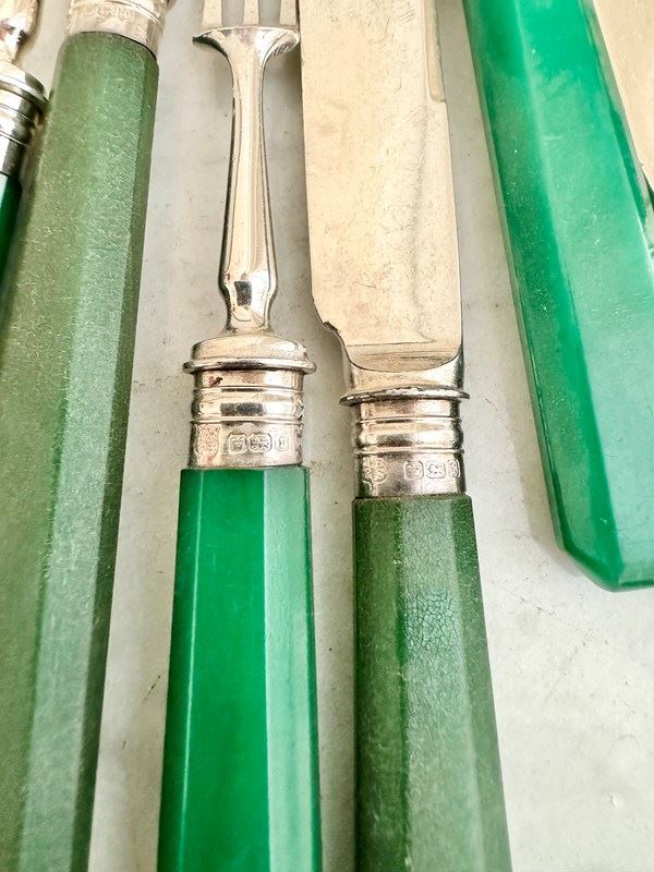 Art Deco Silver Dessert Knives Forks With Emerald Green Handles