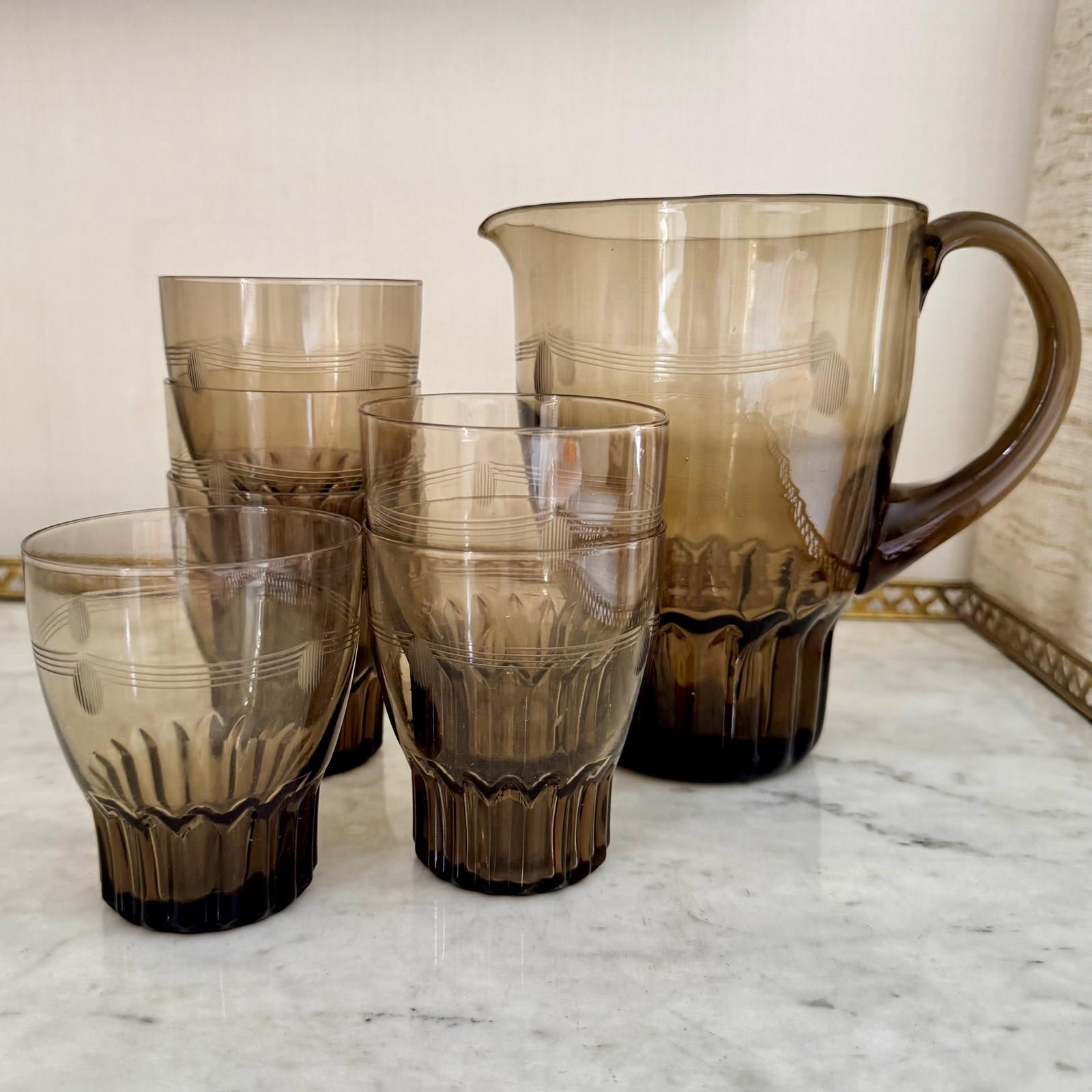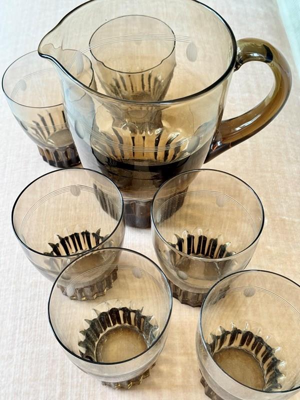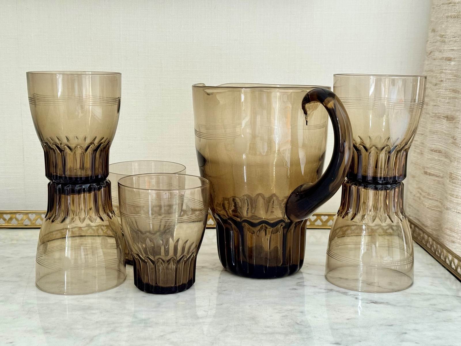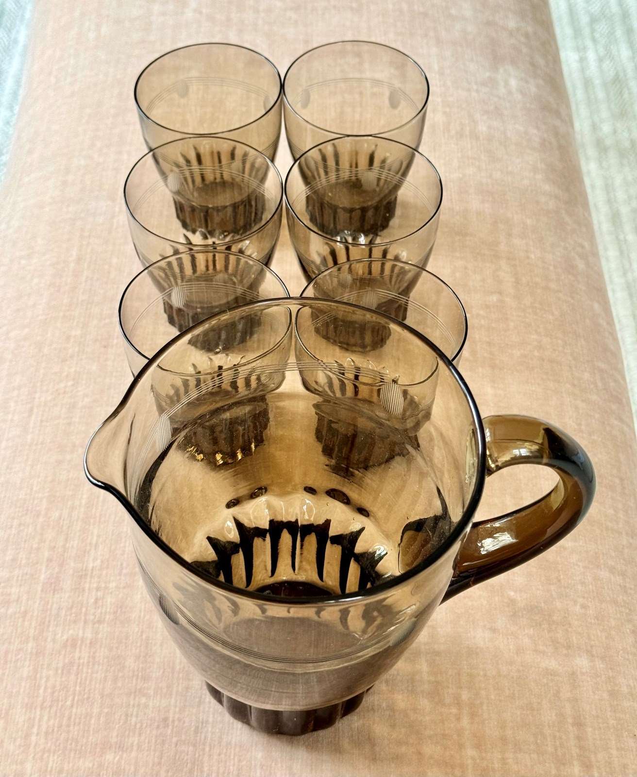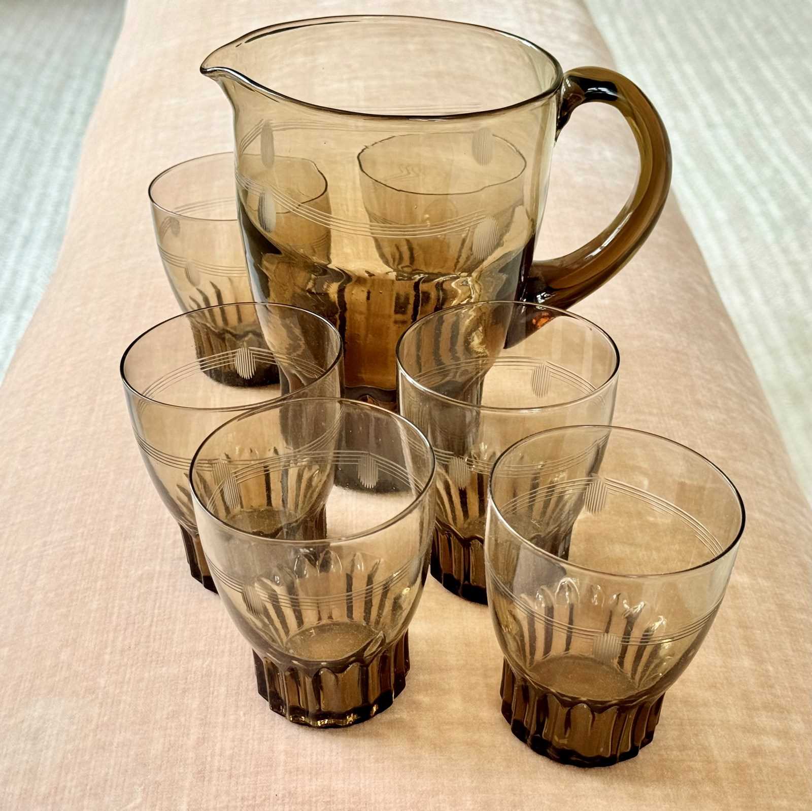 A wonderful Moser Art Deco design etched smoked glass lemonade or cocktail set comprising large jug with applied handle and six matching good sized tumblers. Each topaz coloured piece has been etched with bands and ovals and has ribbed waisted bases. Perfect for everything from water, to juice to cocktails, this versatile set of vintage barware is a chic addition to the home bar.