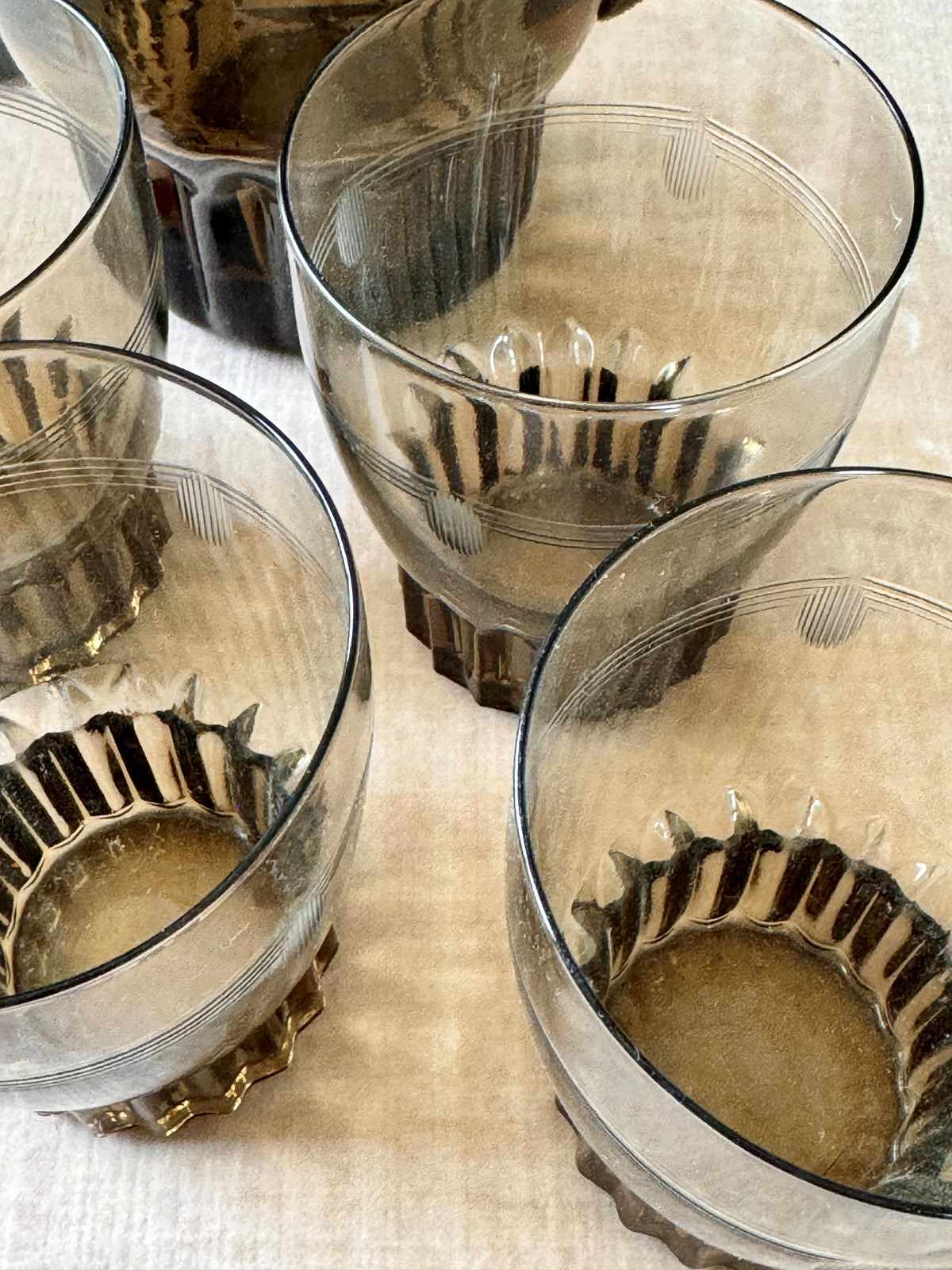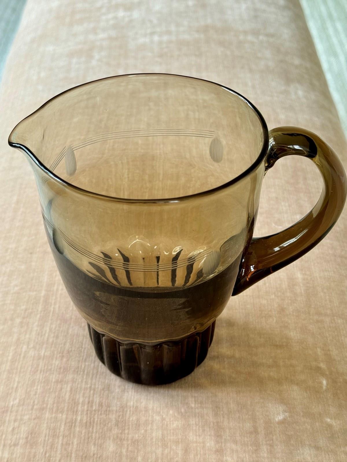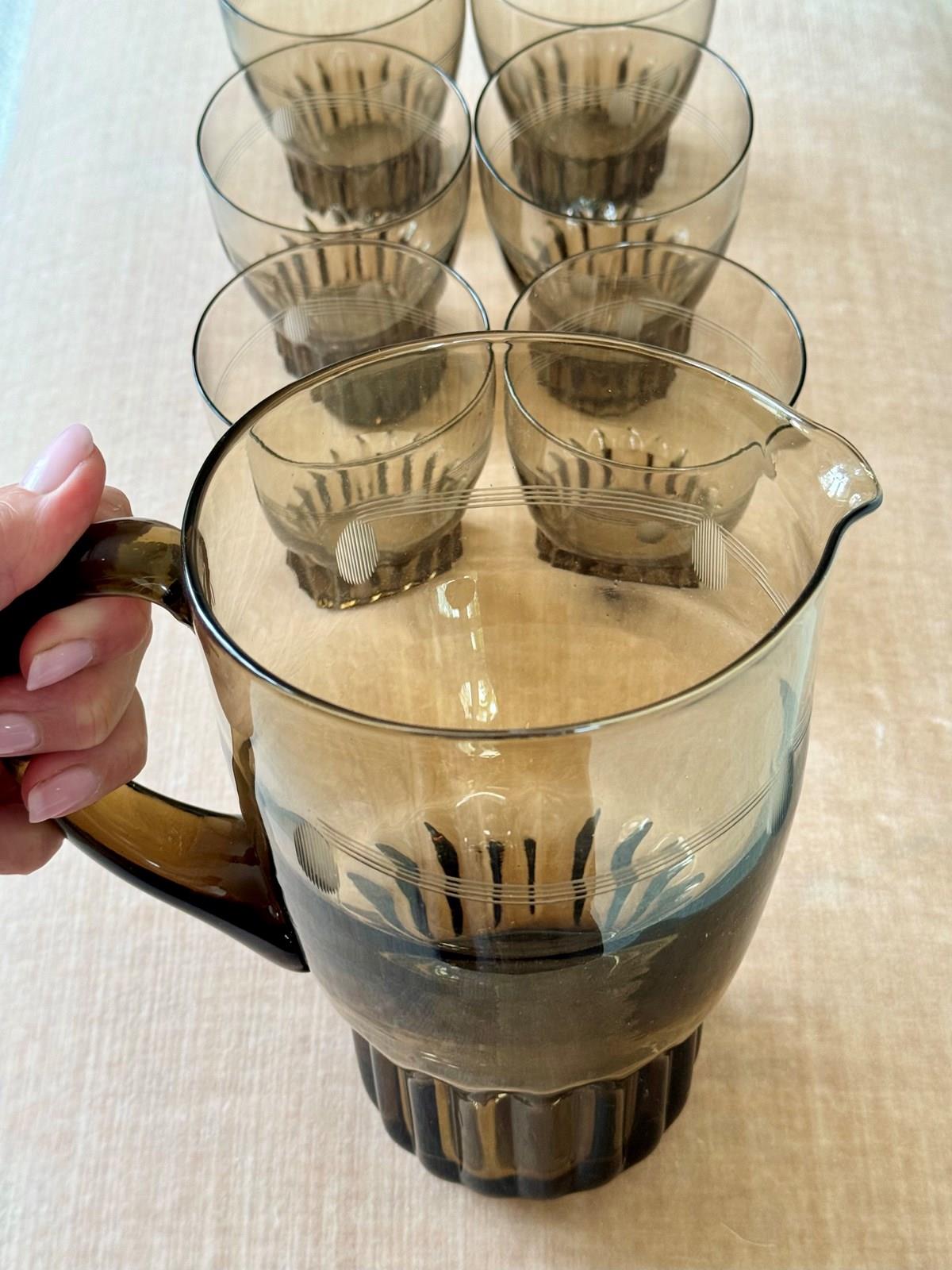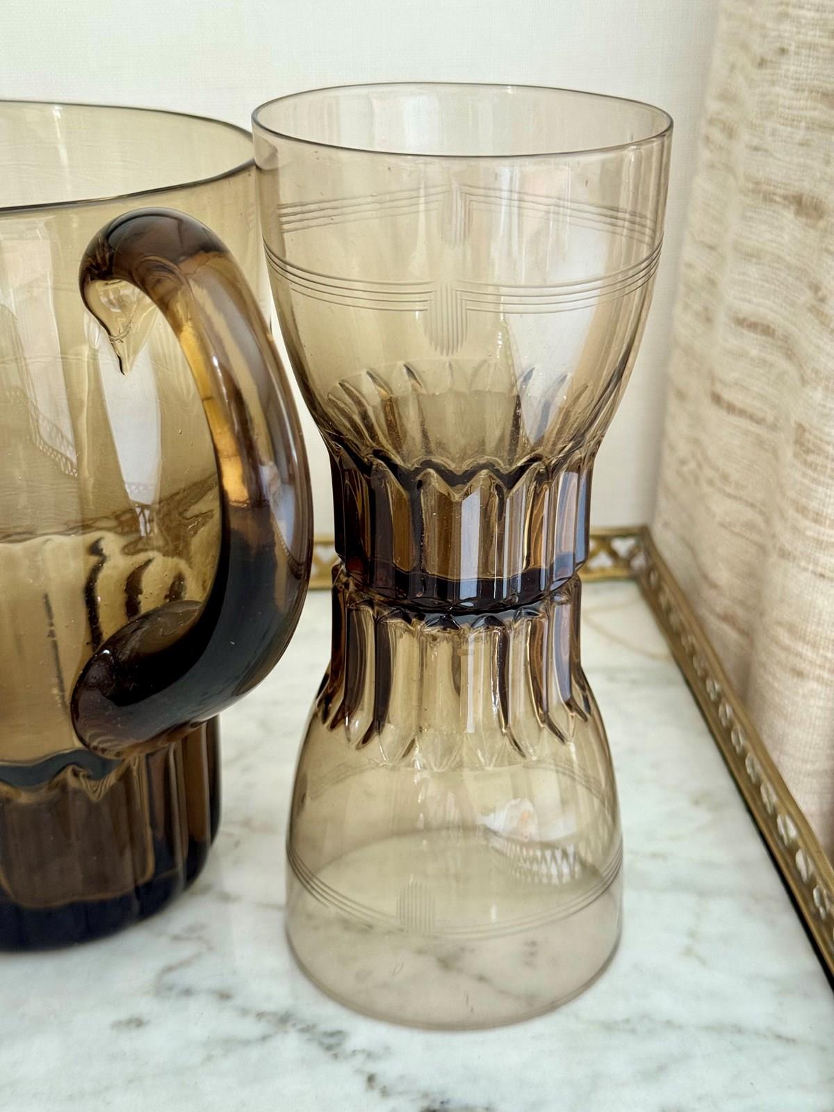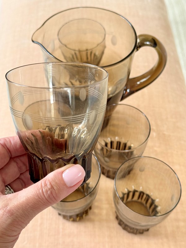 A wonderful Moser Art Deco design etched smoked glass lemonade or cocktail set comprising large jug with applied handle and six matching good sized tumblers. Each topaz coloured piece has been etched with bands and ovals and has ribbed waisted bases. Perfect for everything from water, to juice to cocktails, this versatile set of vintage barware is a chic addition to the home bar.