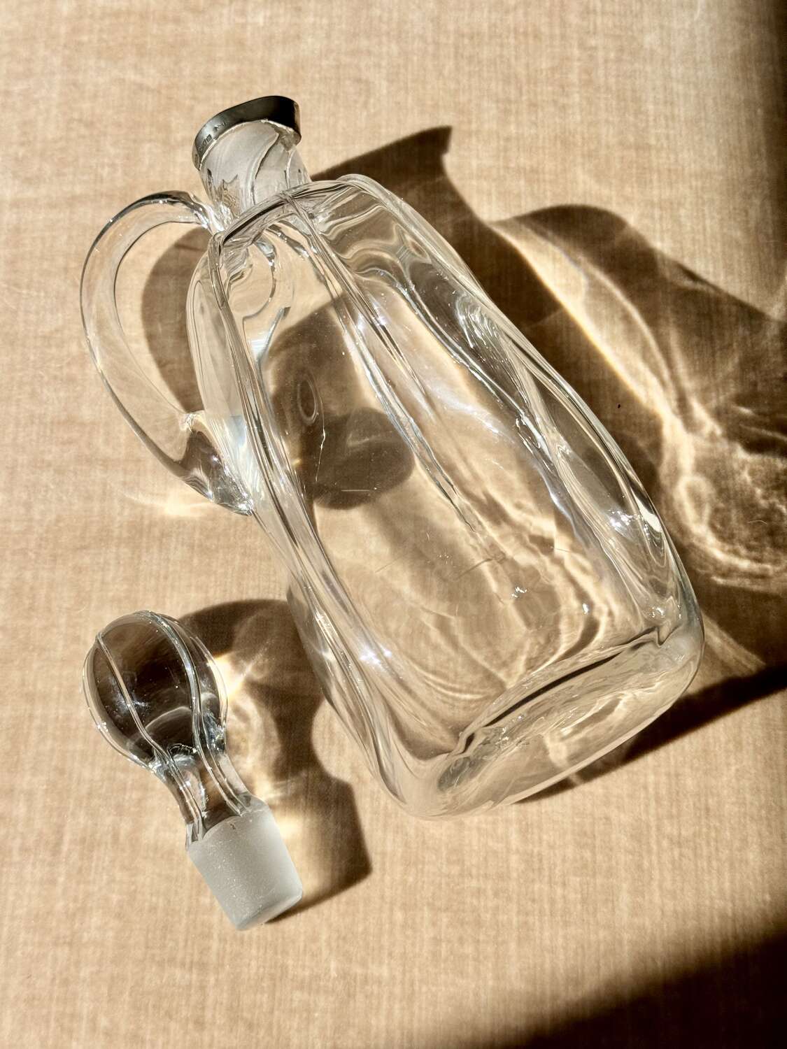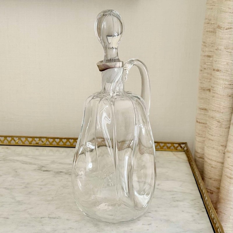 A beautiful free form Arts & Crafts hand blown glass claret jug decanter with applied handle and matching stopper, with hallmarks for Army & Navy Cooperative Society, London 1907. This unusual wine or spirit decanter has a trailed glass design and a dimpled glass base. A great example of turn of the Century Art Nouveau design.