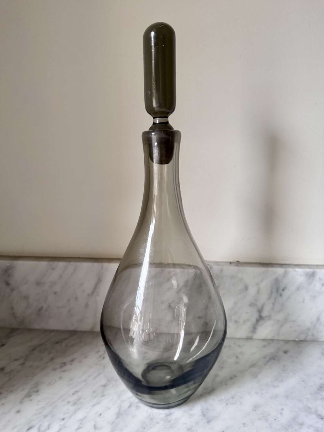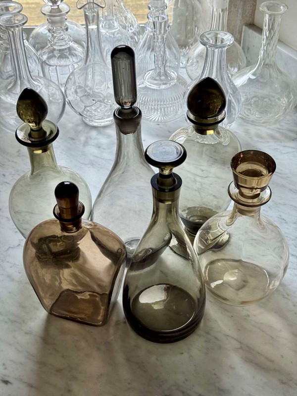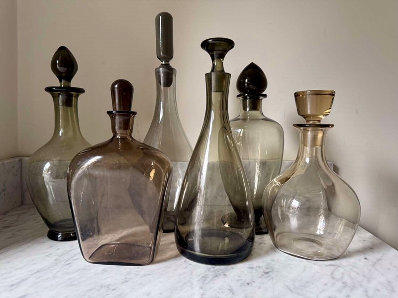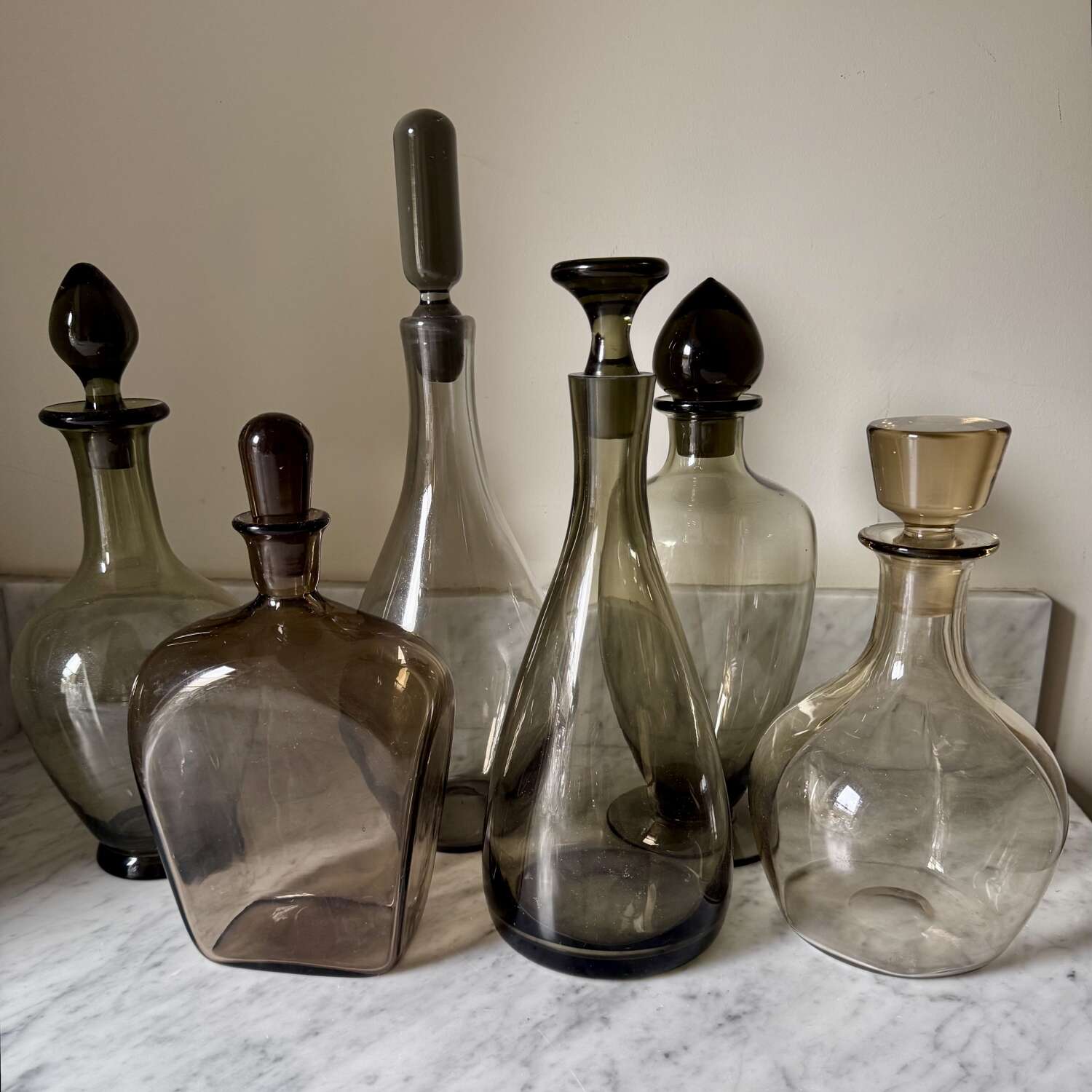 Cluster of Scandinavian Mid Century smoked glass decanters