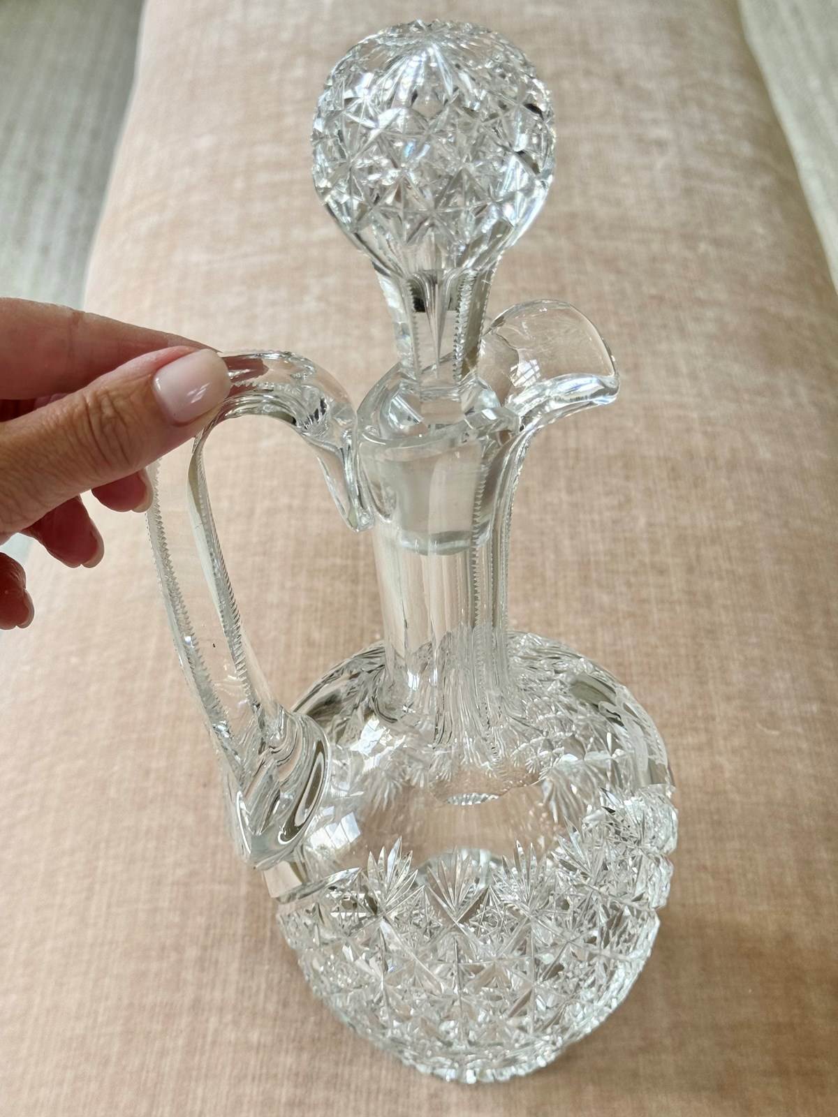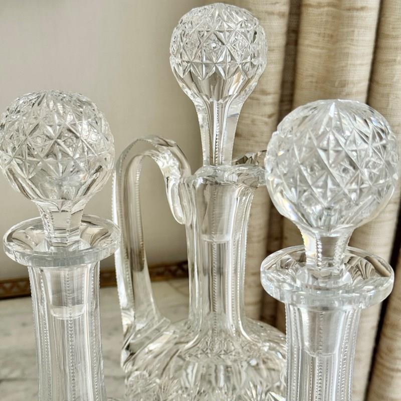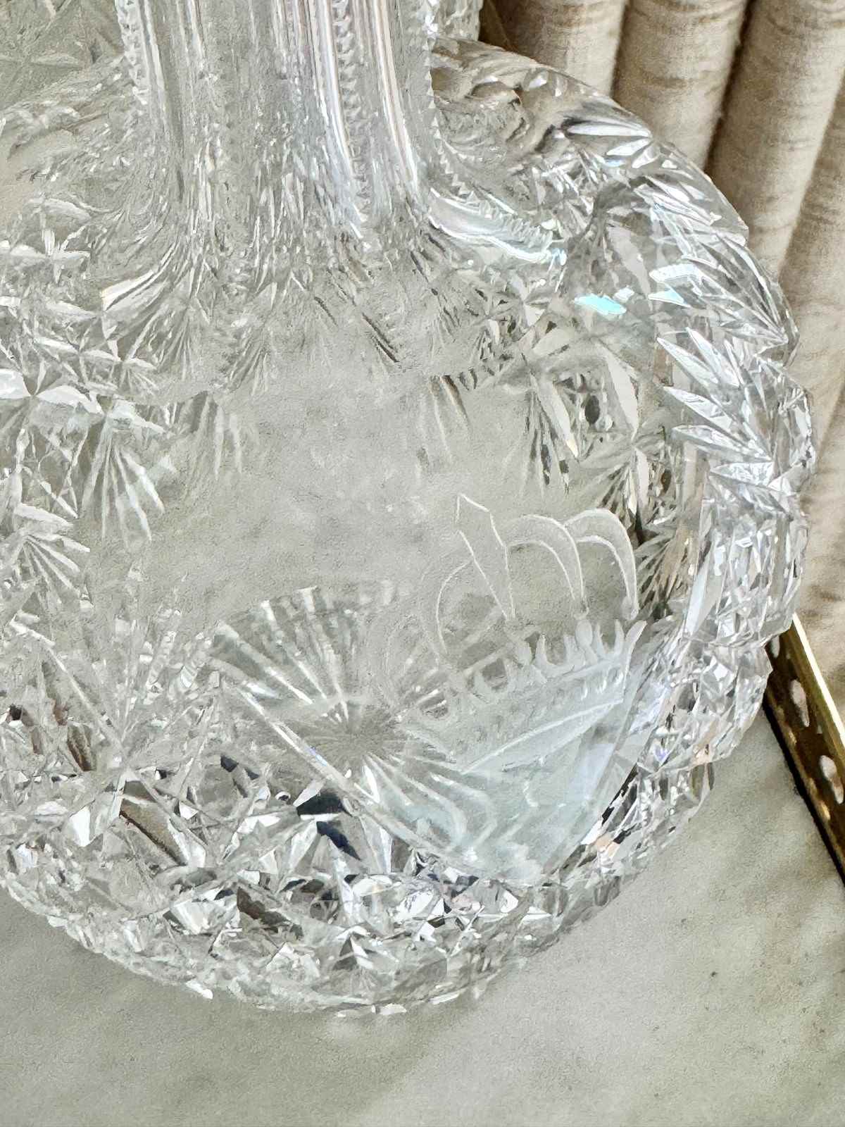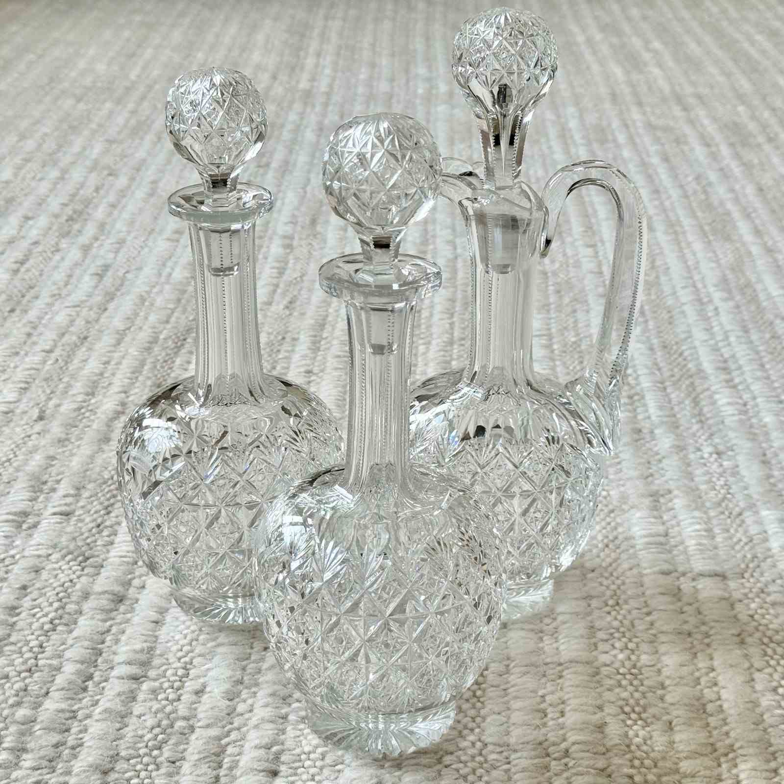 A superb trio of tall English cut crystal claret jug and wine decanters by Thomas Webb. Each exquisite decanter has been etched with a Royal crown. Excellent quality crystal each decanter has a beautifully handcrafted hollow stopper and star cut bases. The claret jug is especially grand with a hand applied handles and spout. The set is from an English Country House.