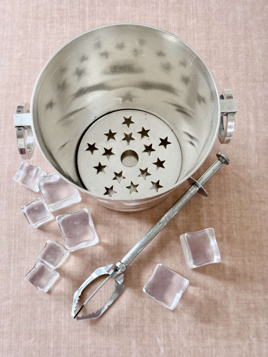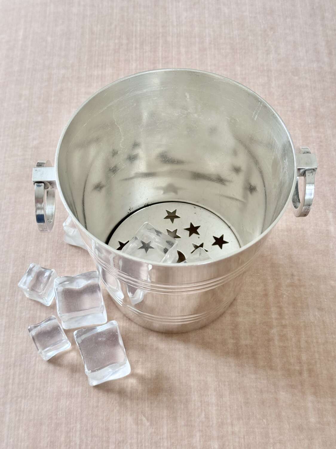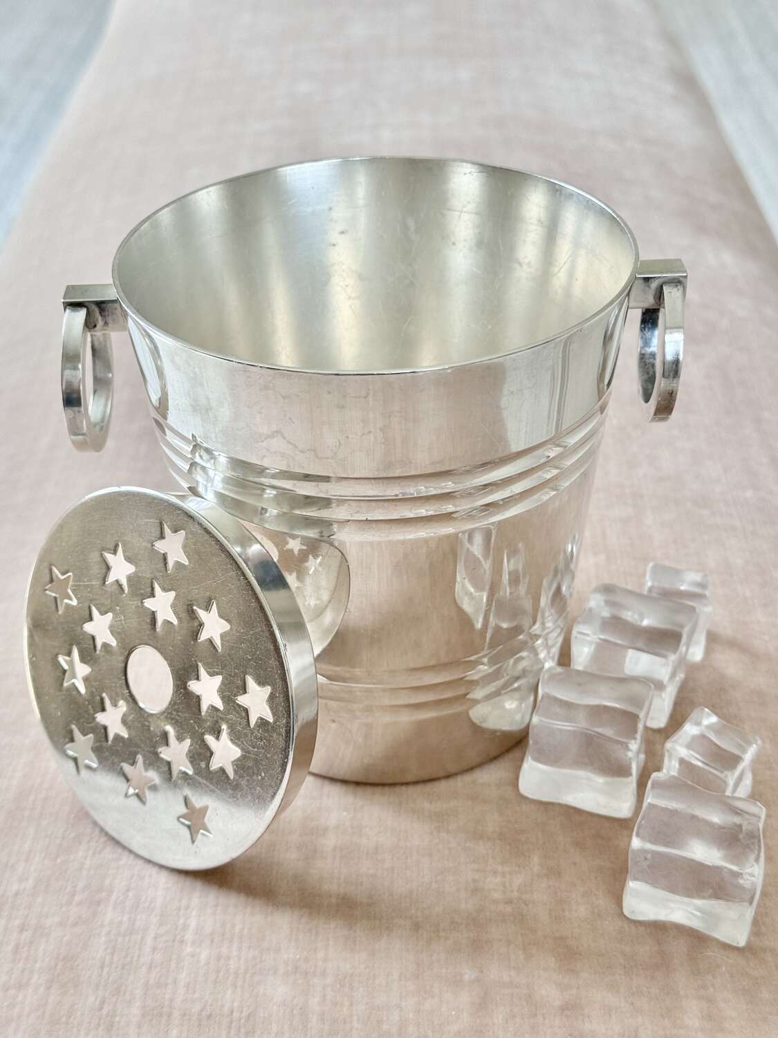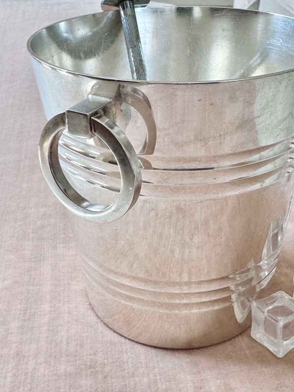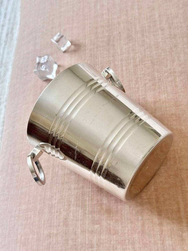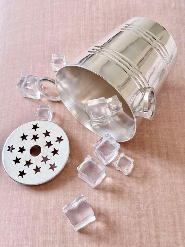 A particularly fine French silver plated ice bucket with twin ring pull handles and removable star cut out ice melt tray to the base, Circa 1940s, with makers mark for renowned French silversmith company St Medard.A fine quality vintage barware piece and a stylish way to serve ice.