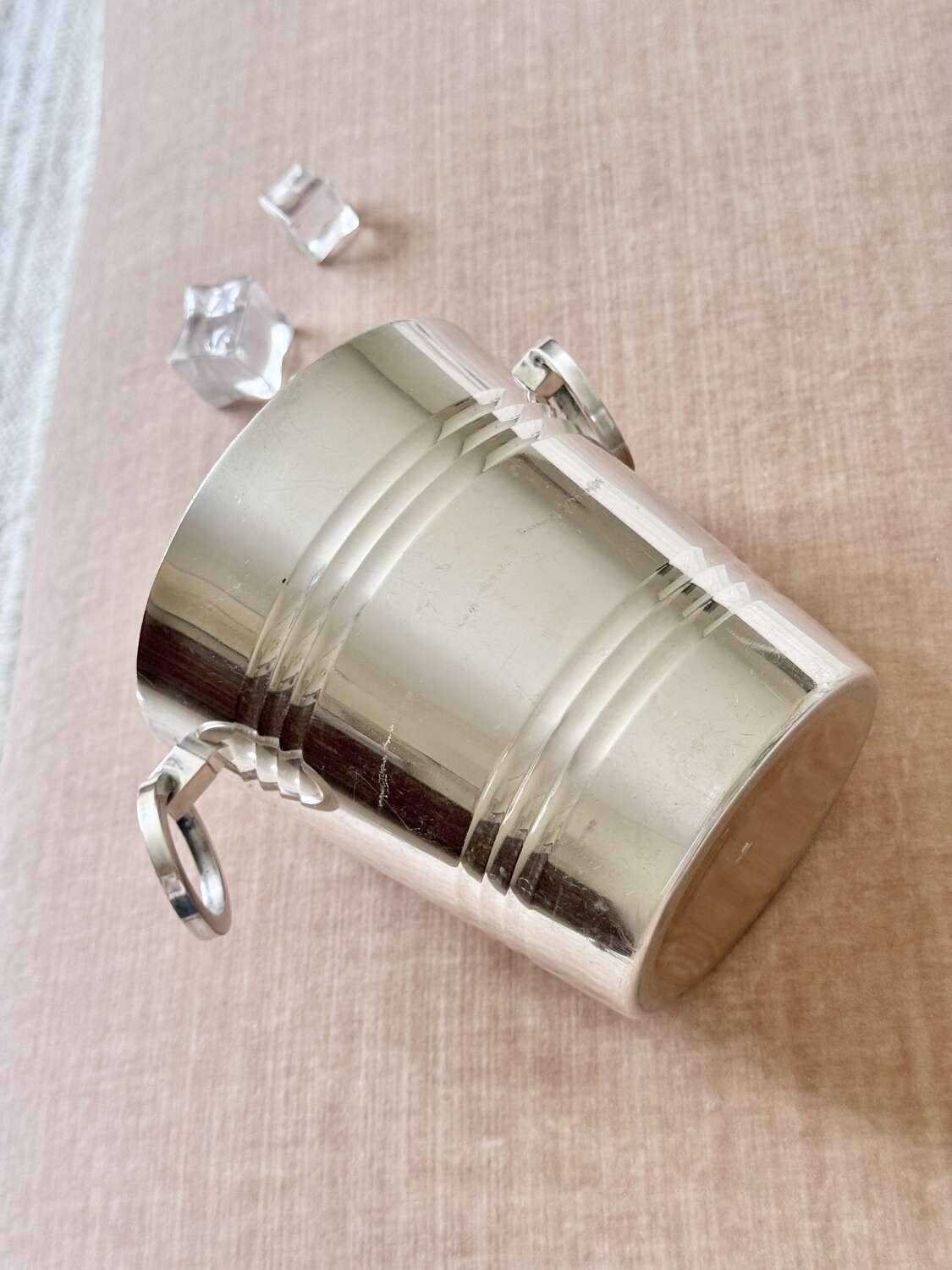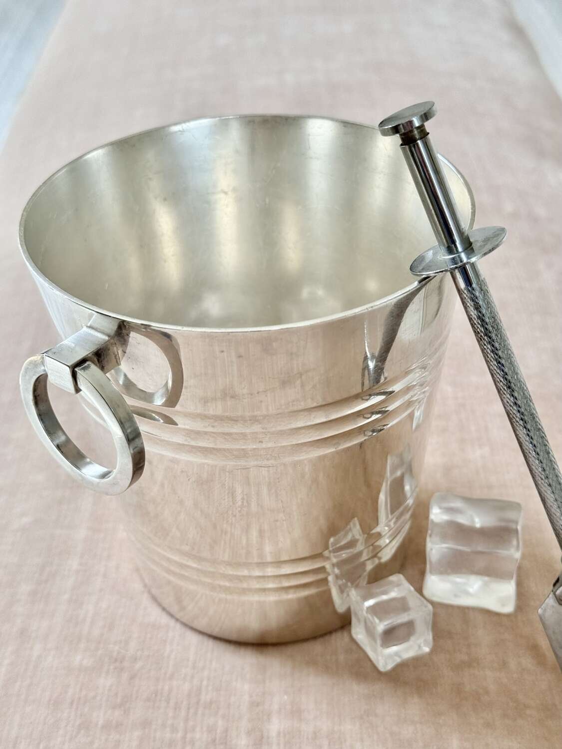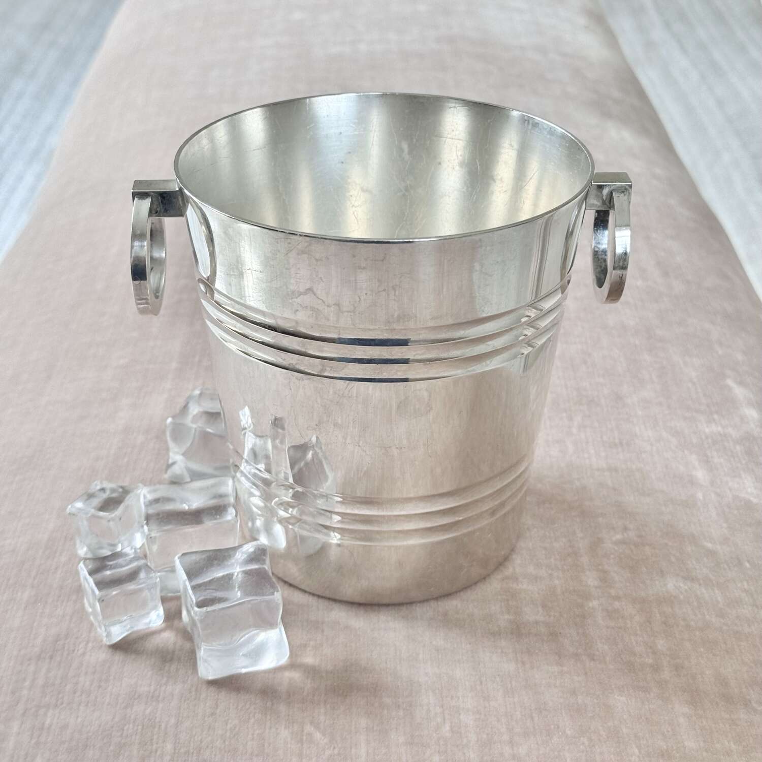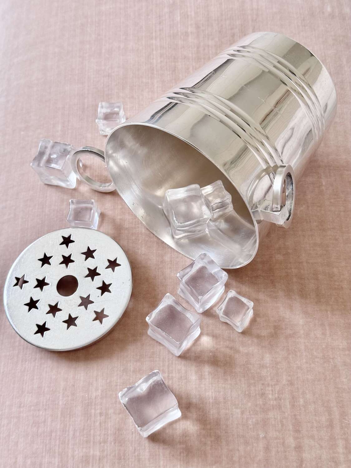 A particularly fine French silver plated ice bucket with twin ring pull handles and removable star cut out ice melt tray to the base, Circa 1940s, with makers mark for renowned French silversmith company St Medard.A fine quality vintage barware piece and a stylish way to serve ice.