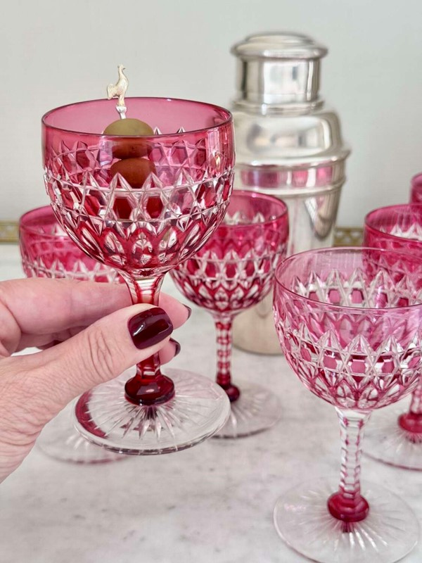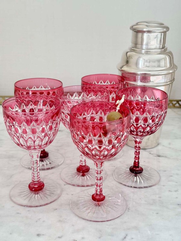 An exceptional quality set of mid 19th Century English cut to clear crystal glasses, attributed to Stevens & Williams, Stourbridge, Circa 1860. Expertly crafted crystal which has been cased in ruby coloured glass and the hand cut to clear in a hobnail and diamond pattern, with carved stems and star cut bases. These glasses each hold a max of 125ml and would work brilliantly for short cocktails such as Martinis or as Port/Sherry/pudding wine. These are particularly rare and in perfect condition.