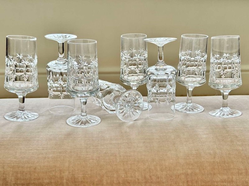 An excellent and smart set of 14 vintage English star cut crystal short stem flutesby Webb crystal, Circa 1960s. Wonderfully of their time in terms of design, the original paperwork shows that they were purchased as part of a suite of glasses in 1969. With tapered flute bowls which has been star and lens cut, short stems and a star cut base. Max capacity 175 ml.Sold astwo sets of 6 and 8 glasses (£175and £245)