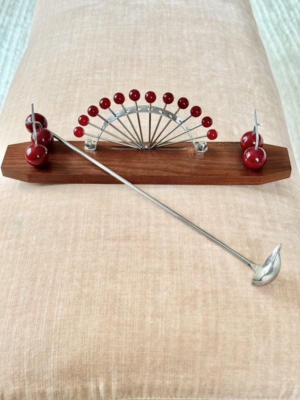 A splendid French Art Deco bakelite and chrome cocktail stick and matching ladle stand made from Macassar wood, Circa 1940s. Wonderfully eccentric, this is a striking piece of vintage barware which would look exceedingly smart in any home bar display. Comprising 12 cherry finial cocktail sticks and a long handle cocktail serving ladle all stored on two pairs of cherrys.