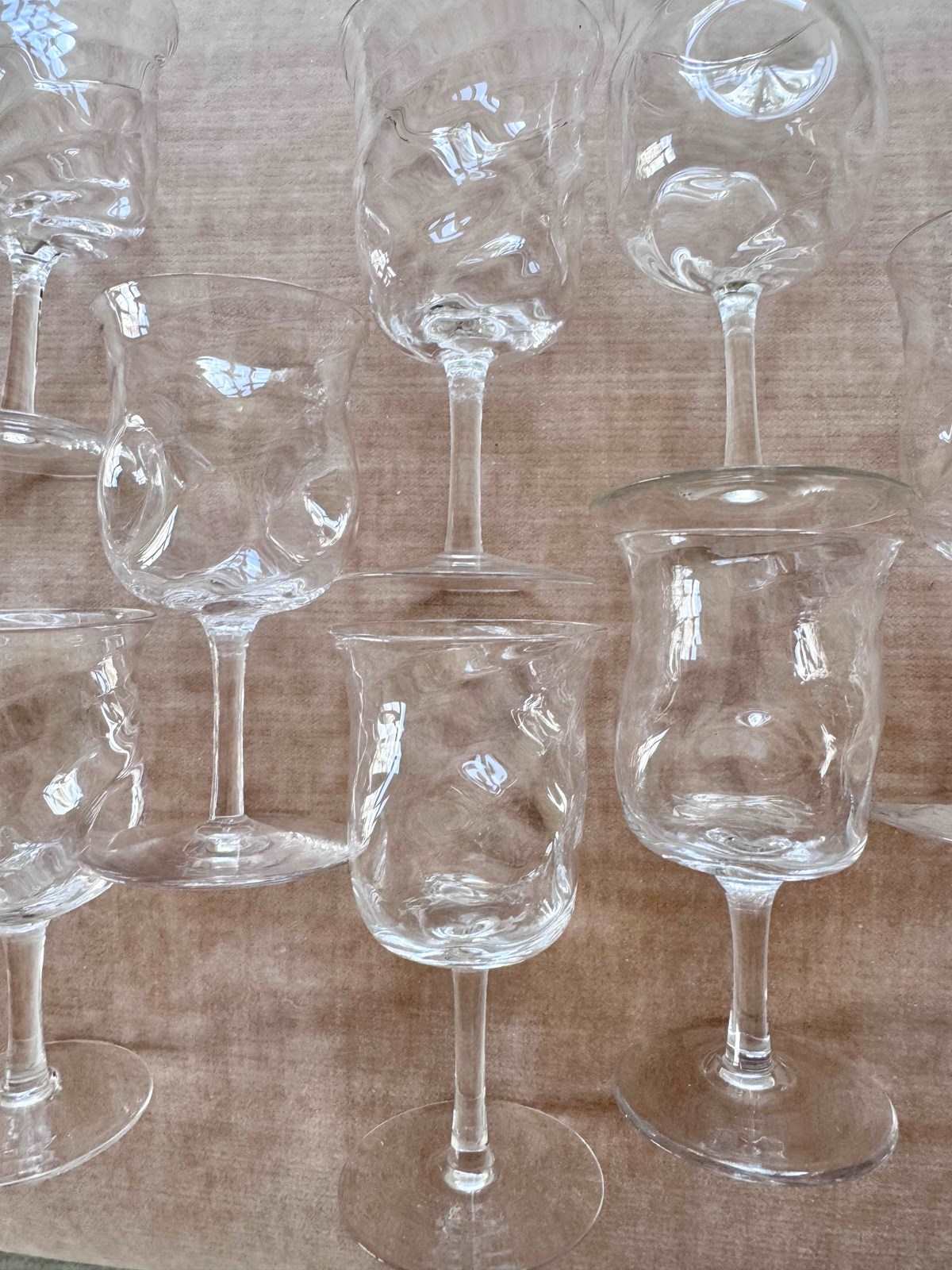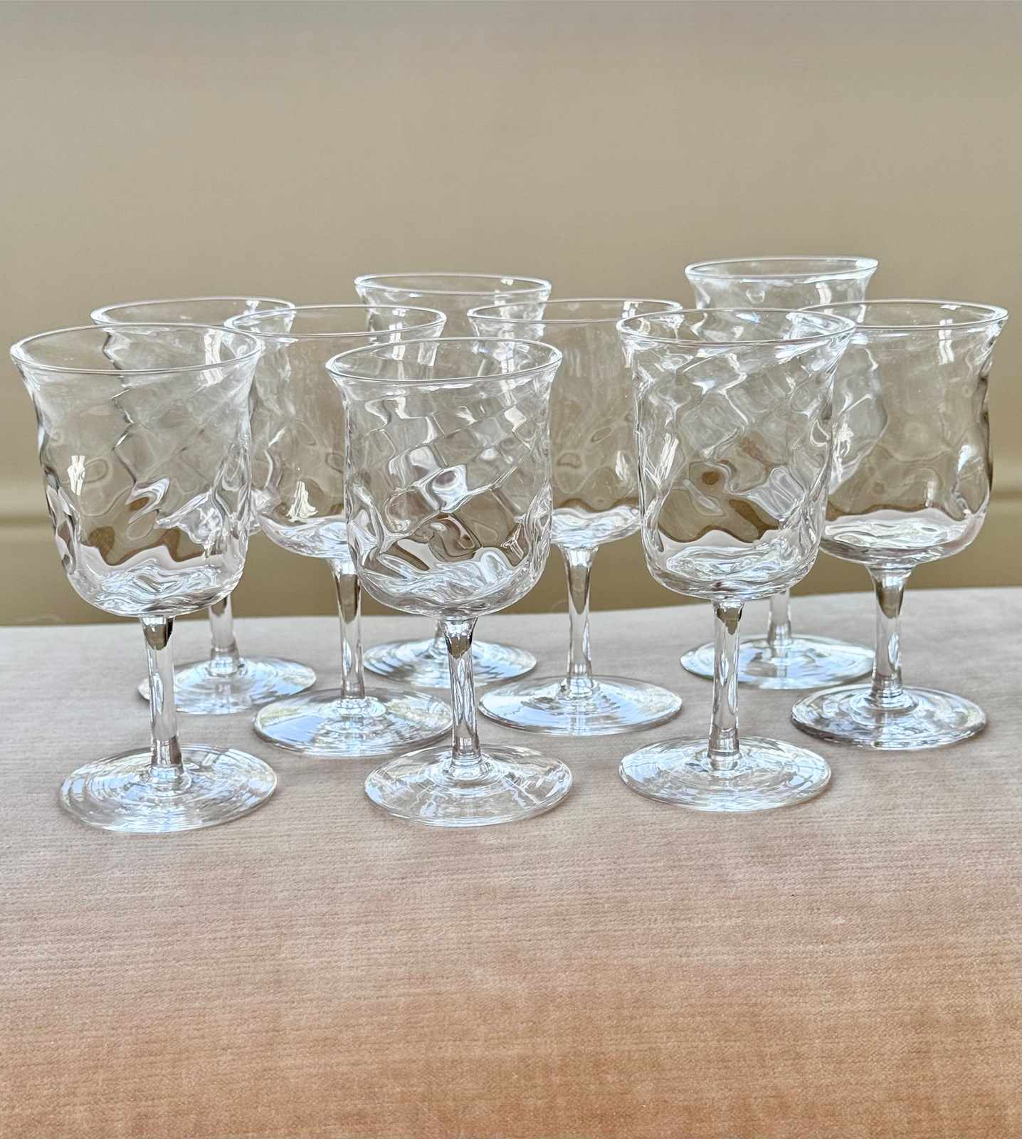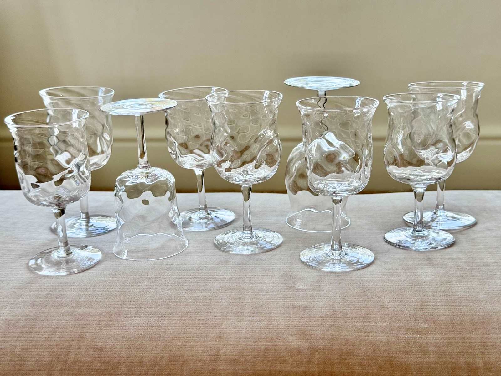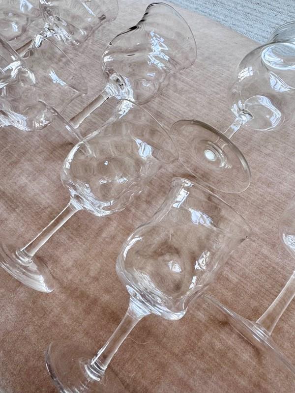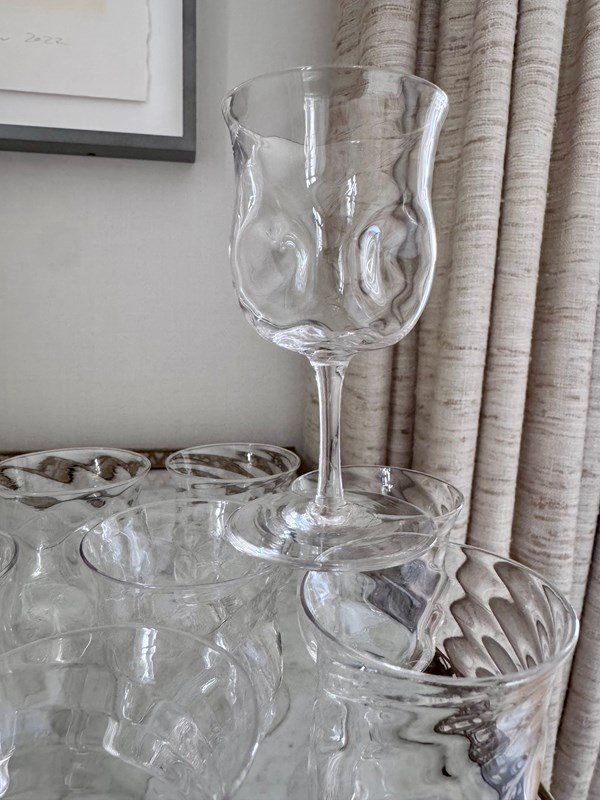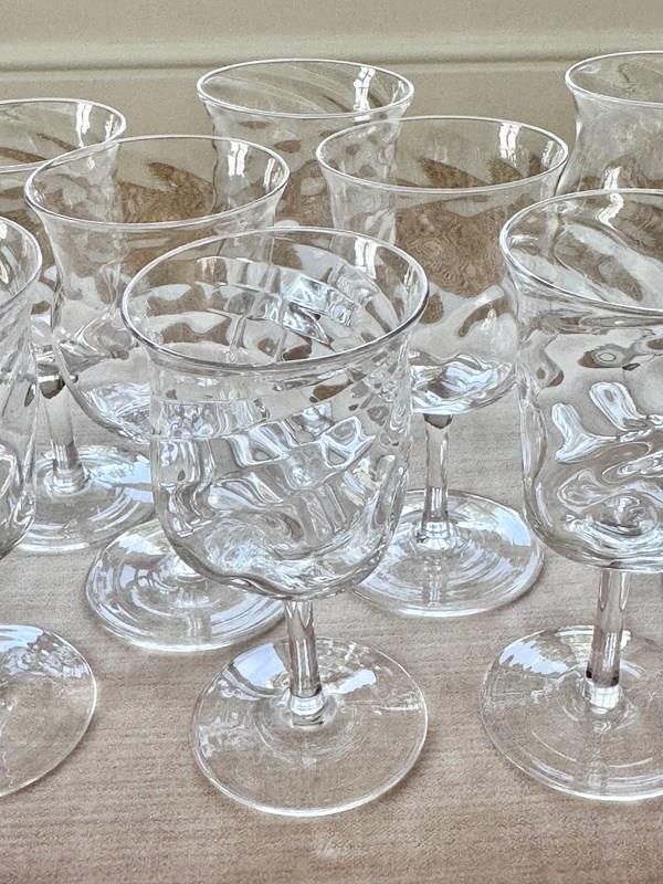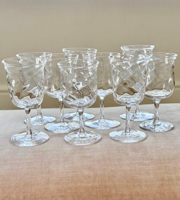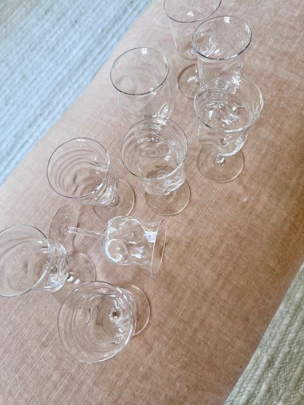 A pretty set of nine skillfully hand crafted, Art Nouveau English aperitif glasses by James Powell & Sons for Whitefriars, with flared rim, wrythen and dimpled glass bowls, Circa 1880. Max capacity approx 90ml (each glass is hand made so varies a little). These unusual glasses would work well for short cocktails.