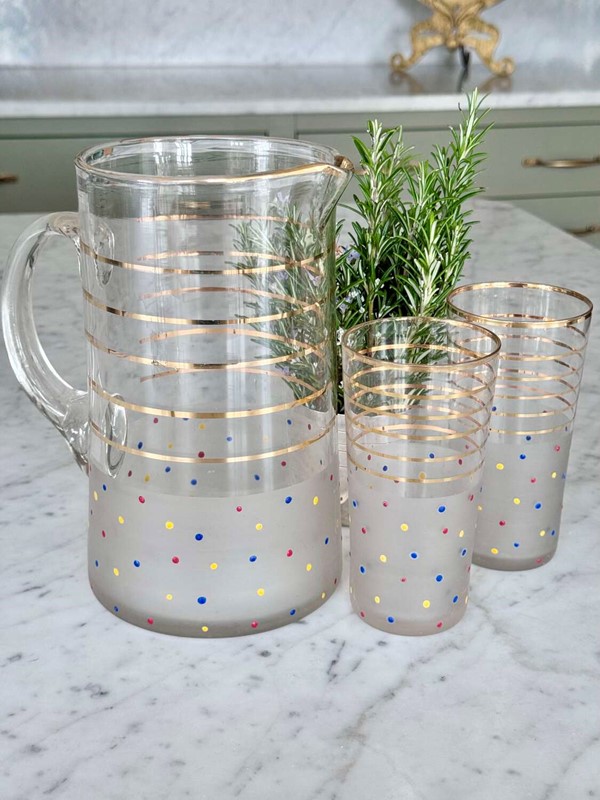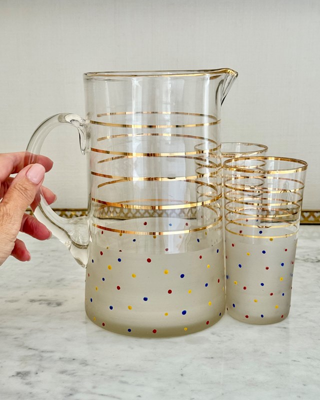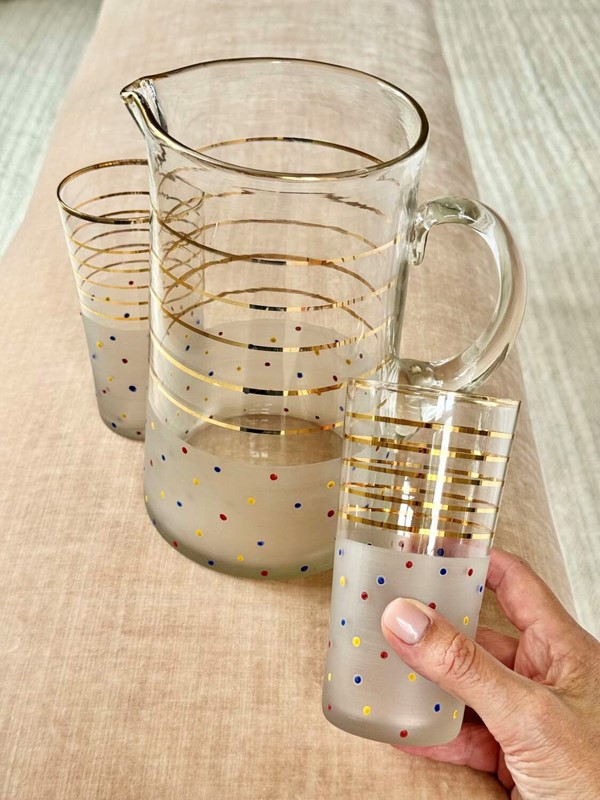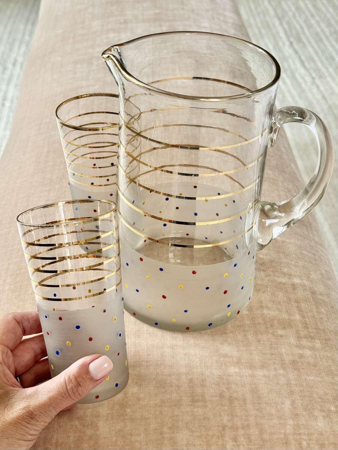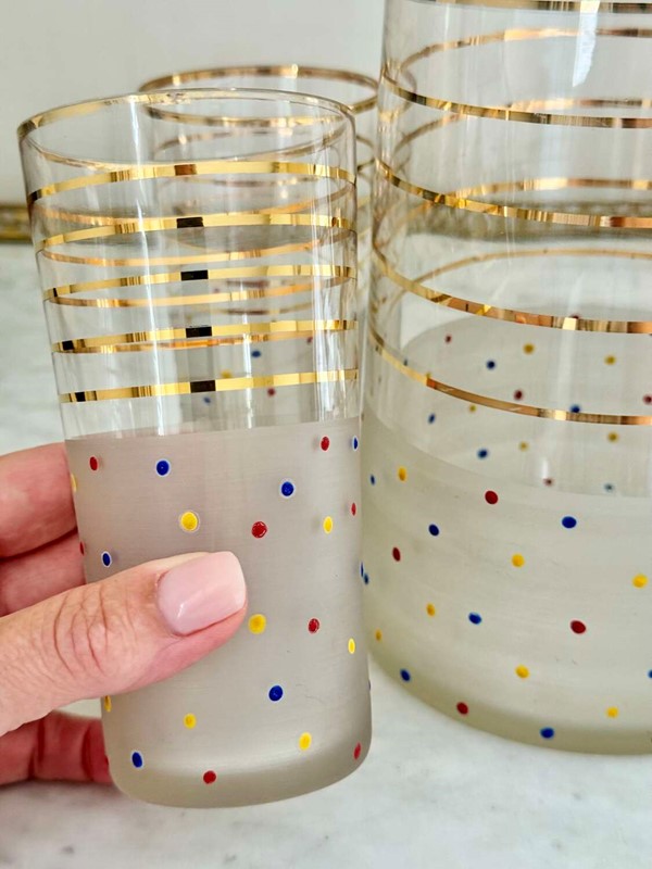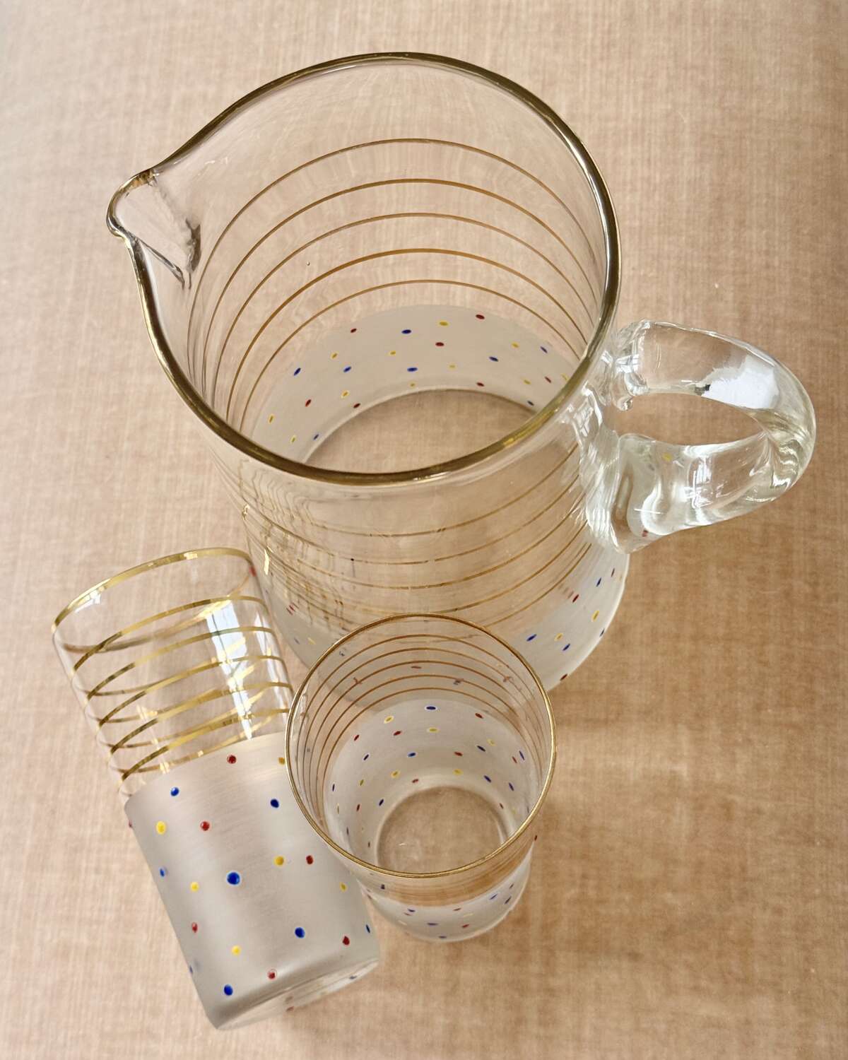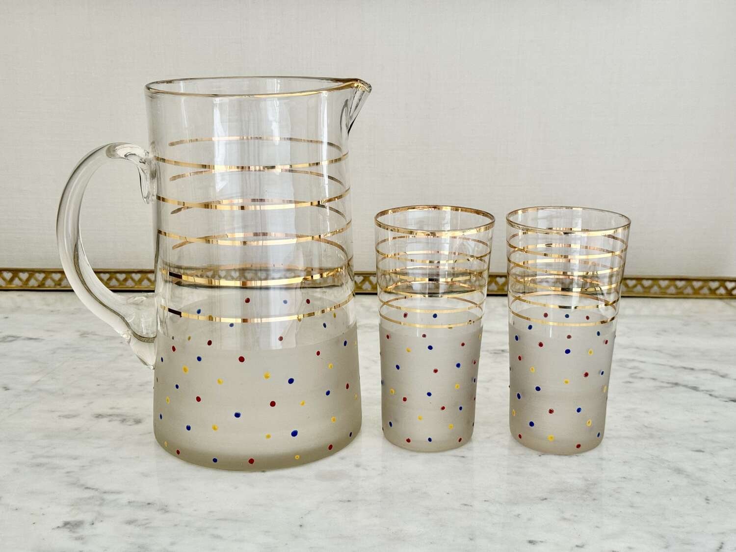 An unusual, large scale vintage glass jug & tumblers set, Circa 1950, with gold rings and yellow, red and blue enamel polka dots, hand applied glass handles and polished pontil base. Versatile, this splendid pitcher & glasses can be used regularly for everything from water to cocktails.