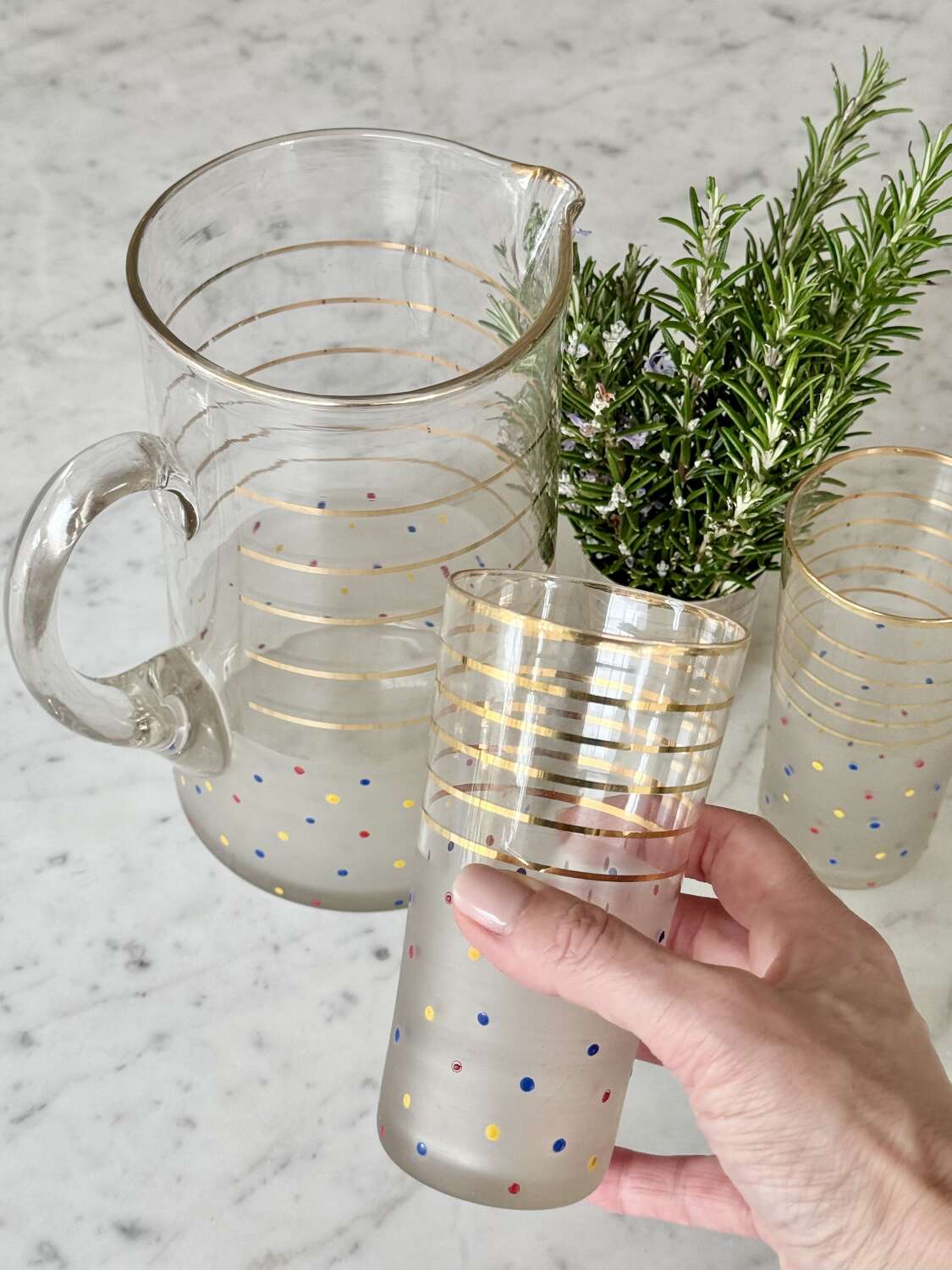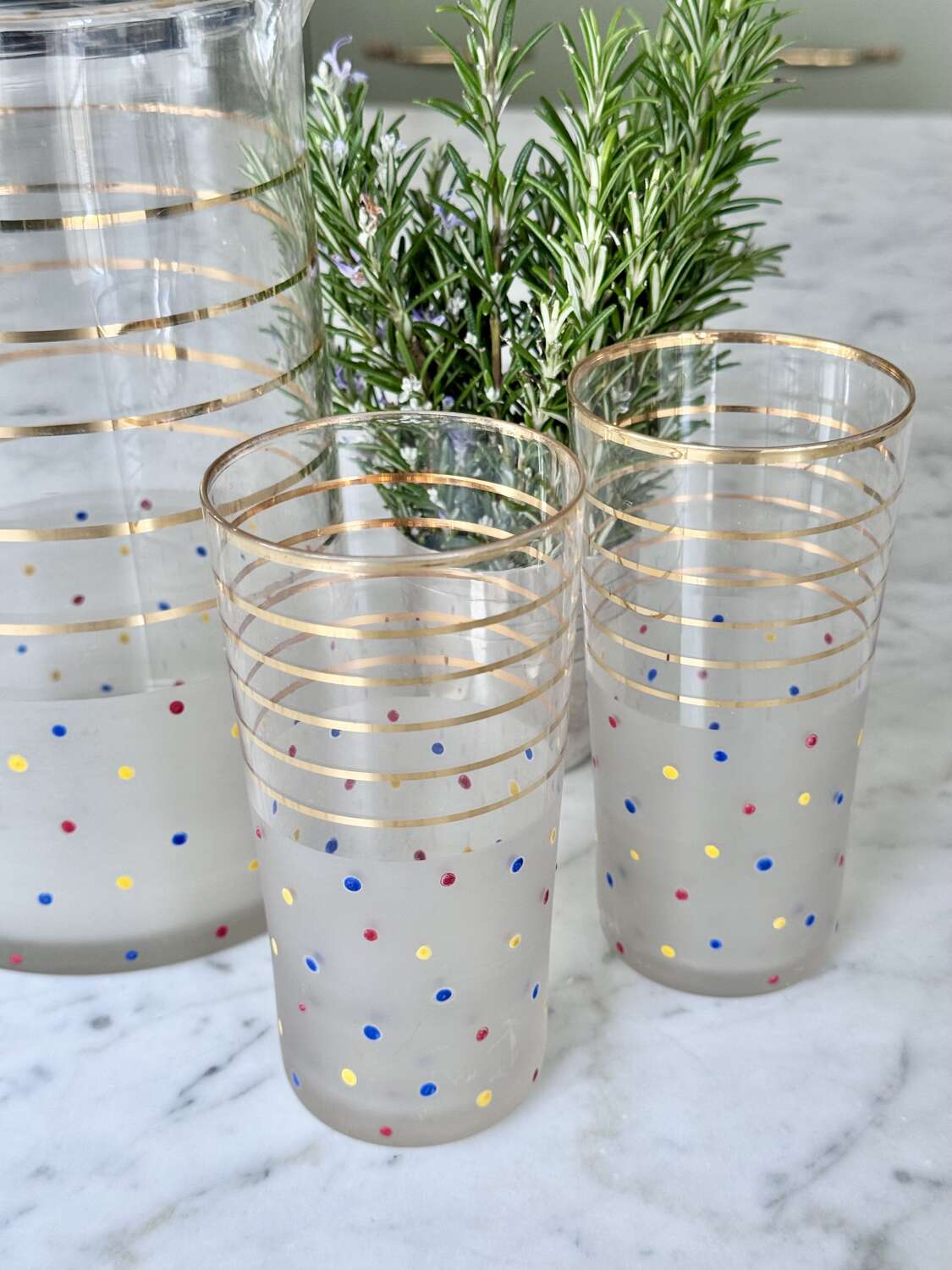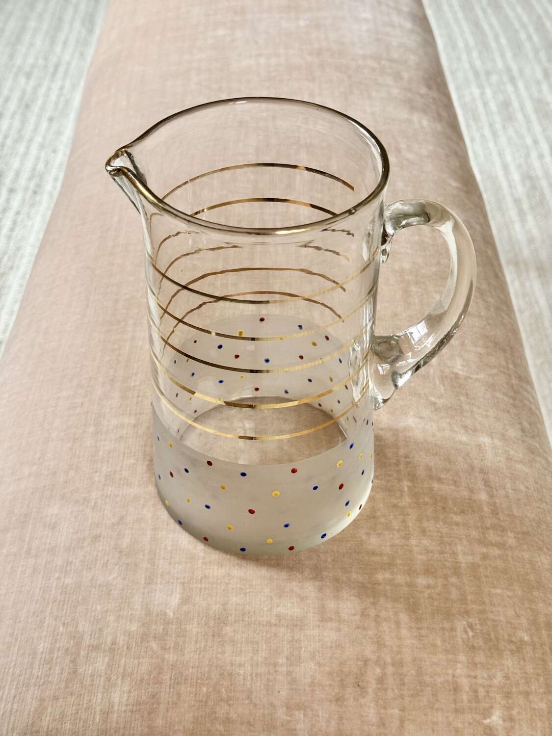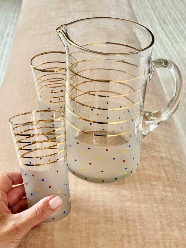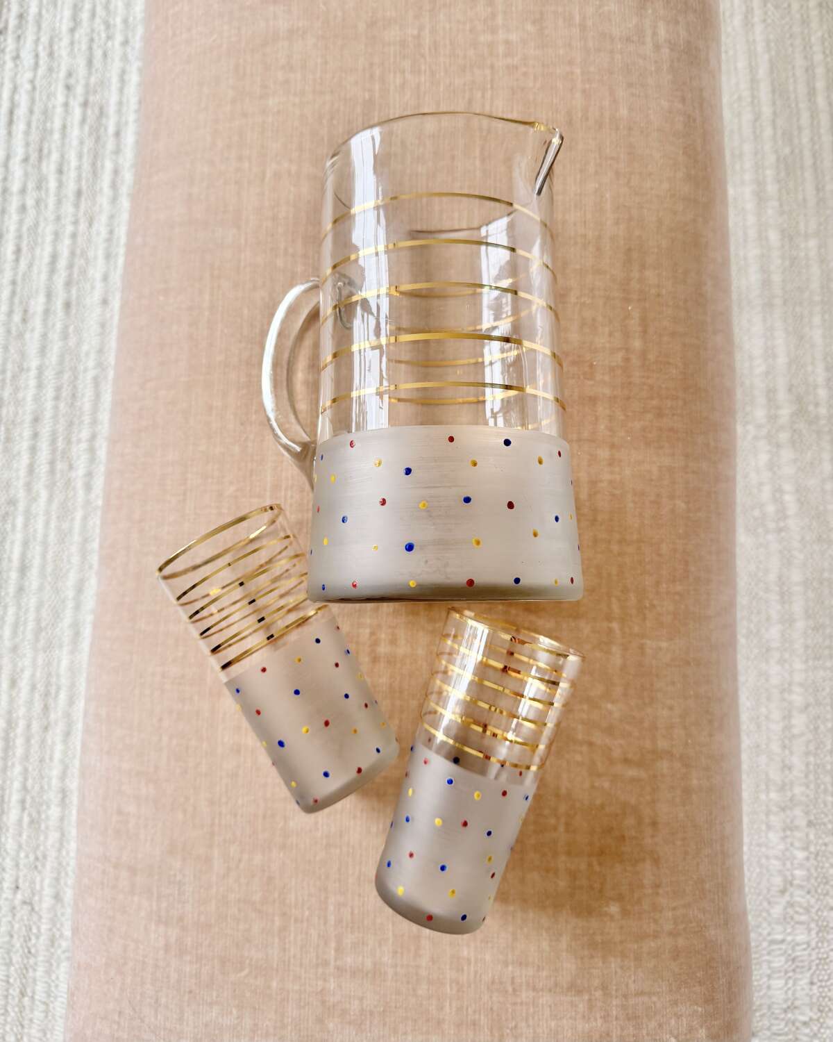 An unusual, large scale vintage glass jug & tumblers set, Circa 1950, with gold rings and yellow, red and blue enamel polka dots, hand applied glass handles and polished pontil base. Versatile, this splendid pitcher & glasses can be used regularly for everything from water to cocktails.