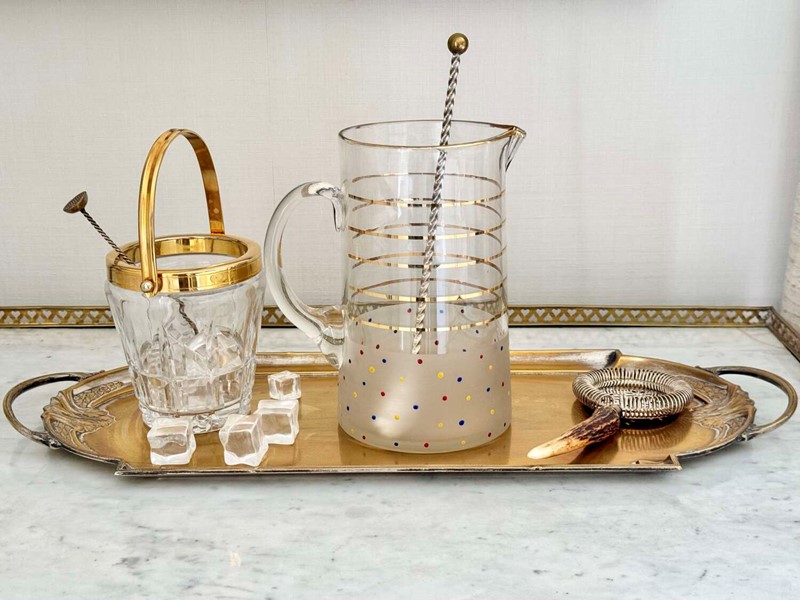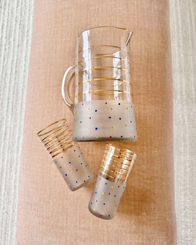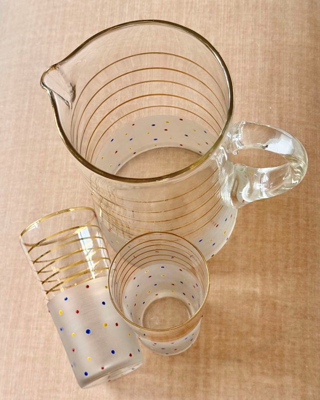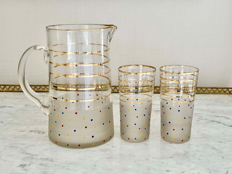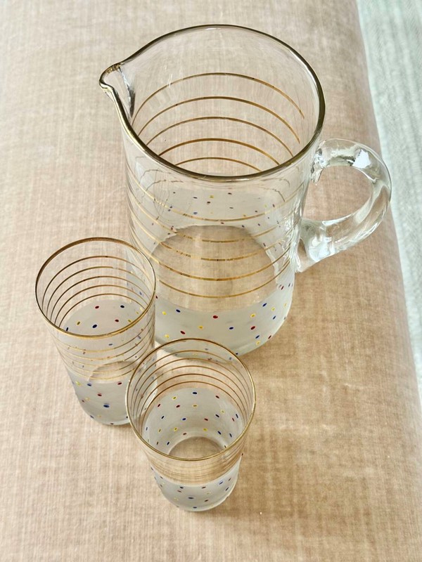 Large polka dot & gold enamelled glass jug & tumblers C1950