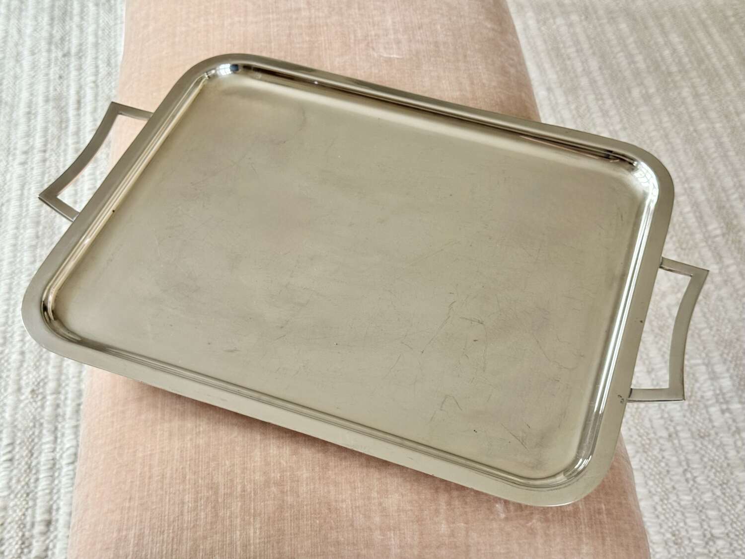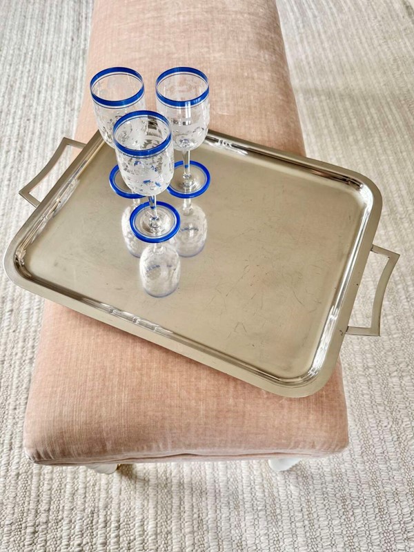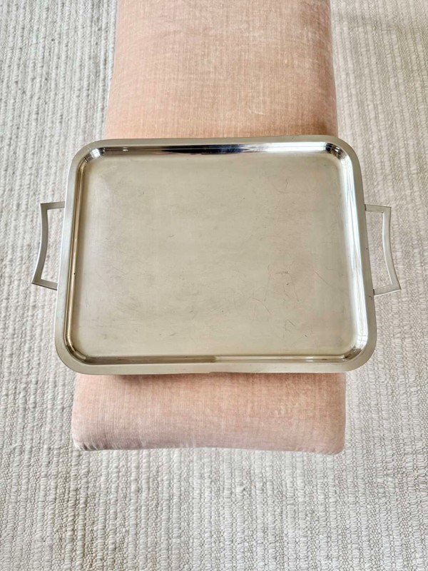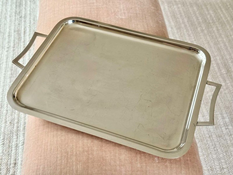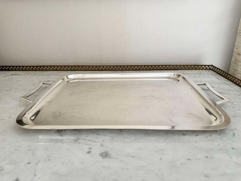 A nice quality large silver plated twin handled drinks serving tray, Circa 1960, with makers mark for Viners, France. Unusually, this renowned English silver brand branched out to France during the 1960s and for a short time, these pieces bore the makers mark based in France rather than England. Modernist in design, this simple tray would work well in any home setting.
