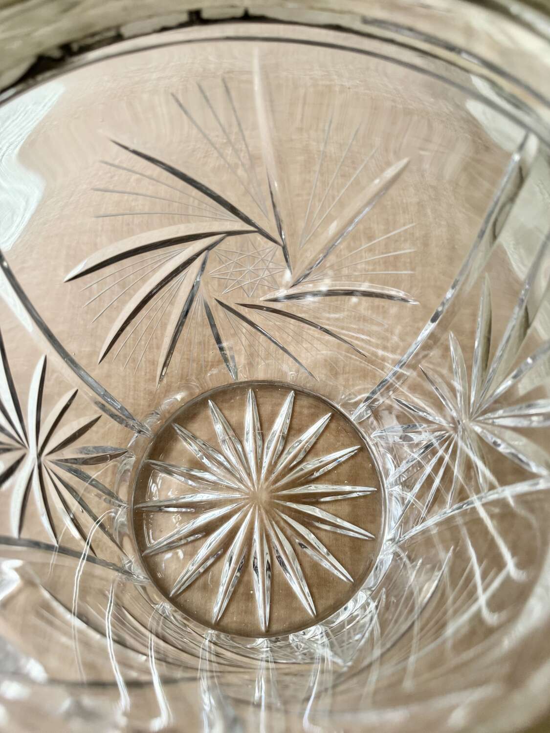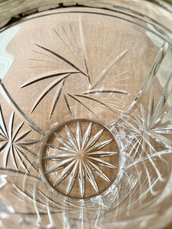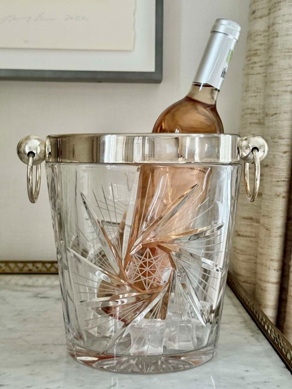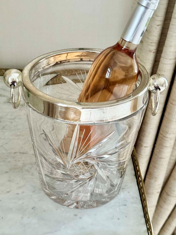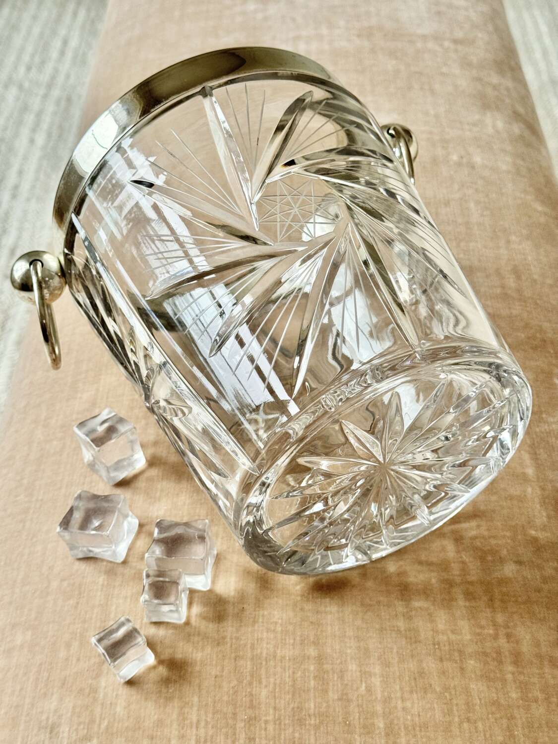 A fabulous, Mid 20th Century French, large scale, star cut glass champagne wine bucket or cooler, with spiralling stars and chrome rim wtih twin ring handles. This splendid piece of vintage barware is bonkers heavy (3.9kg) and would look sparkling in a home bar setting.