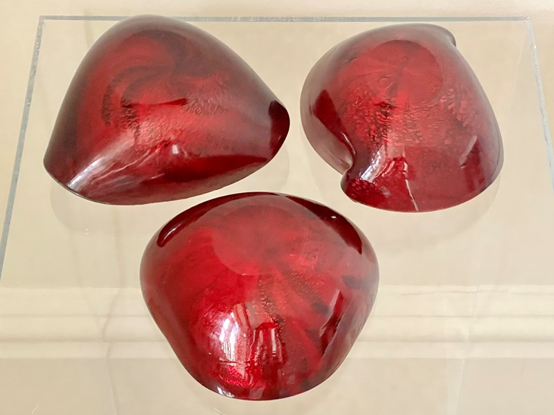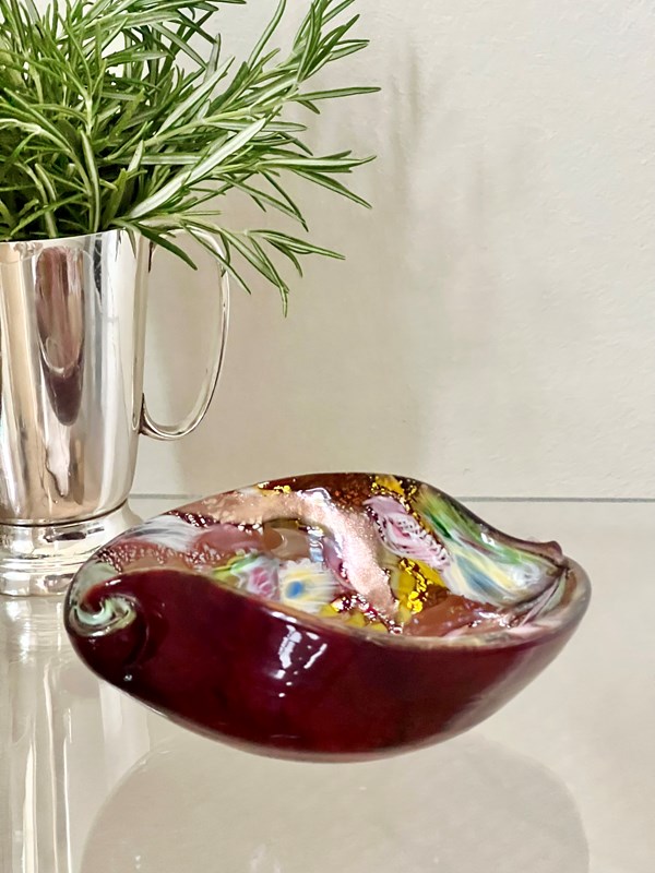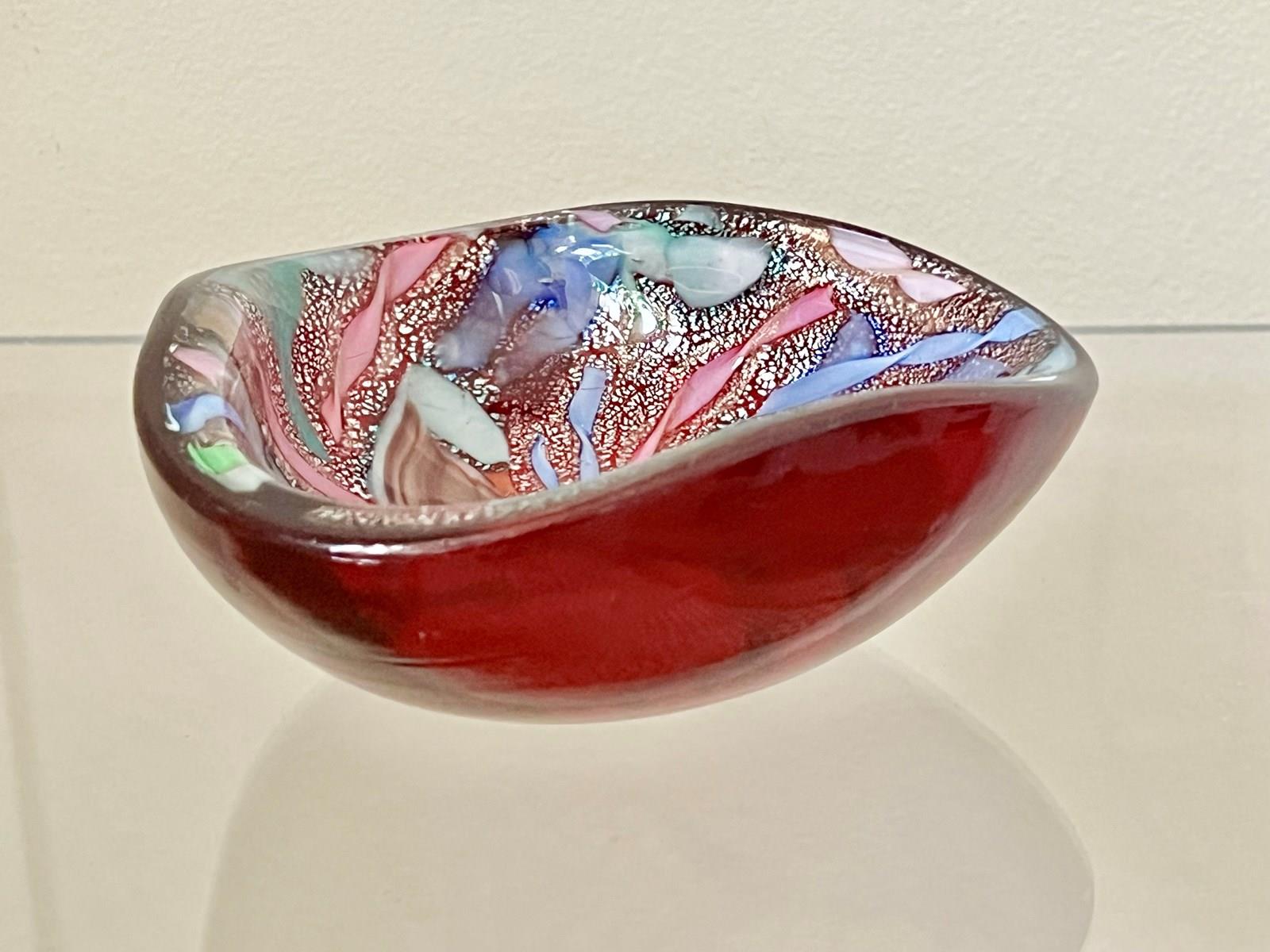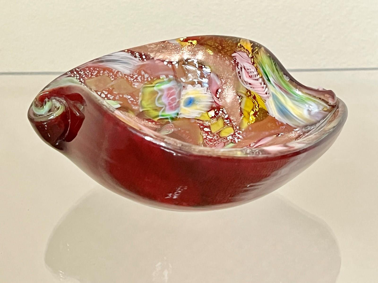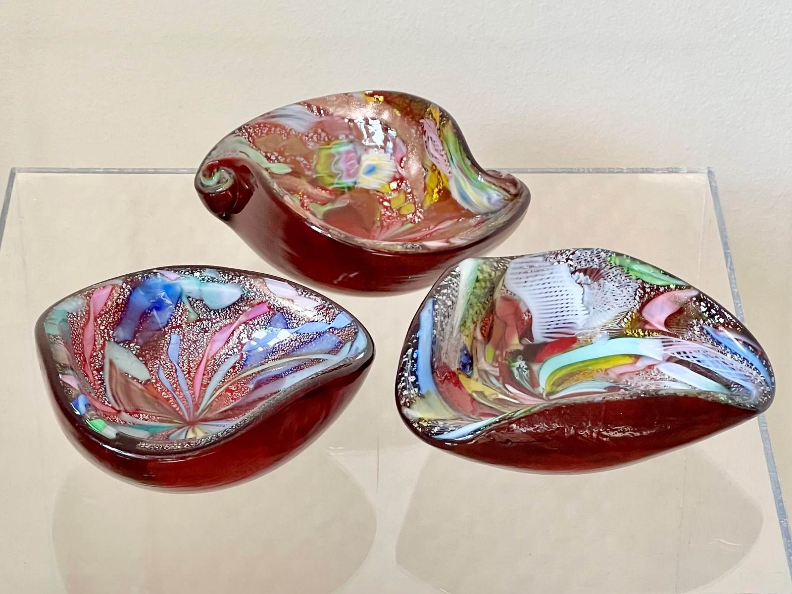 Three fabulous Mid 20th Century Murano hand wrought glass bowls by AVEM in their Tutti Fruitti Bizantino design with red outer glass casing, Circa 1950/60s. Gorgeous Italian glass from the Venetian island of Murano, these old ashtrays make perfect accent pieces in a tablescape display. Hand crafted using silver leaf, patches of copper aventurine, zanfirico lattice filigree, twisted ribbon canes, and multicoloured murrines all cased in ruby coloured glass.