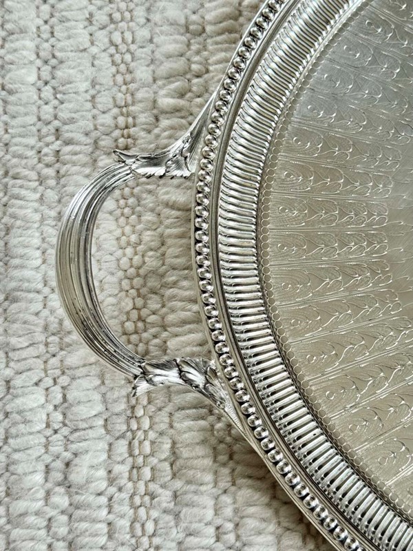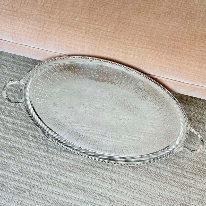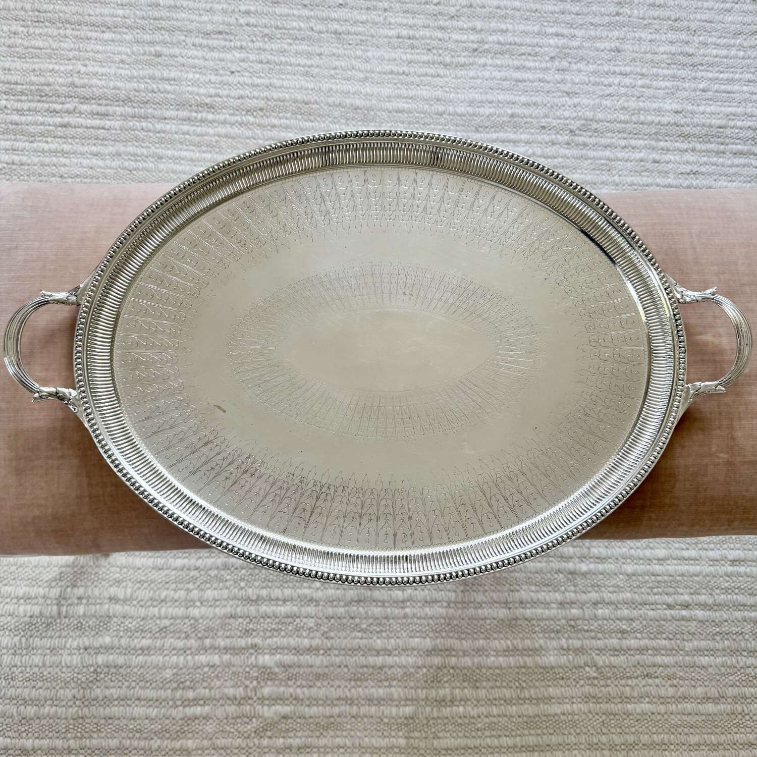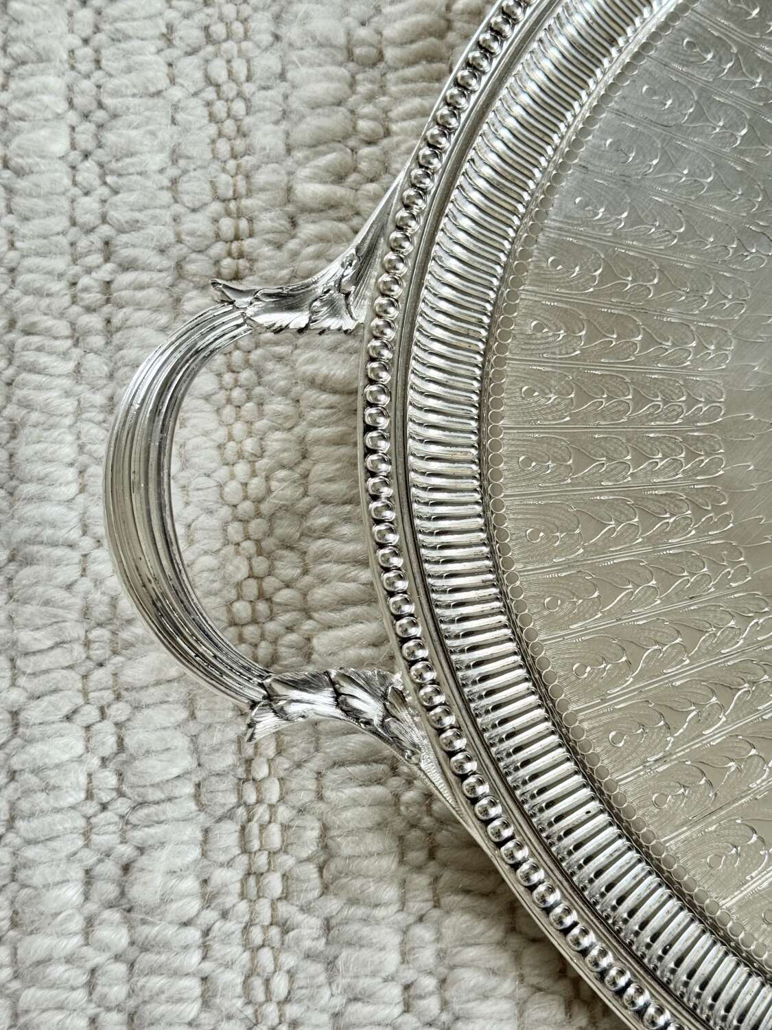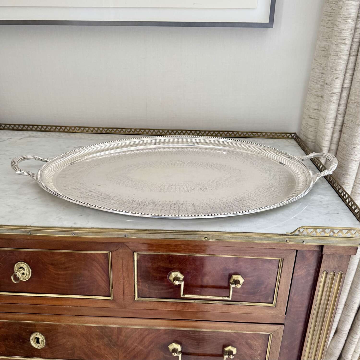 An outstanding quality large Victorian silver plated serving tray of oval form with Acanthus leaf handles, by renowned English silversmiths, Elkington, with a date letter for 1899. Beautifully engraved and with excellent silver plating, the makers marks are stamped to the base.Elkington & Co. are one of the most important names in English silver and certainly the most important in silver plate.They began life in Birmingham as a company of silversmiths in 1836, and experimented with improving gilding techniques. By 1838 they had discovered and patented a new way to electroplate one metal on to the surface of. It introduced electrotyping as a new method of production for silver plated items and exhibited at the Great Exhibition of 1851 with enormous success. Elkington held Royal Warrants for Queen Victoria, King Edward VI, King George V, King Edward VIII and King George VI.