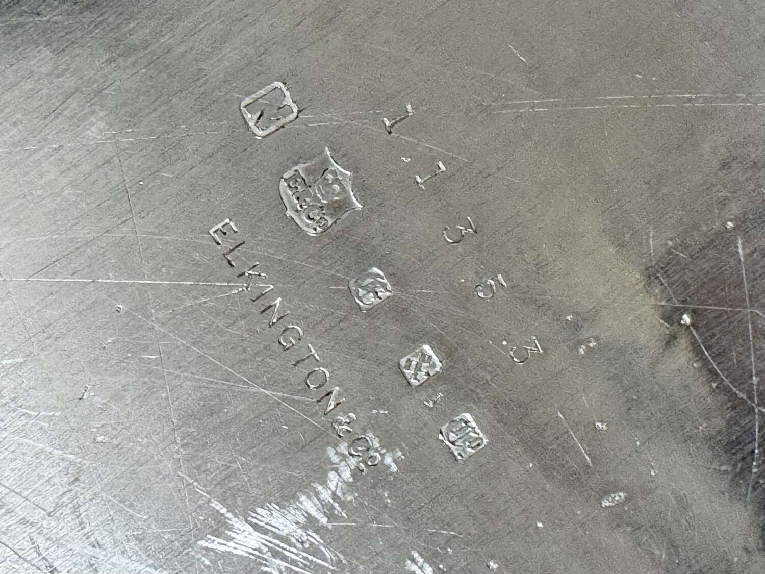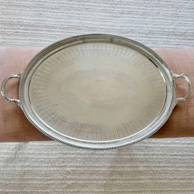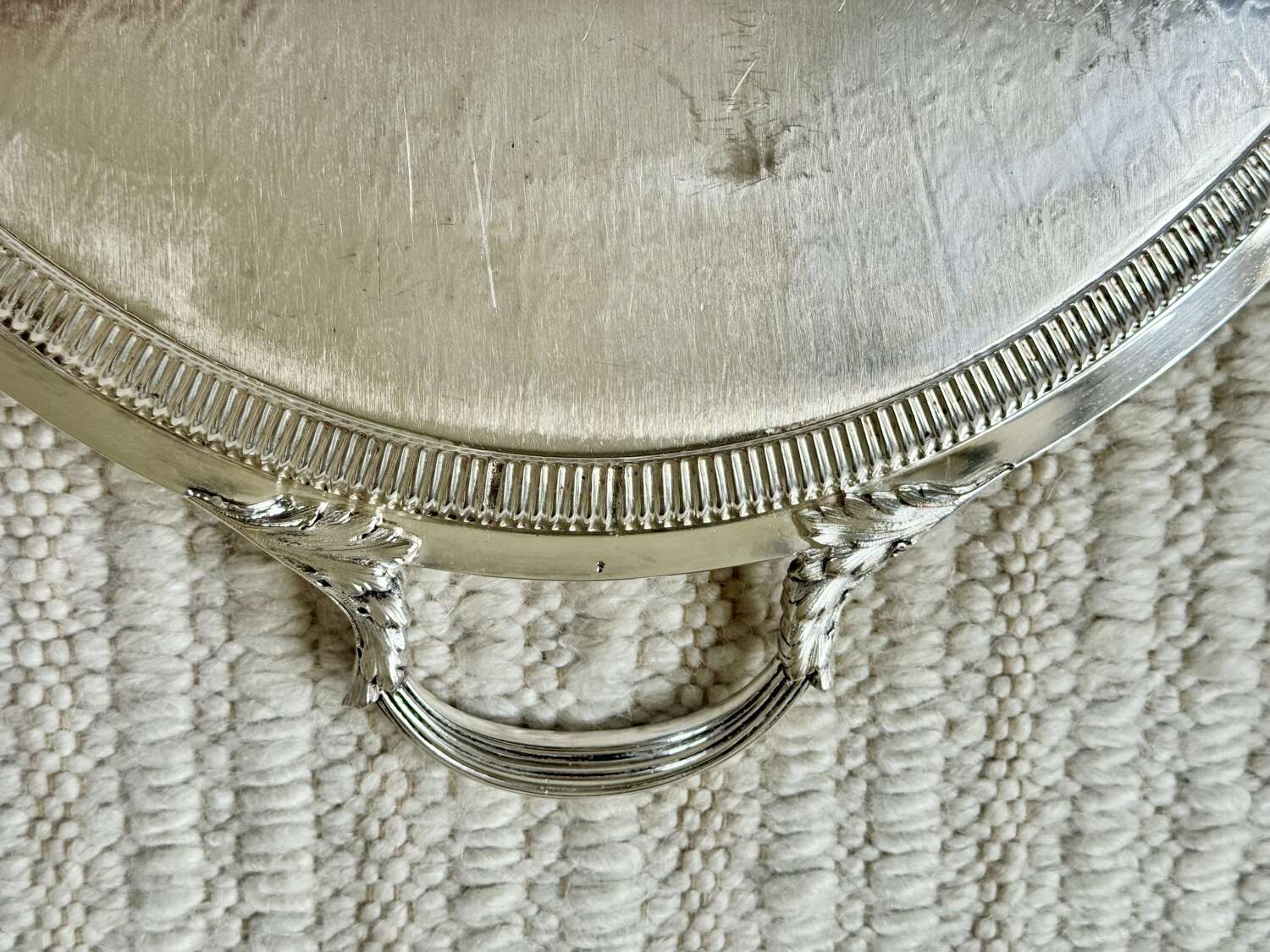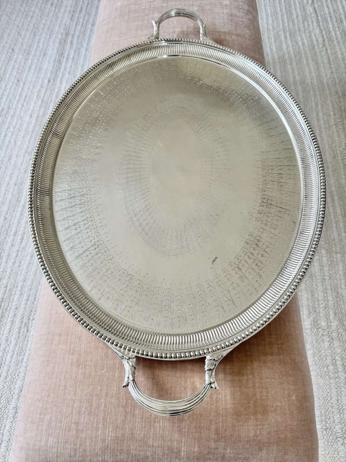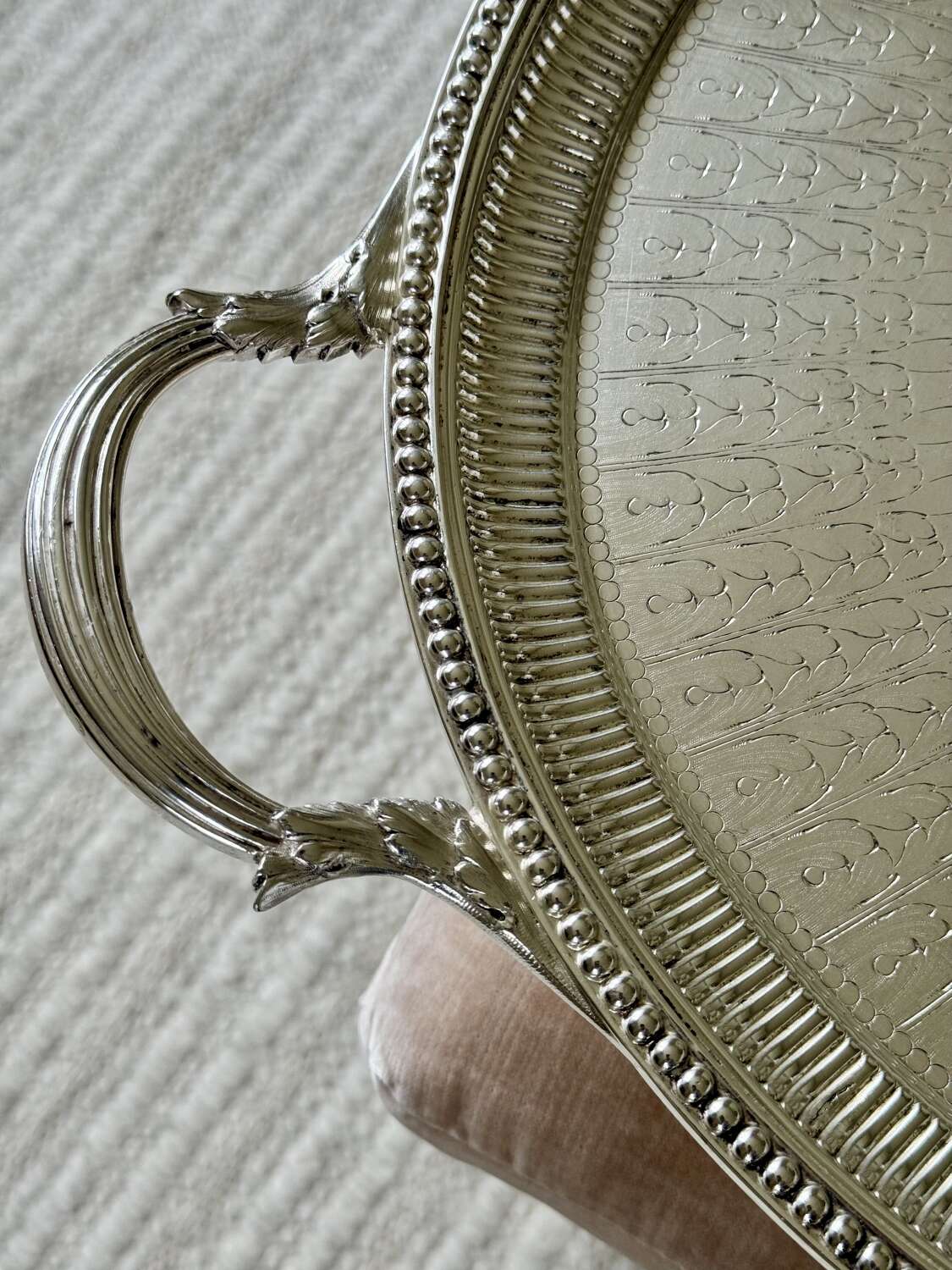 An outstanding quality large Victorian silver plated serving tray of oval form with Acanthus leaf handles, by renowned English silversmiths, Elkington, with a date letter for 1899. Beautifully engraved and with excellent silver plating, the makers marks are stamped to the base.Elkington & Co. are one of the most important names in English silver and certainly the most important in silver plate.They began life in Birmingham as a company of silversmiths in 1836, and experimented with improving gilding techniques. By 1838 they had discovered and patented a new way to electroplate one metal on to the surface of. It introduced electrotyping as a new method of production for silver plated items and exhibited at the Great Exhibition of 1851 with enormous success. Elkington held Royal Warrants for Queen Victoria, King Edward VI, King George V, King Edward VIII and King George VI.
