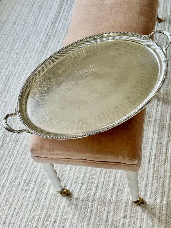 An outstanding quality large Victorian silver plated serving tray of oval form with Acanthus leaf handles, by renowned English silversmiths, Elkington, with a date letter for 1899. Beautifully engraved and with excellent silver plating, the makers marks are stamped to the base.Elkington & Co. are one of the most important names in English silver and certainly the most important in silver plate.They began life in Birmingham as a company of silversmiths in 1836, and experimented with improving gilding techniques. By 1838 they had discovered and patented a new way to electroplate one metal on to the surface of. It introduced electrotyping as a new method of production for silver plated items and exhibited at the Great Exhibition of 1851 with enormous success. Elkington held Royal Warrants for Queen Victoria, King Edward VI, King George V, King Edward VIII and King George VI.