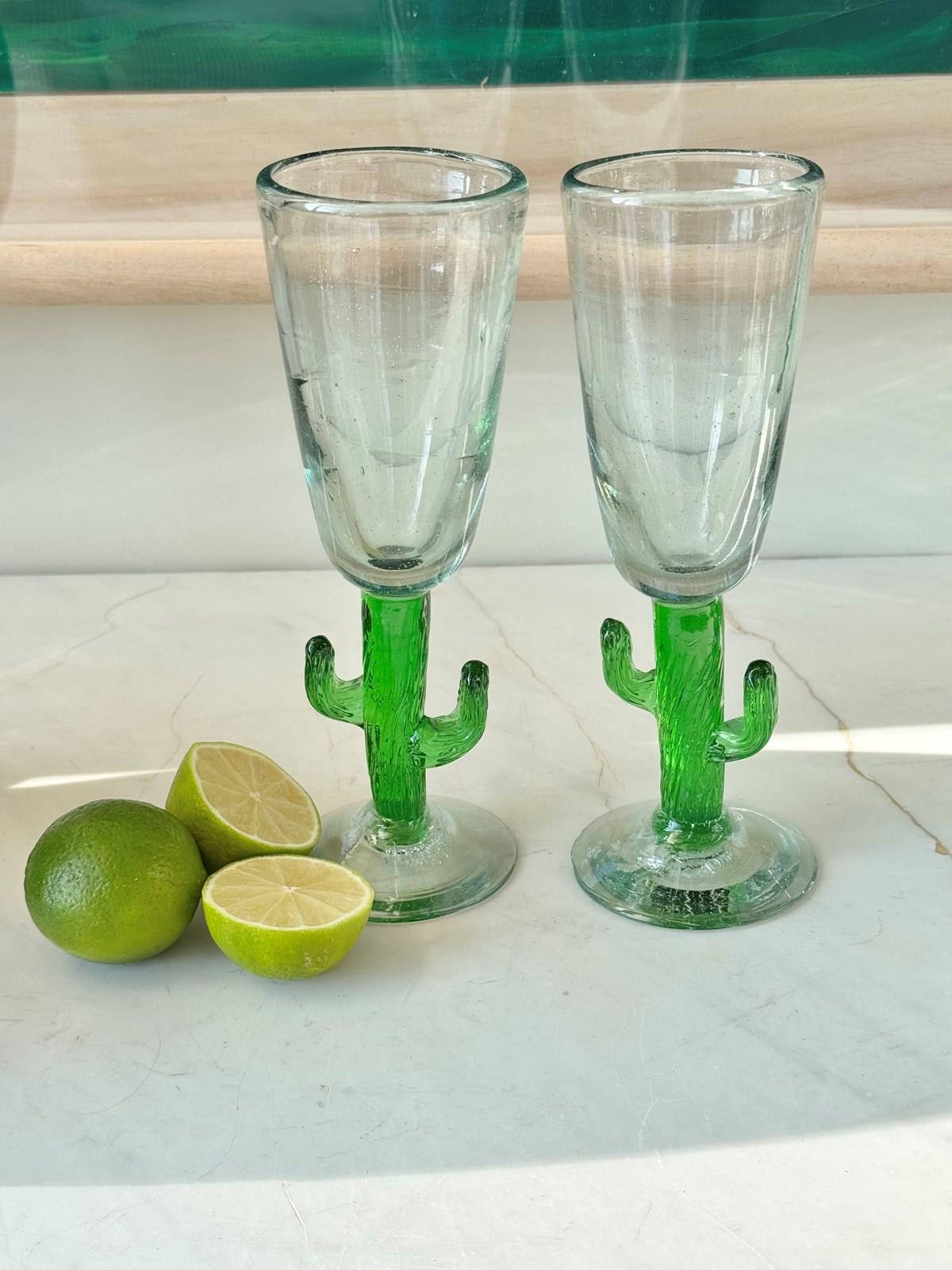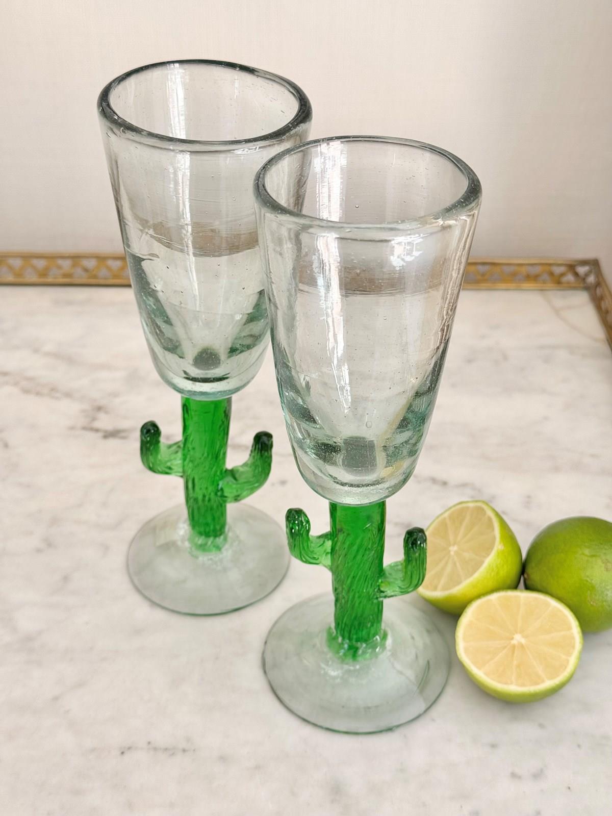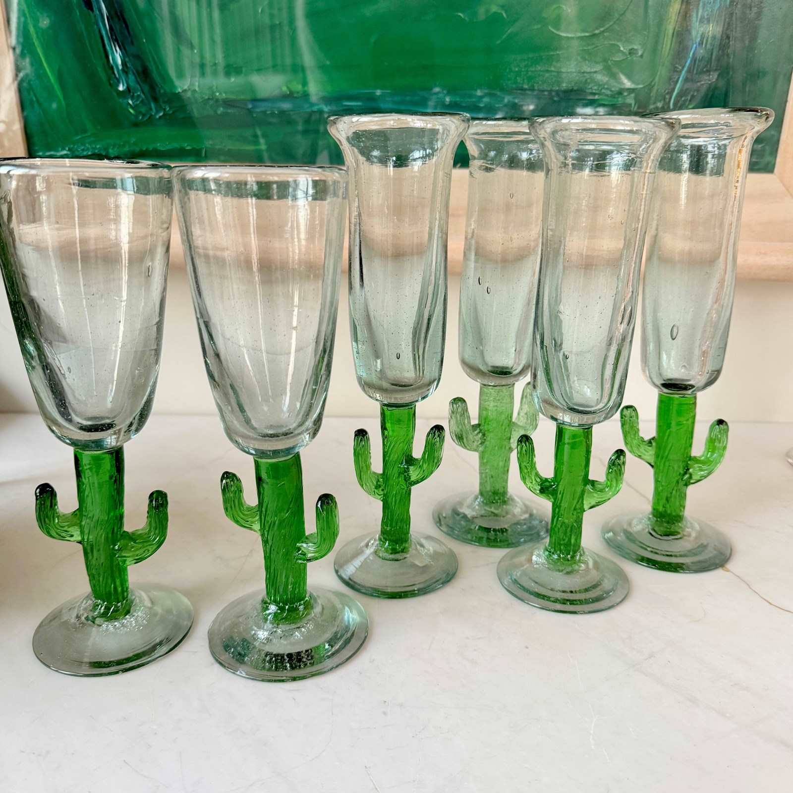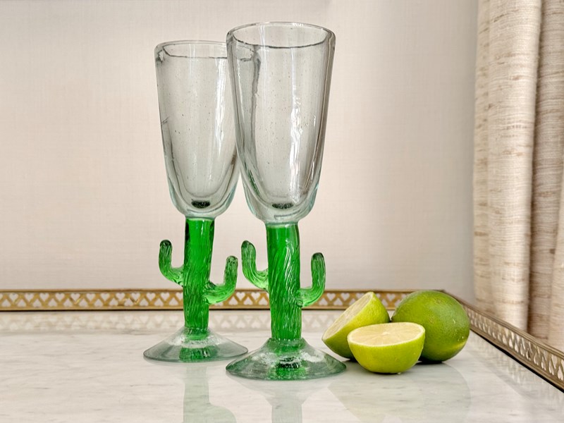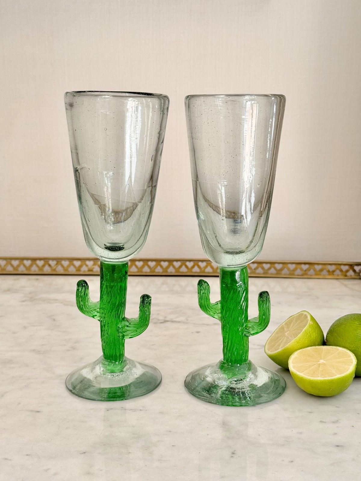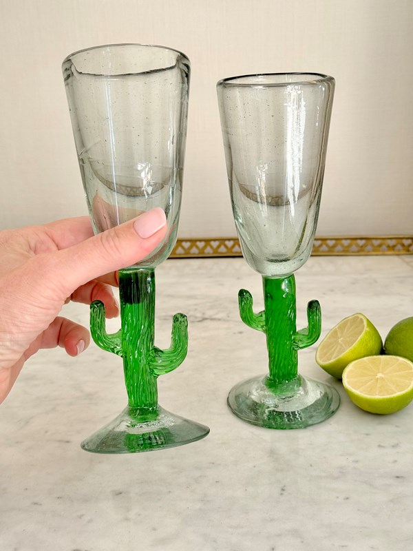 A funky pair of Brutalist Mexican recycled handblown glass cocktail or champagne flutes, each with a green glass cactus stem, Circa 1970/80s. Unused since bought in Mexico on holiday in the late 1970s and kept in a cupboard by the owner to bring out for a special occasion! Each wine glass is hand made and as such each is slightly different in size and shape, but all are approx 21cm high, 7cm diameter.