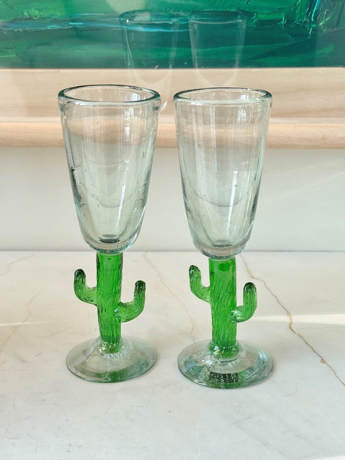 Pair Brutalist Mexican Handblown Glass Cactus Flutes