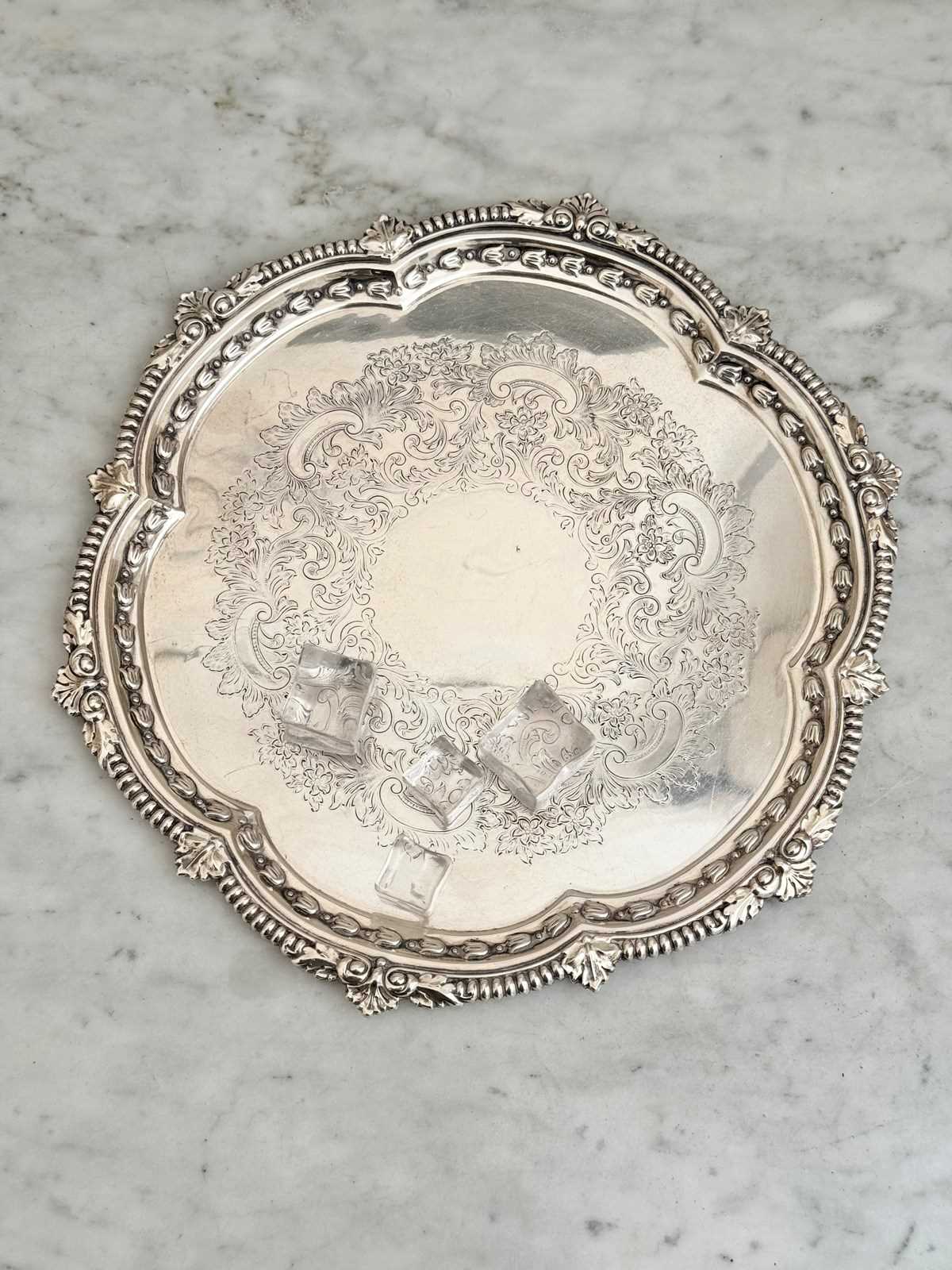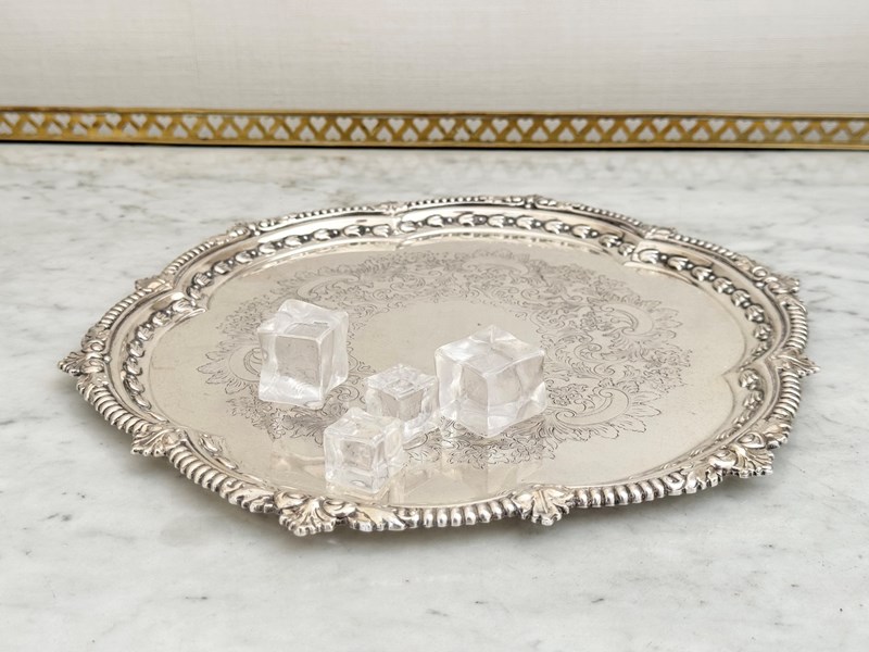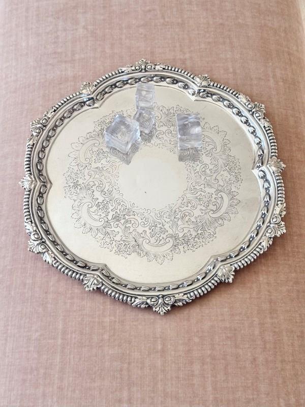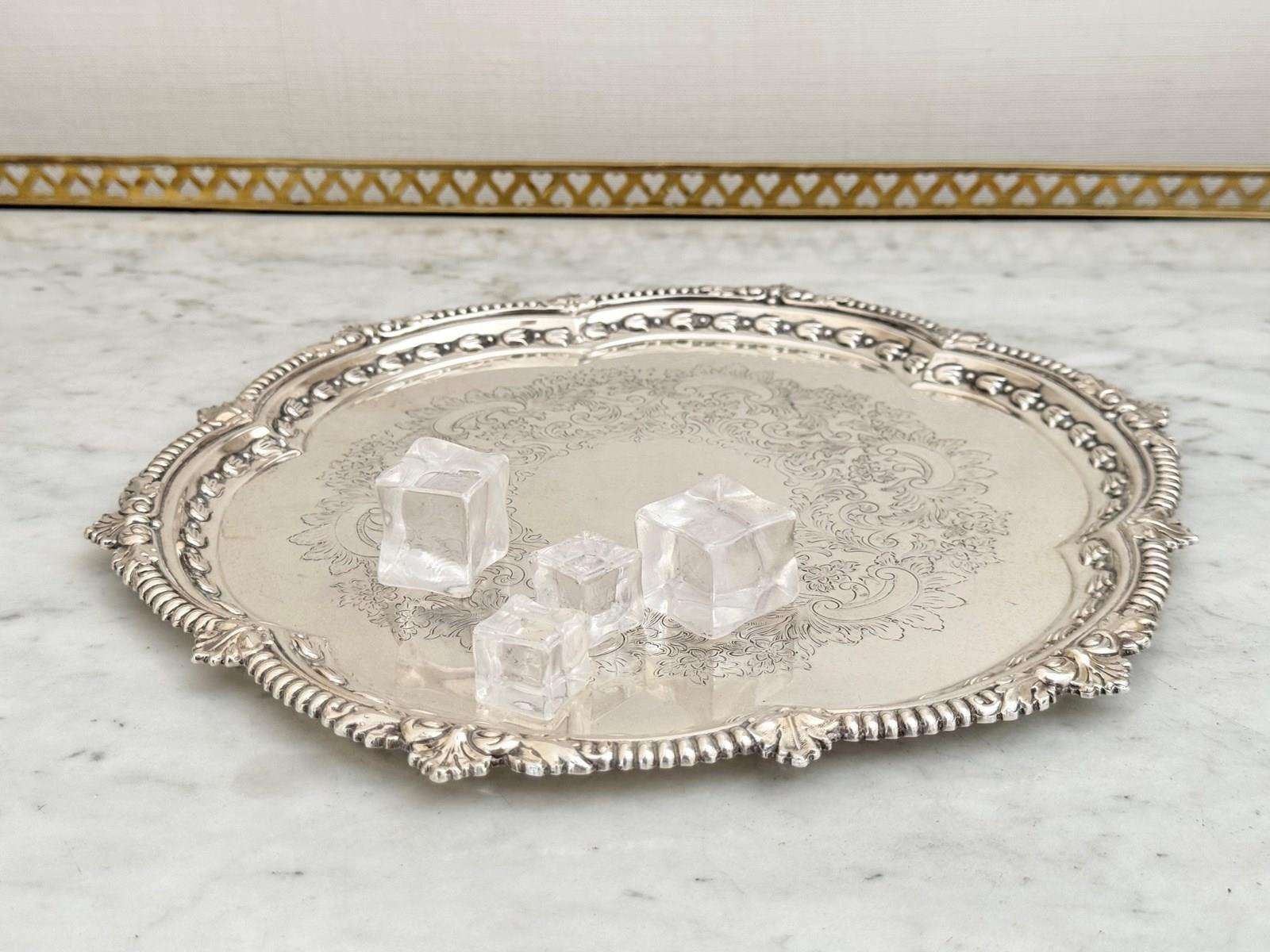 A nice quality early 20th Century round silver plated drinks serving tray, Circa 1907, with makers mark for Barker Brothers, Birmingham. Beautifully crafted with a gadrooned, scalloped rim with pretty embossed tulips, this is a superbly useful salver.