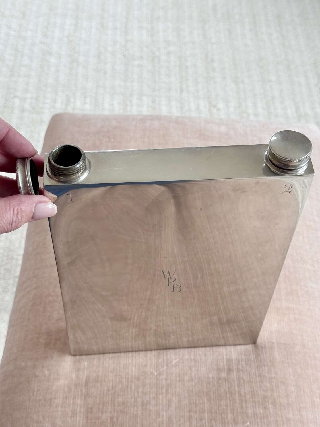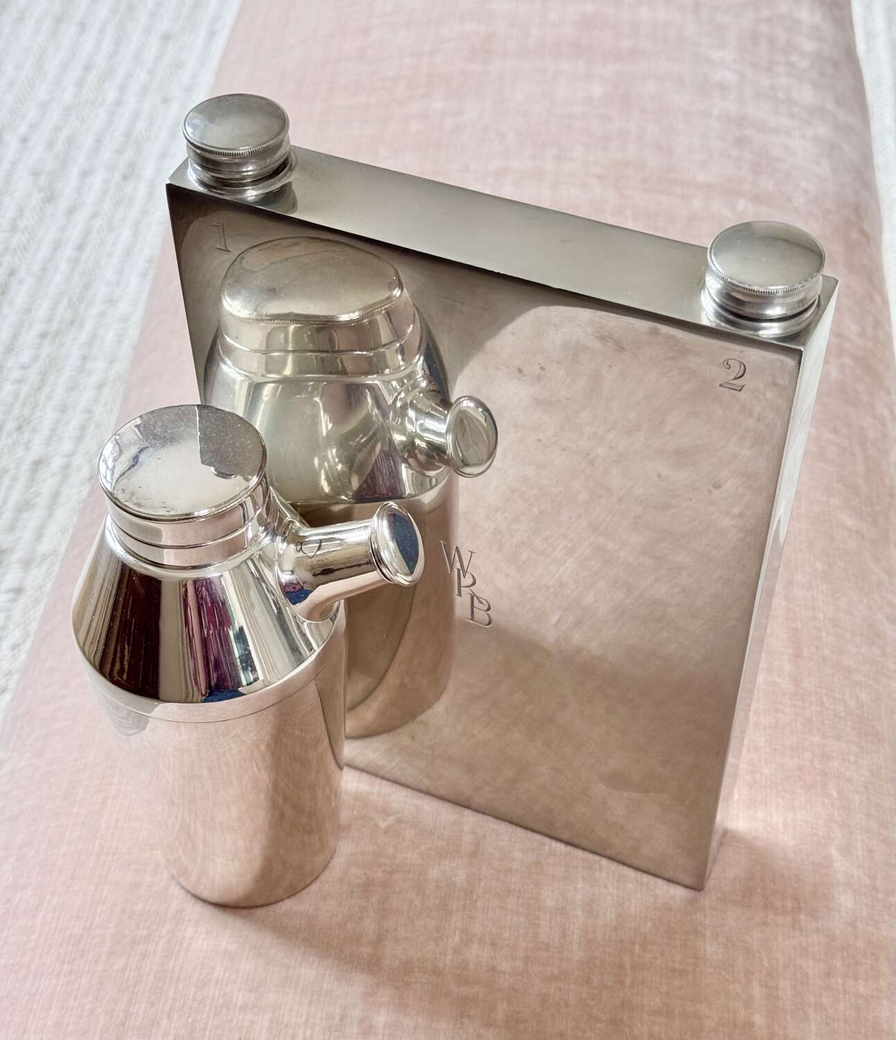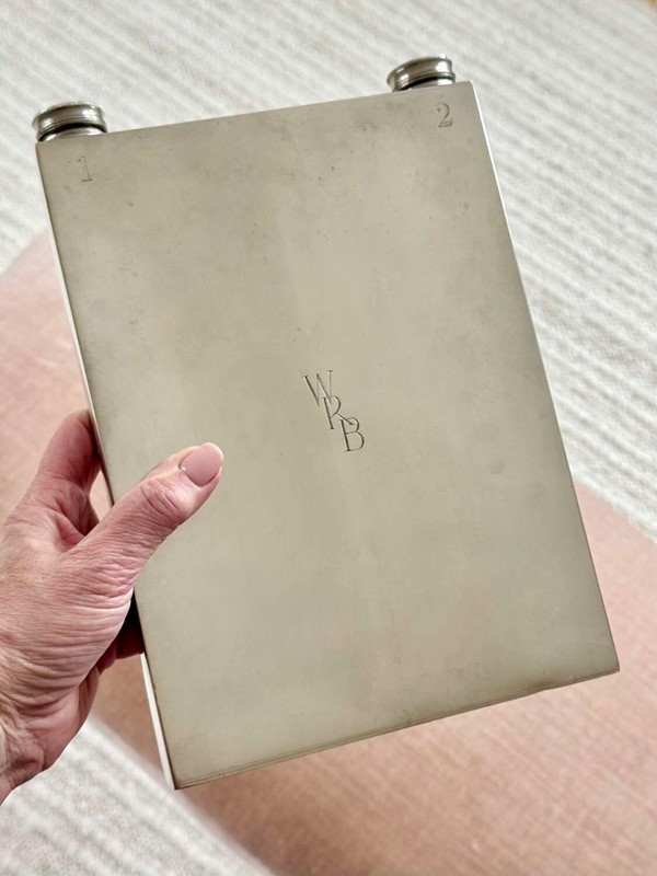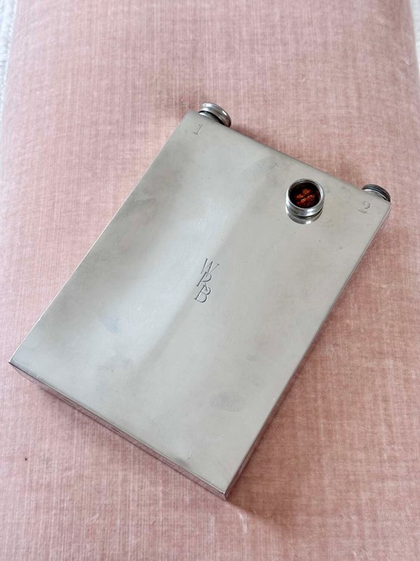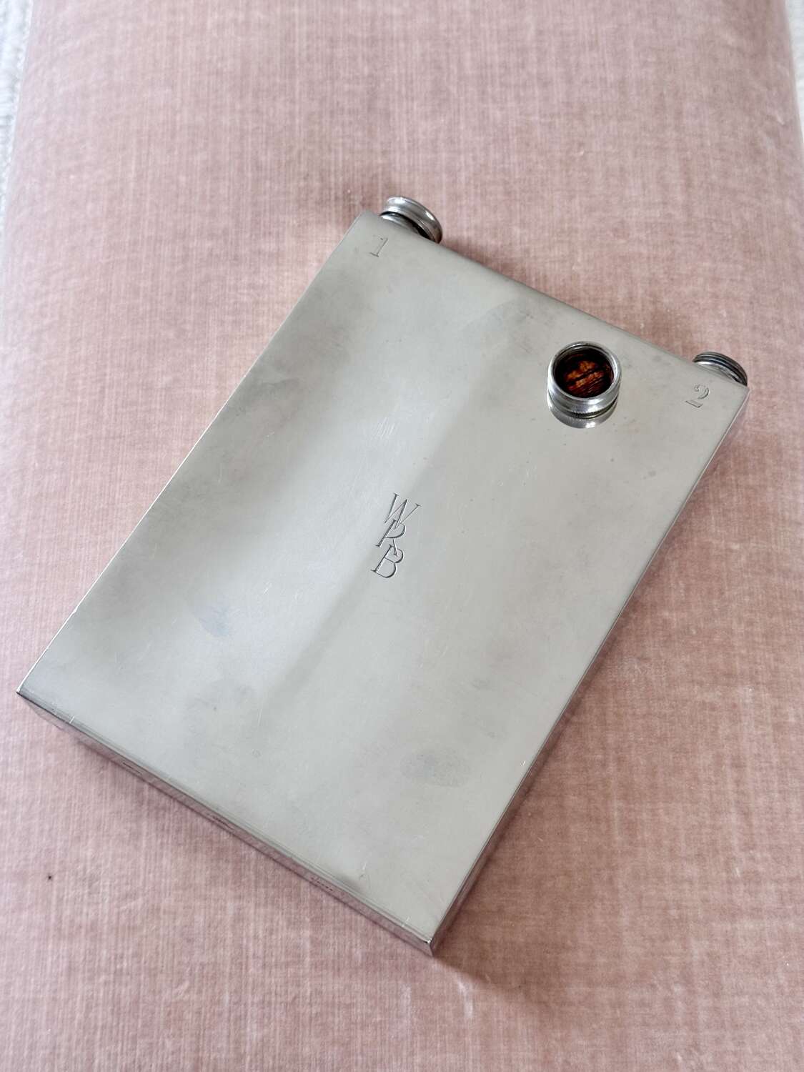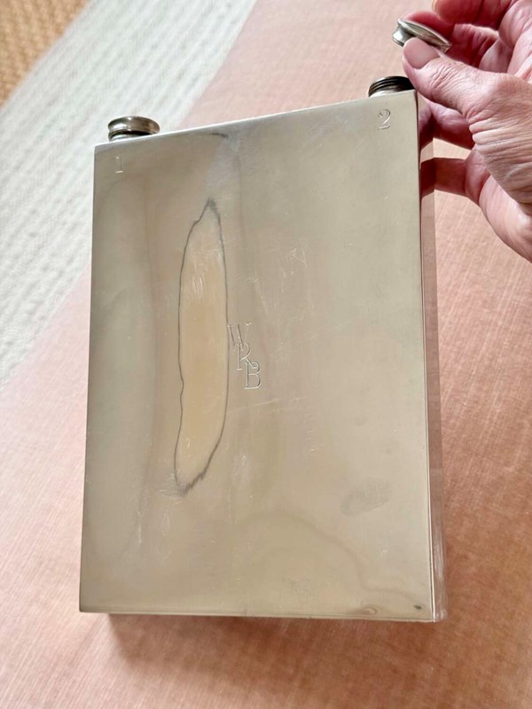 A fabulously unusual and rare, English Art Deco silver plated giant double sided hip flask, with excellent makers mark for James Dixon & Sons Ltd, Sheffield, Circa 1940. This fun piece of vintage barware is numbered "1" and "2" on each side and has twin cork lined twist caps. The initials WRB are to the front and the makers mark to the base. In good condition, one side is concave compared to the other side. Each side holds approx 560ml (or 1 pint), so a hefty 2 pints can be stored, making this an excellent sporting flask for spirits or wine.