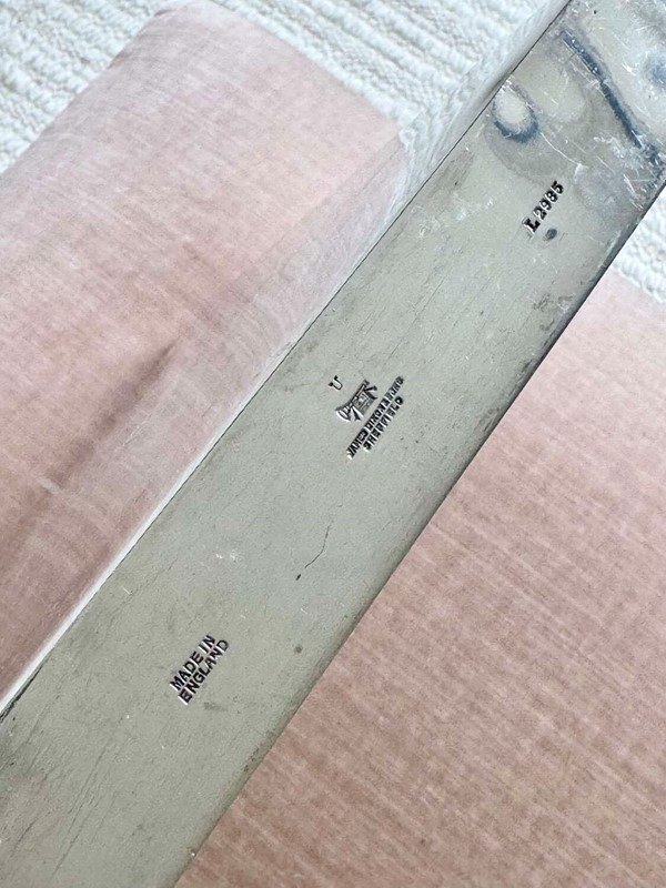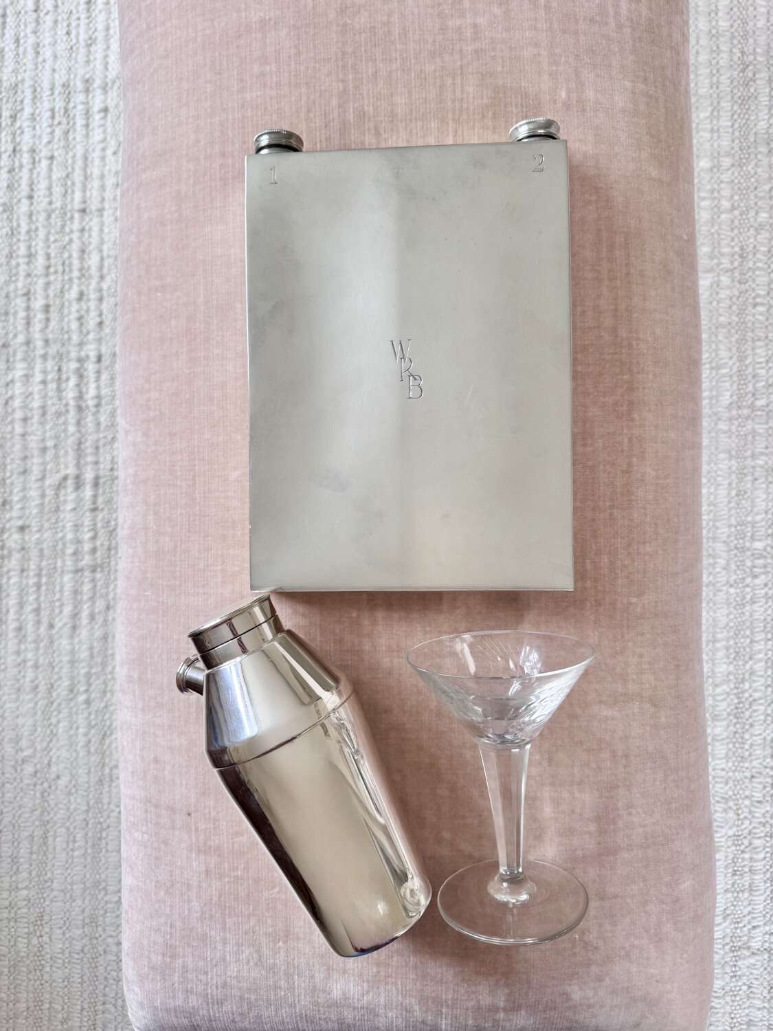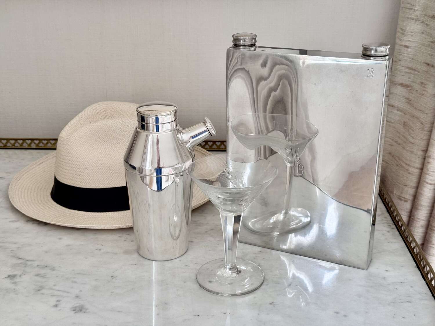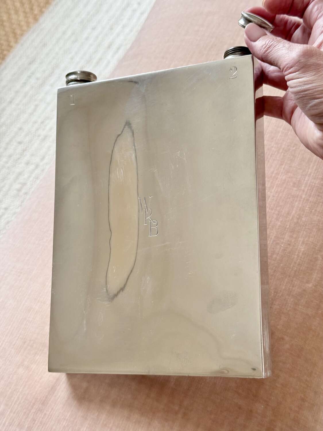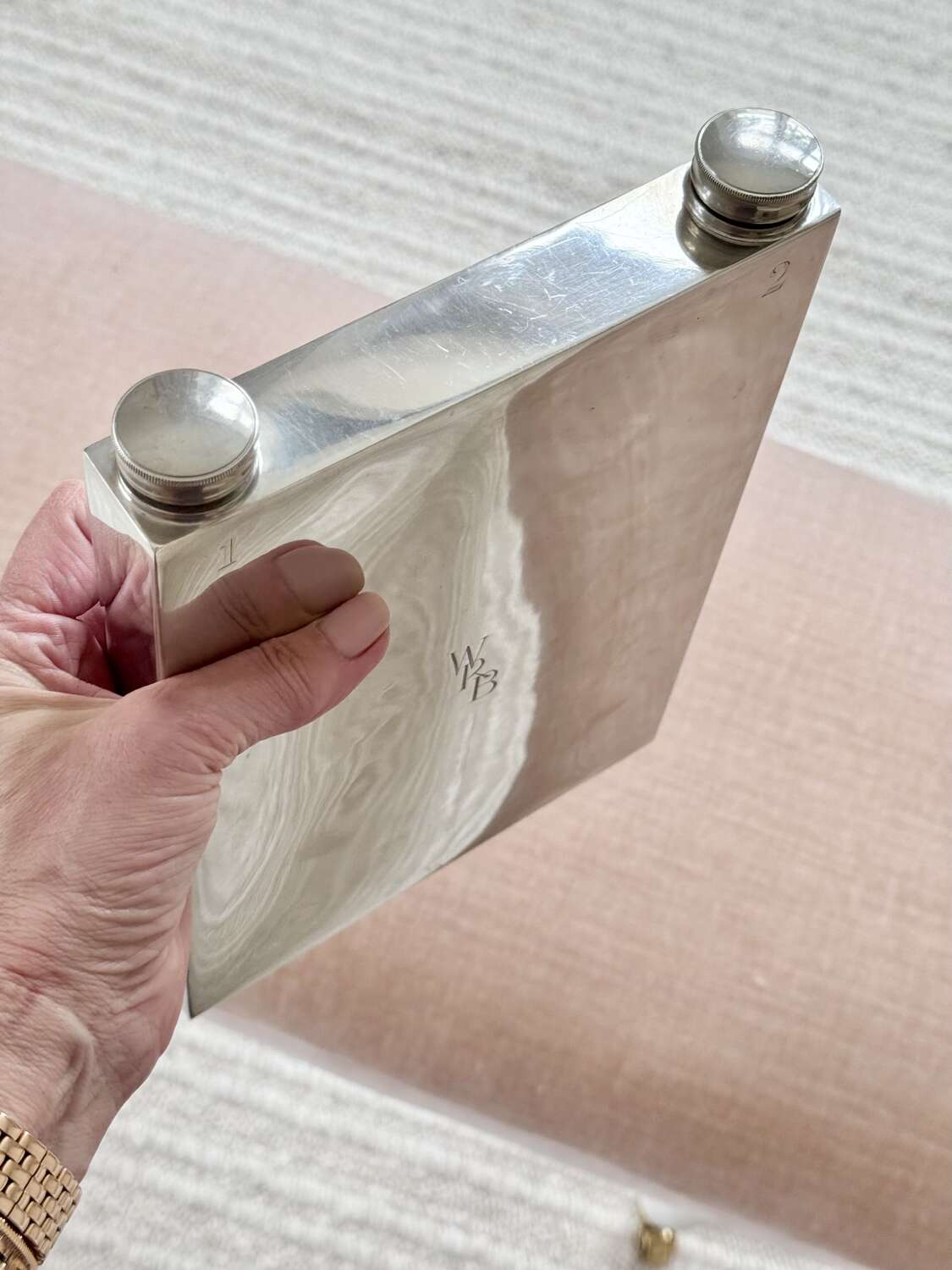 A fabulously unusual and rare, English Art Deco silver plated giant double sided hip flask, with excellent makers mark for James Dixon & Sons Ltd, Sheffield, Circa 1940. This fun piece of vintage barware is numbered "1" and "2" on each side and has twin cork lined twist caps. The initials WRB are to the front and the makers mark to the base. In good condition, one side is concave compared to the other side. Each side holds approx 560ml (or 1 pint), so a hefty 2 pints can be stored, making this an excellent sporting flask for spirits or wine.