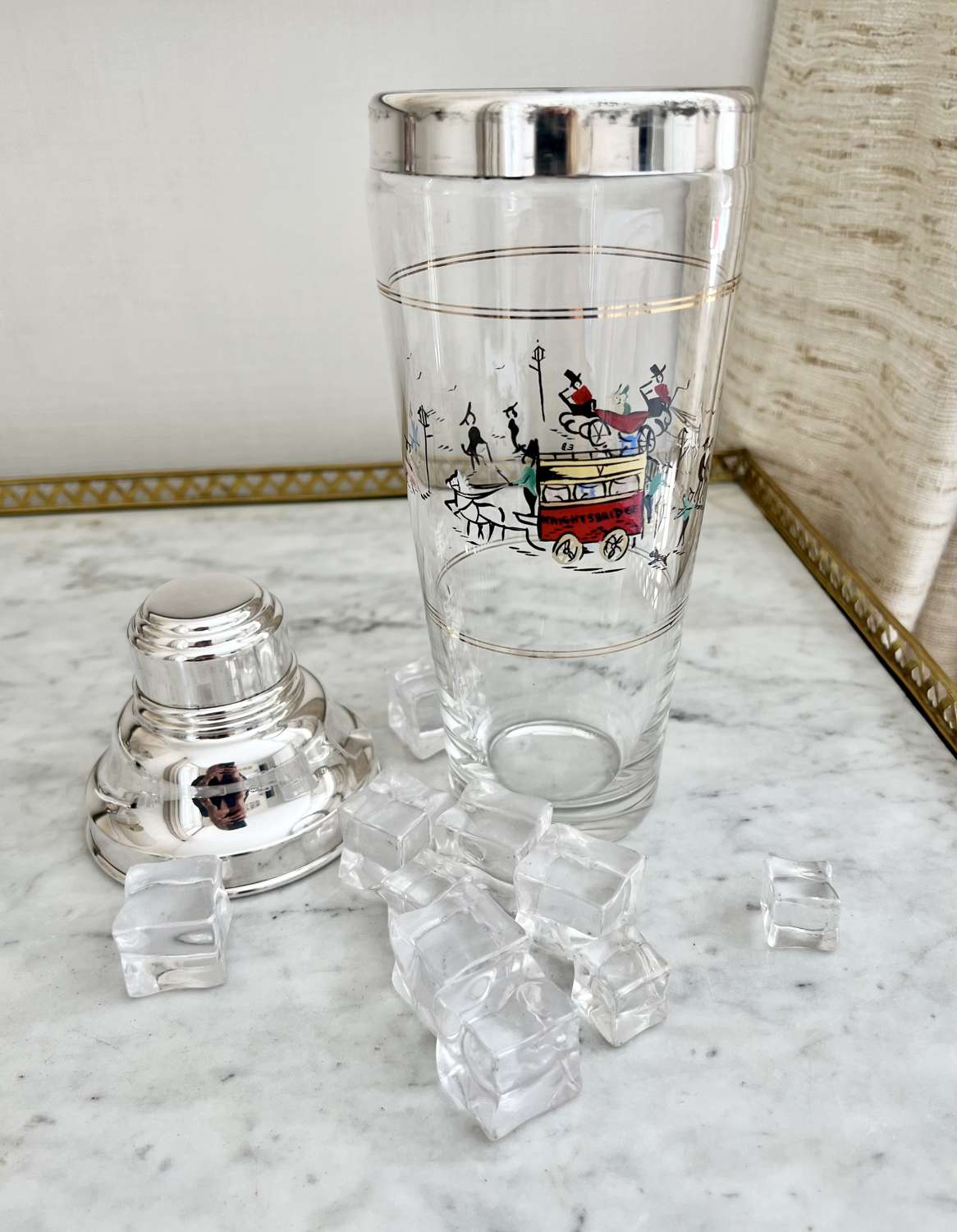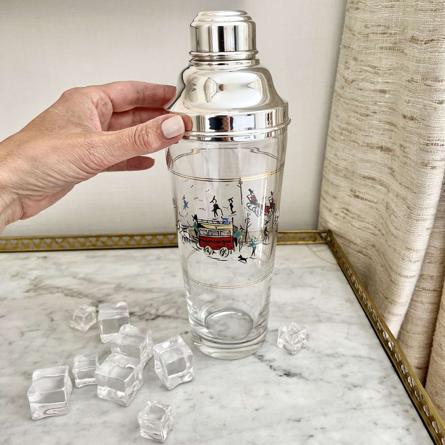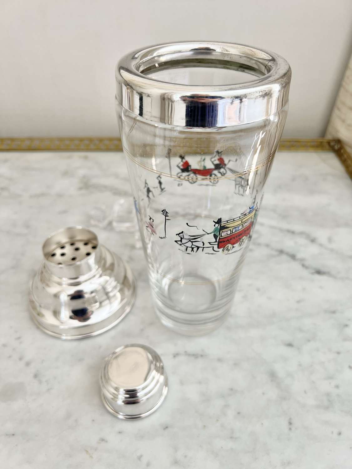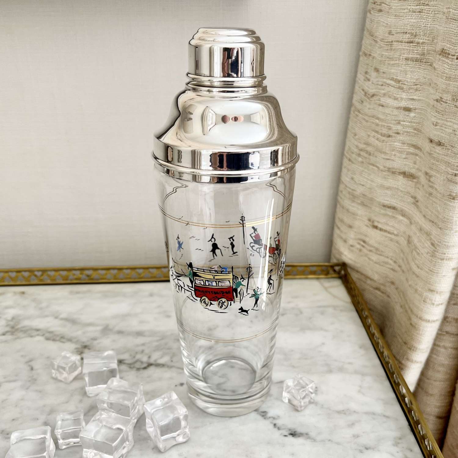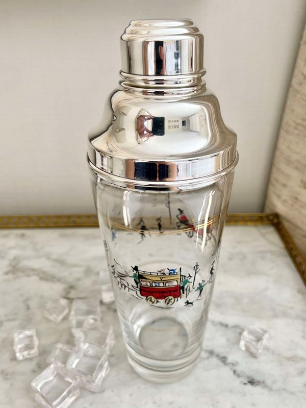 A fantastically rare English silver plated and glass tall cocktail shaker, Circa 1950s, with hand enamelled London scene of Knightsbridge, including children playing, a horse drawn carriage and a ‘Knightsbridge’ Omnibus. In excellent conditon with maker's mark for P Vogel & Co Ltd.