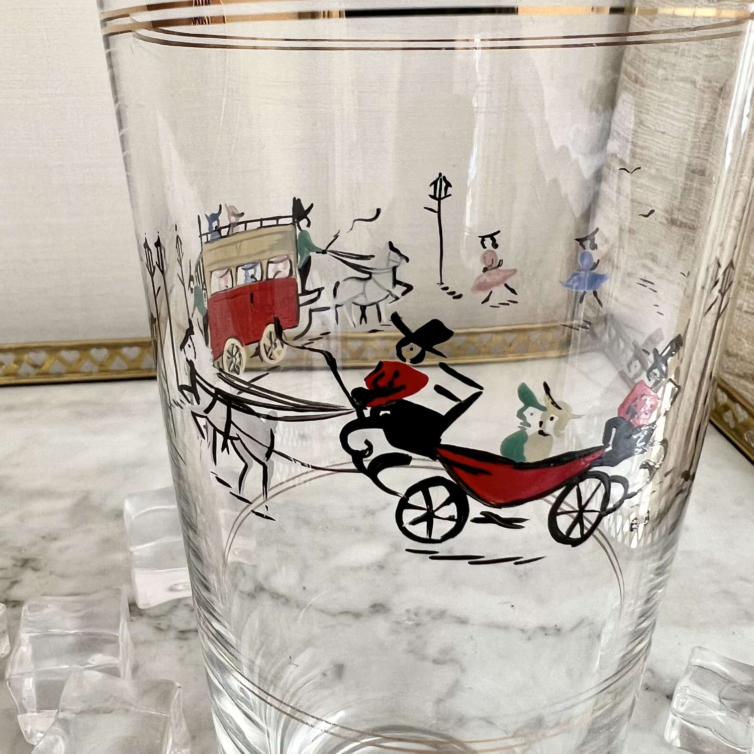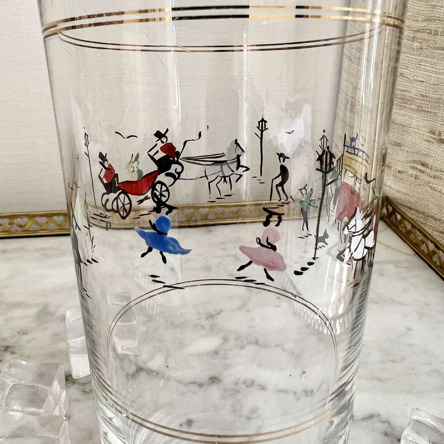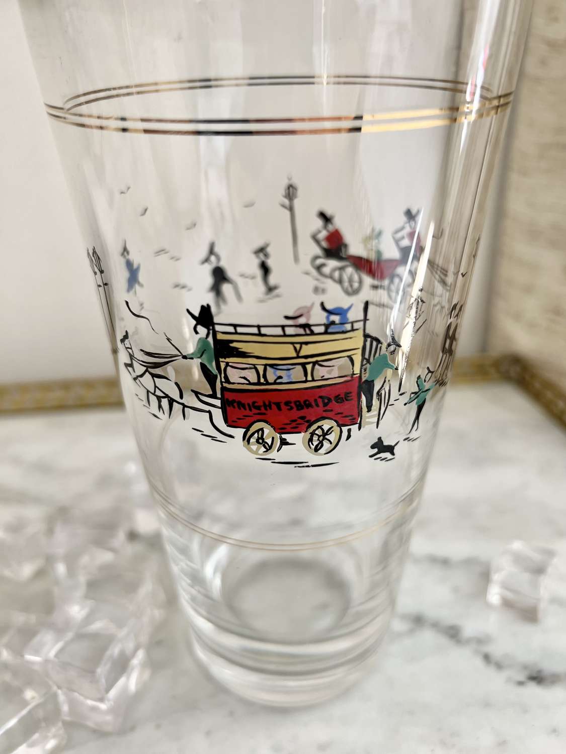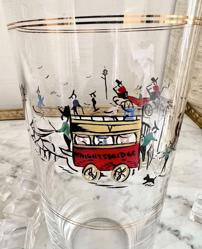 A fantastically rare English silver plated and glass tall cocktail shaker, Circa 1950s, with hand enamelled London scene of Knightsbridge, including children playing, a horse drawn carriage and a ‘Knightsbridge’ Omnibus. In excellent conditon with maker's mark for P Vogel & Co Ltd.