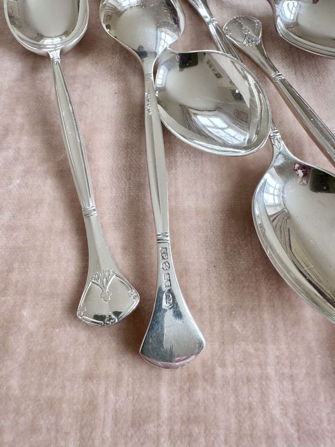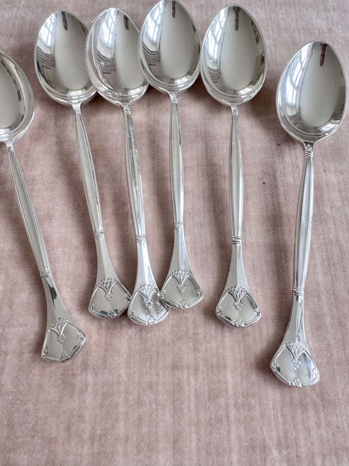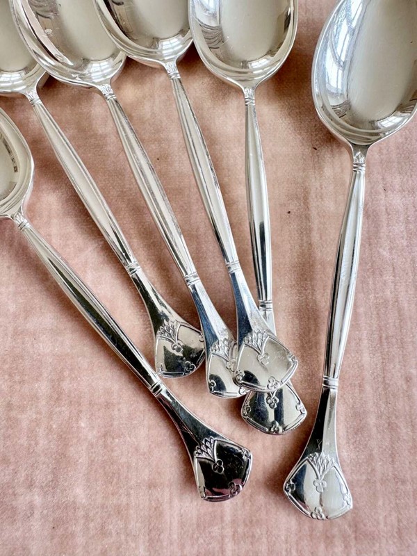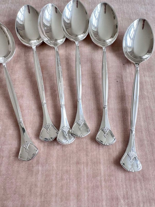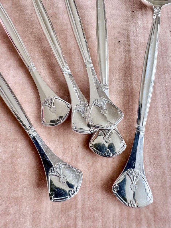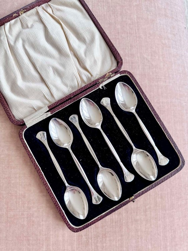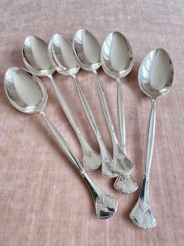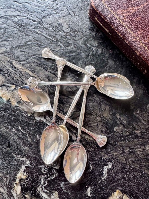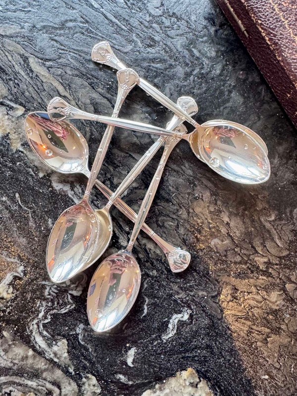 An smart set of six Art Nouveau English silver plated spoons with Liberty style ends, retained in their original satin and velvet lined case, Circa 1910. In excellent condition.