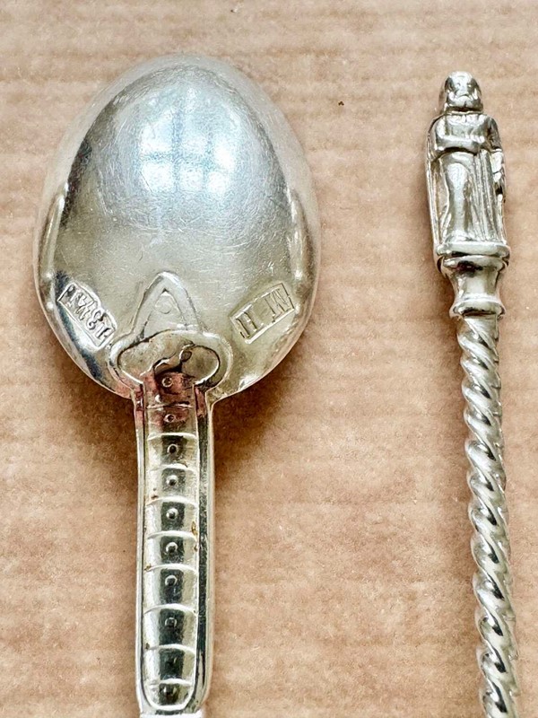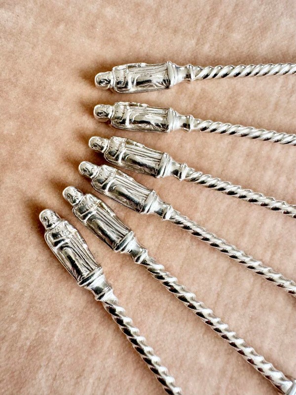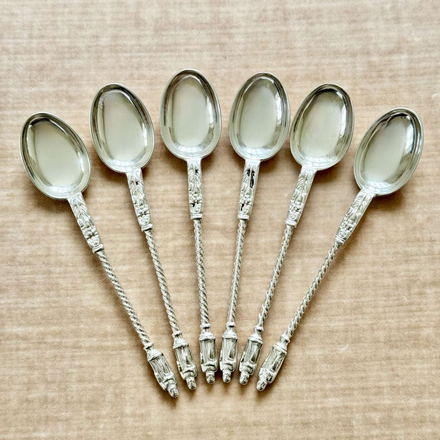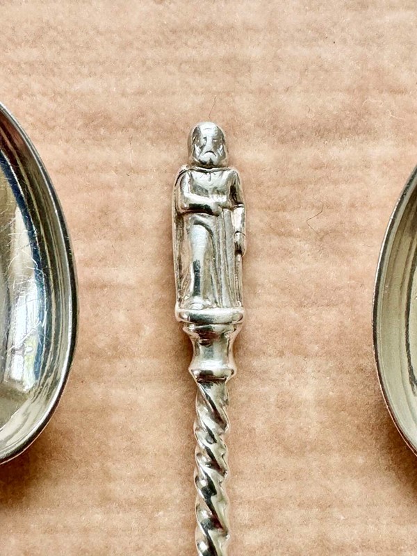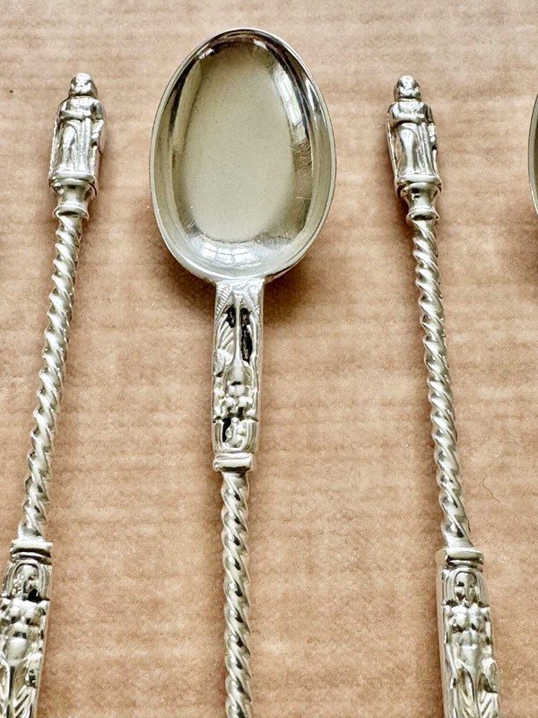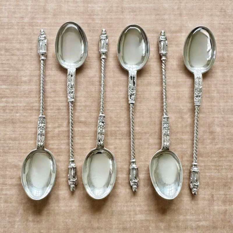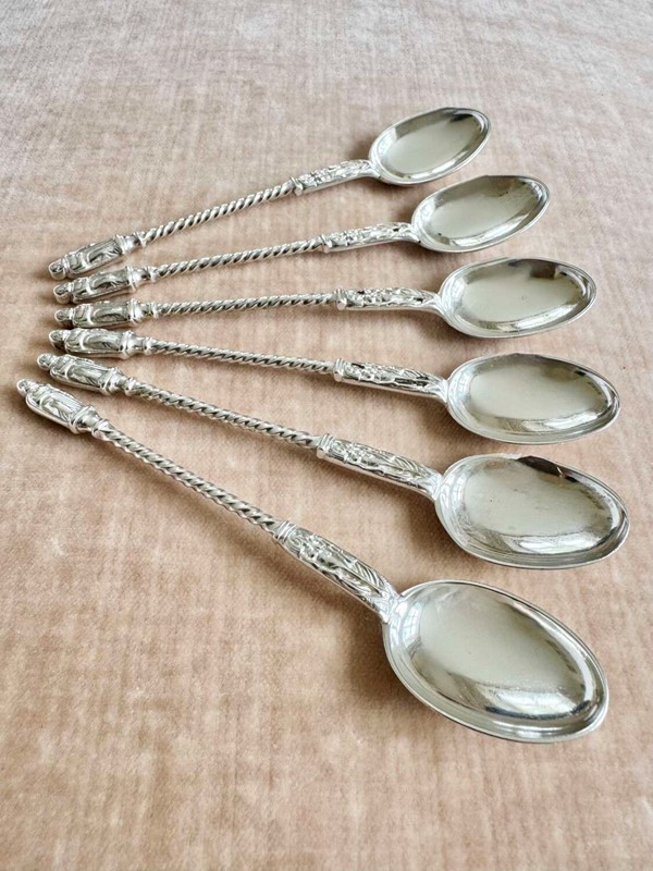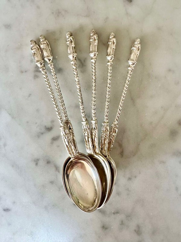 A pretty set of six early 20th Century Danish silver Apostle spoons, Circa 1910. Total silver weight 60g. Makers mark for HH (likely Herman Heiman, Denmark). Silver mark for 13 1/4 L which was an early silver marker.