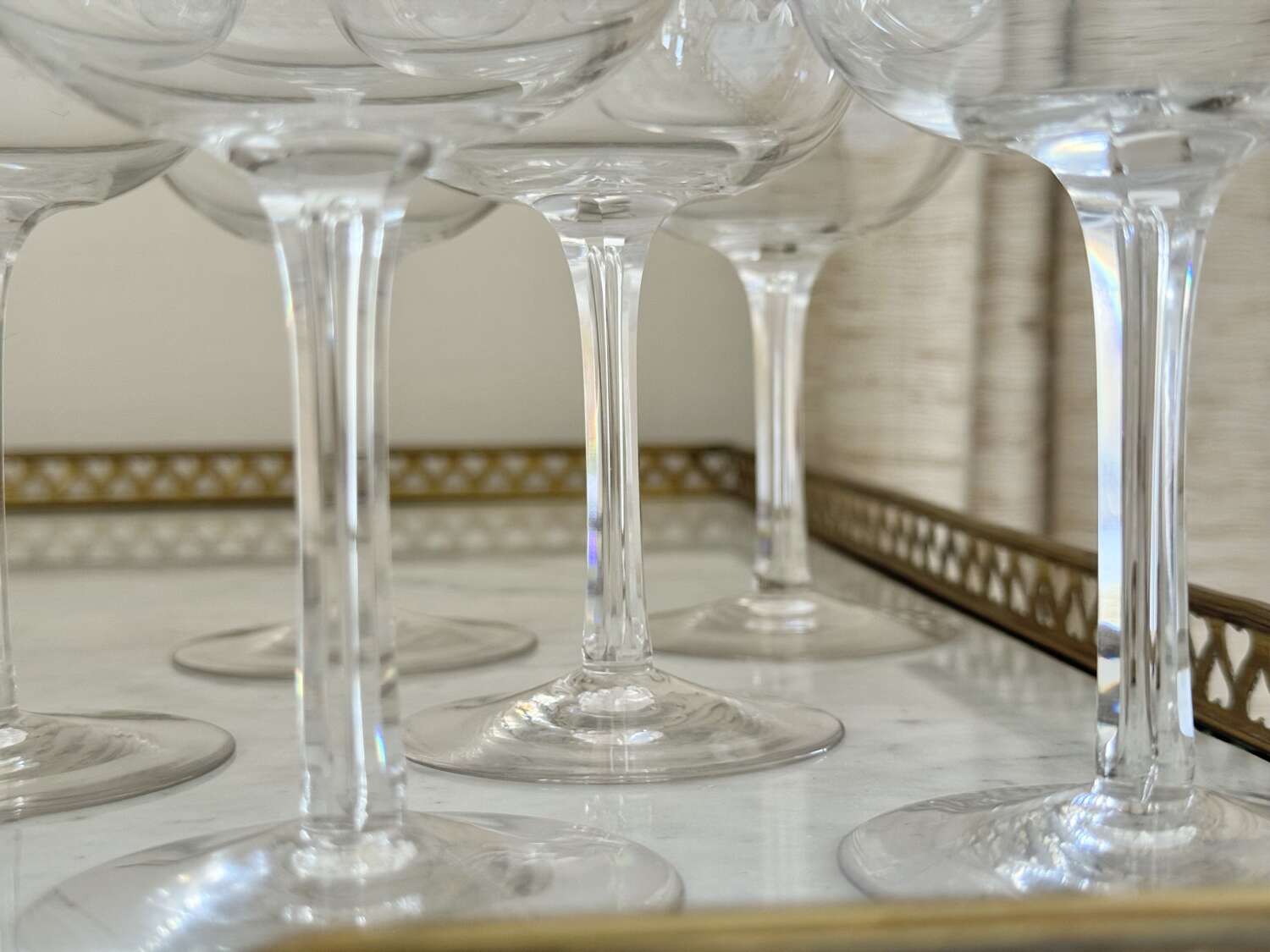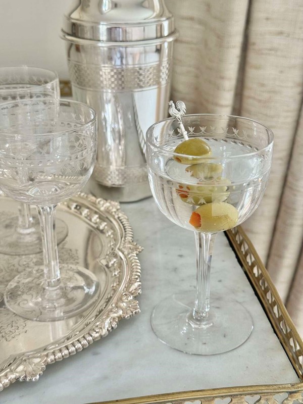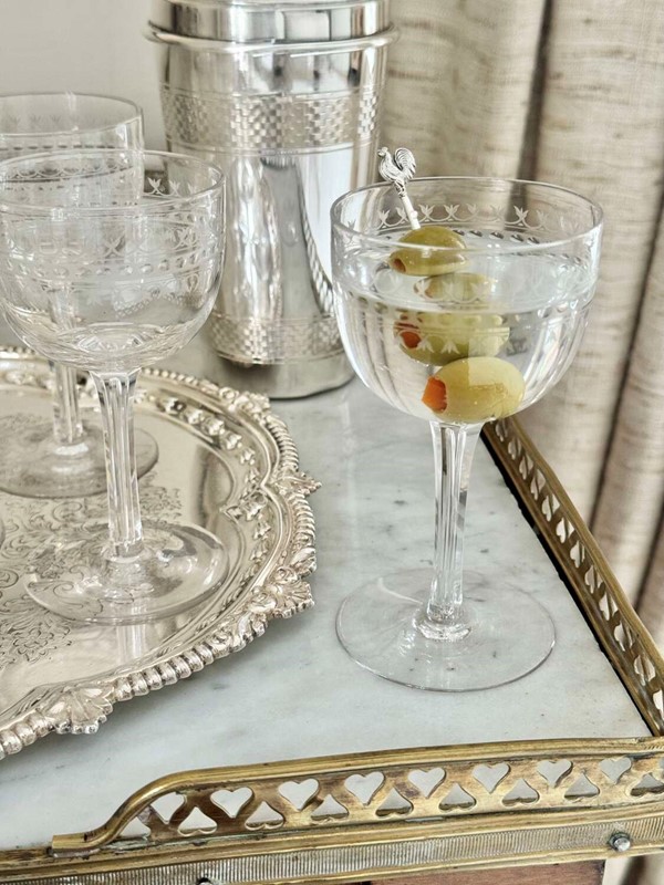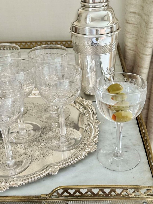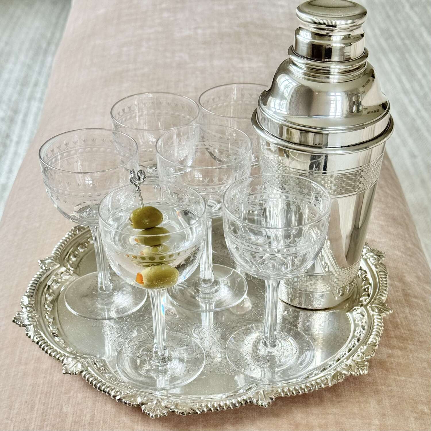 An exquisite set of six Edwardian hand etched glasseswith carved stems which have individual, hand blown, elongated bubbles in them, Circa 1900. Superb quality, these versatile glasses have a max capacity of 110ml and are perfect for shaking cocktails such as Martini.