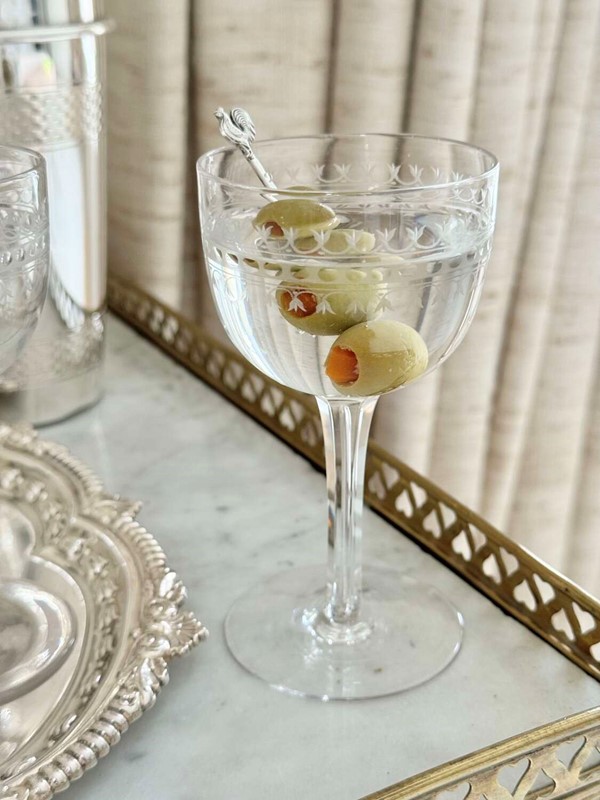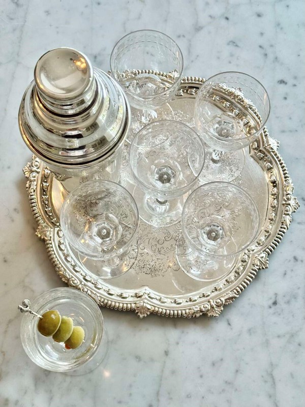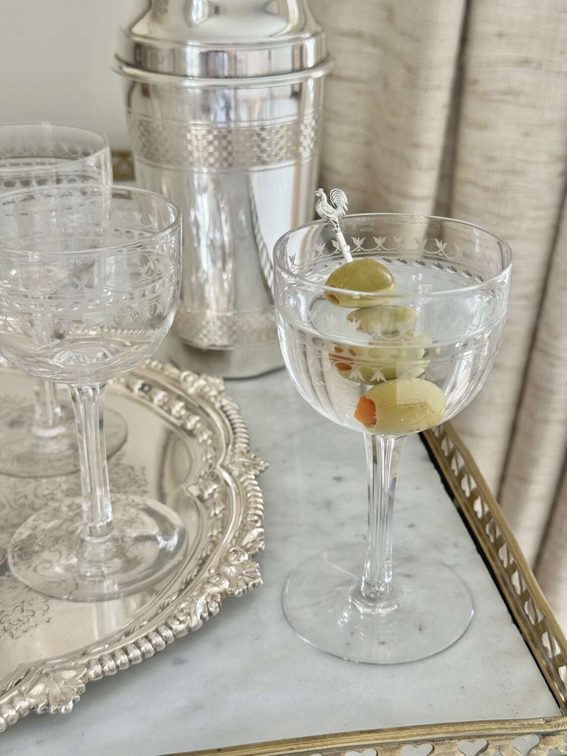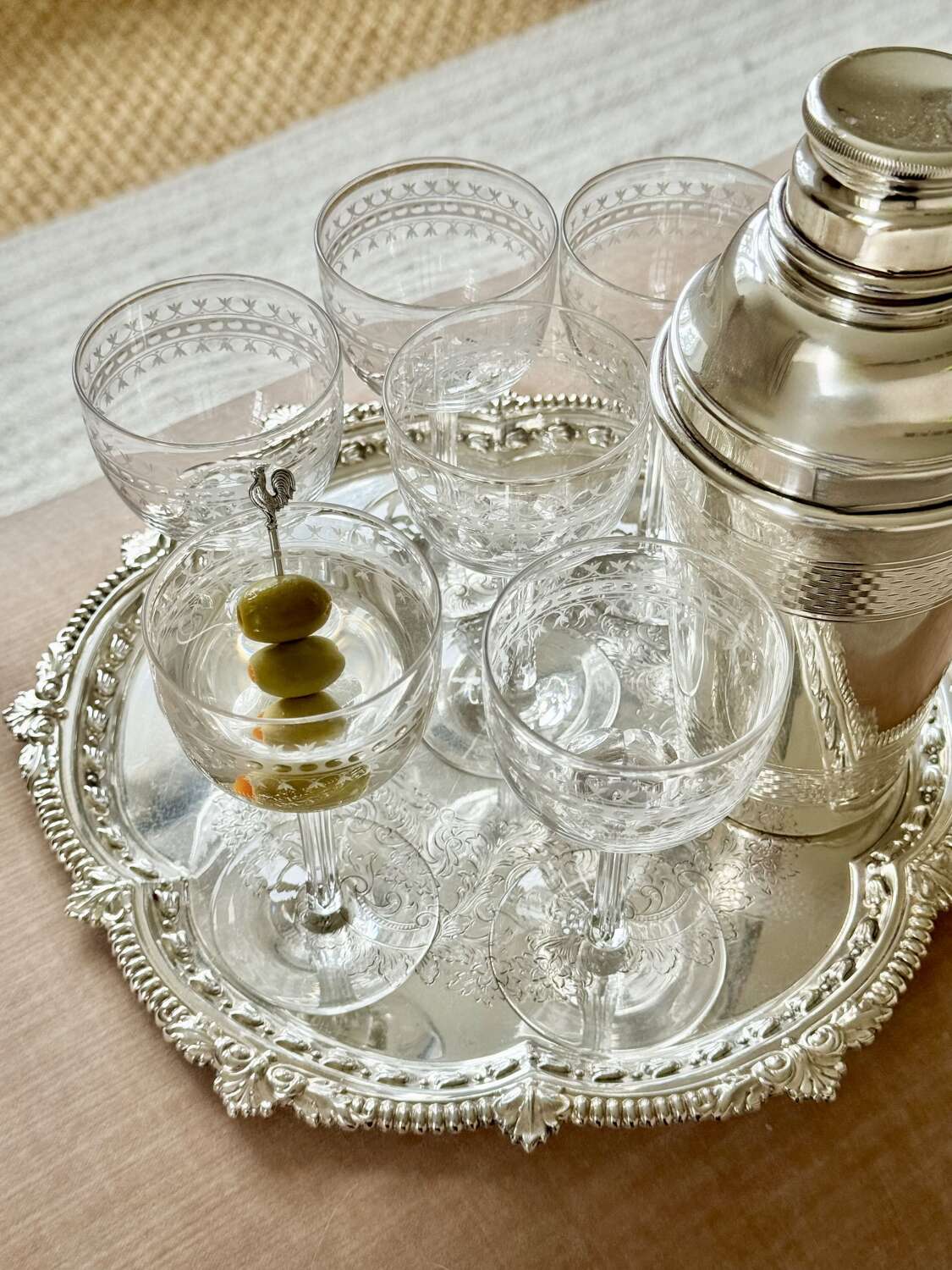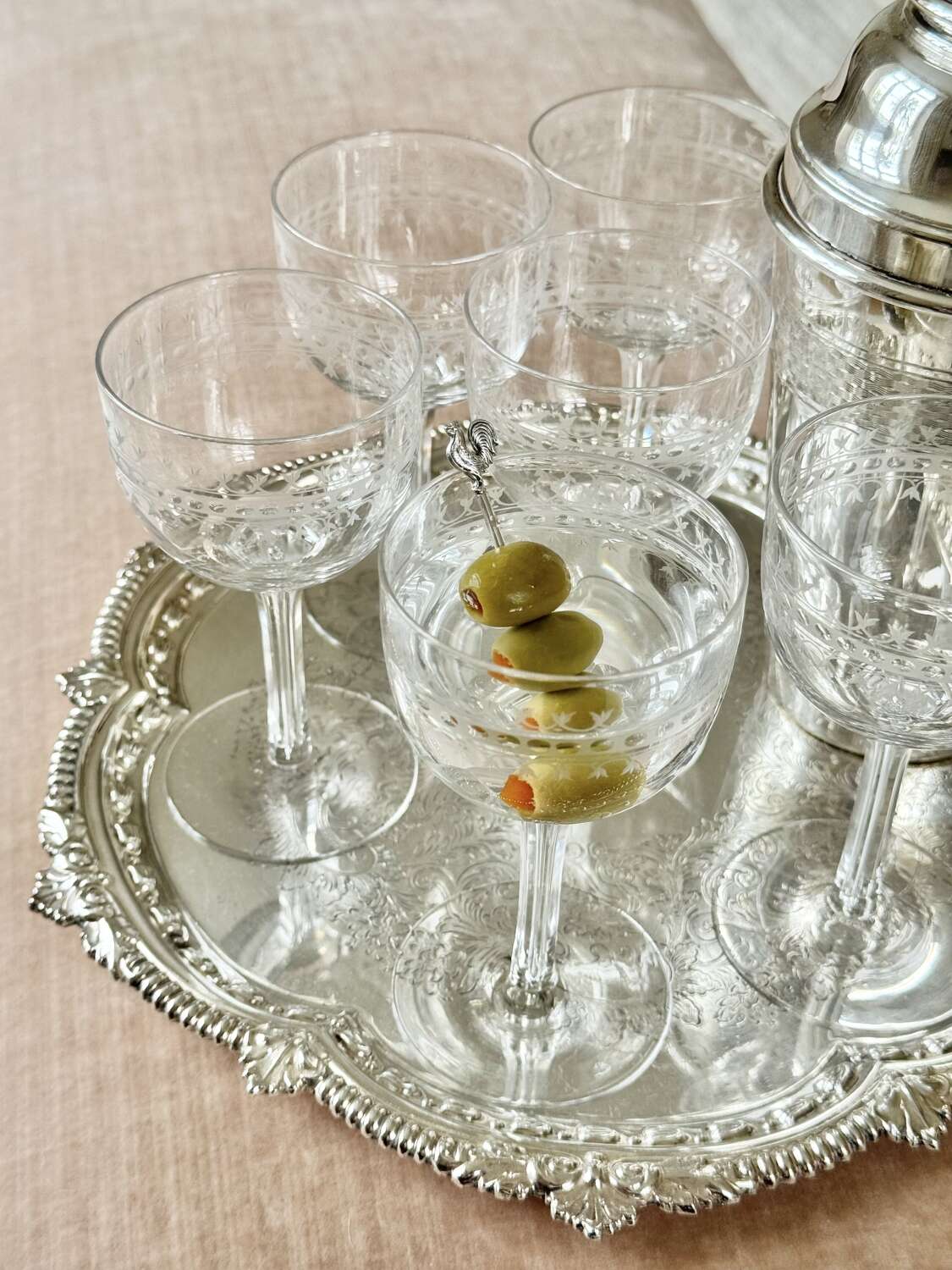An exquisite set of six Edwardian hand etched glasseswith carved stems which have individual, hand blown, elongated bubbles in them, Circa 1900. Superb quality, these versatile glasses have a max capacity of 110ml and are perfect for shaking cocktails such as Martini.