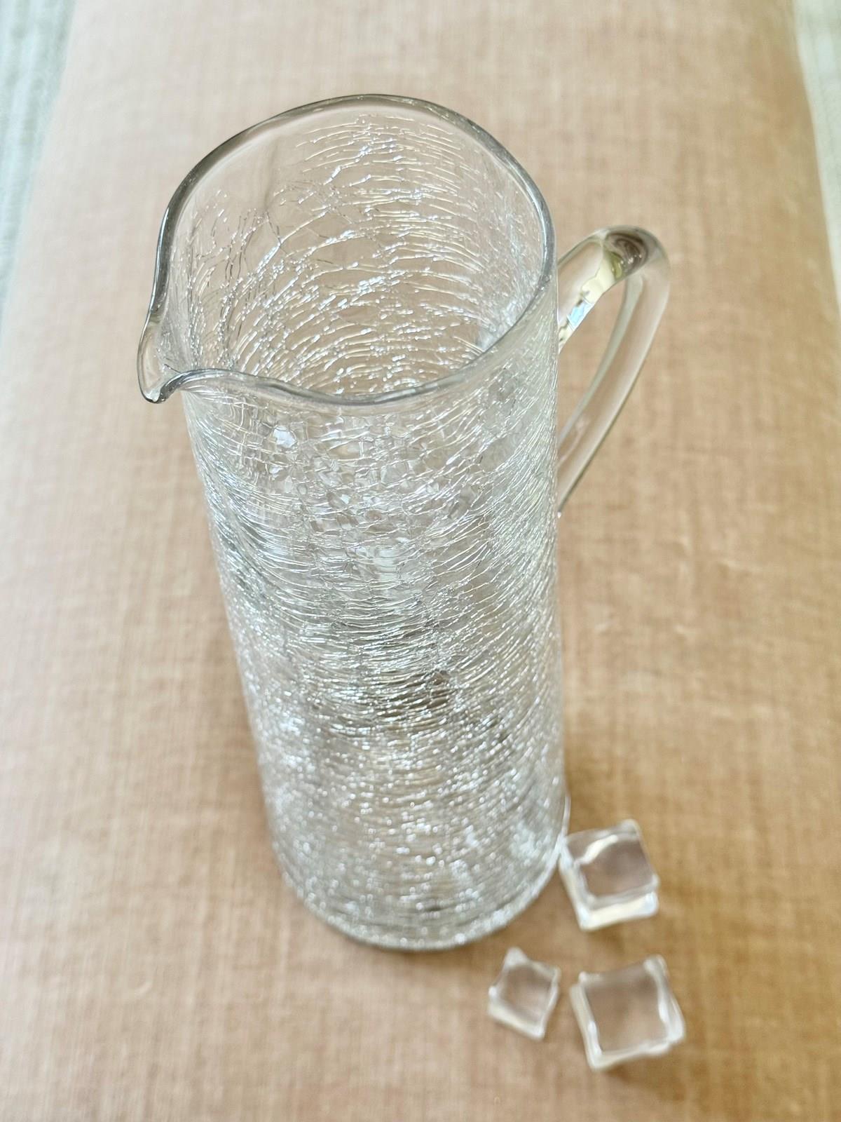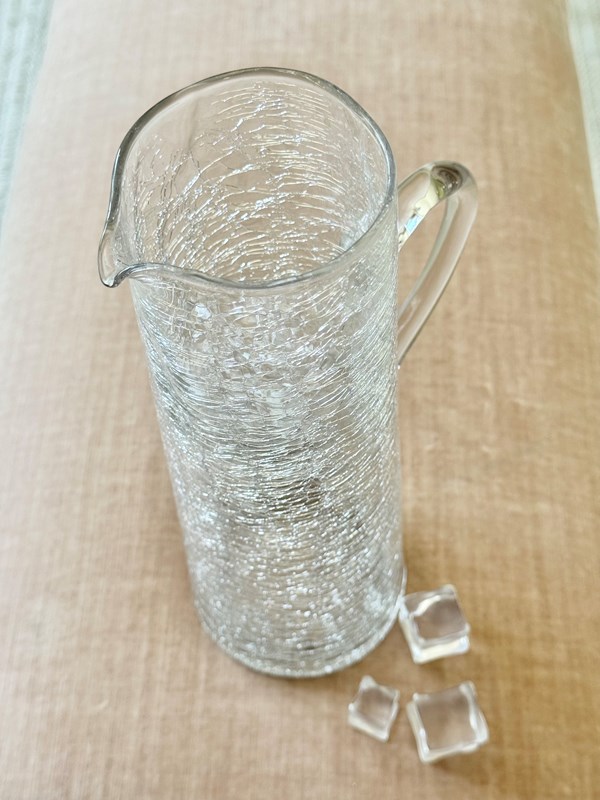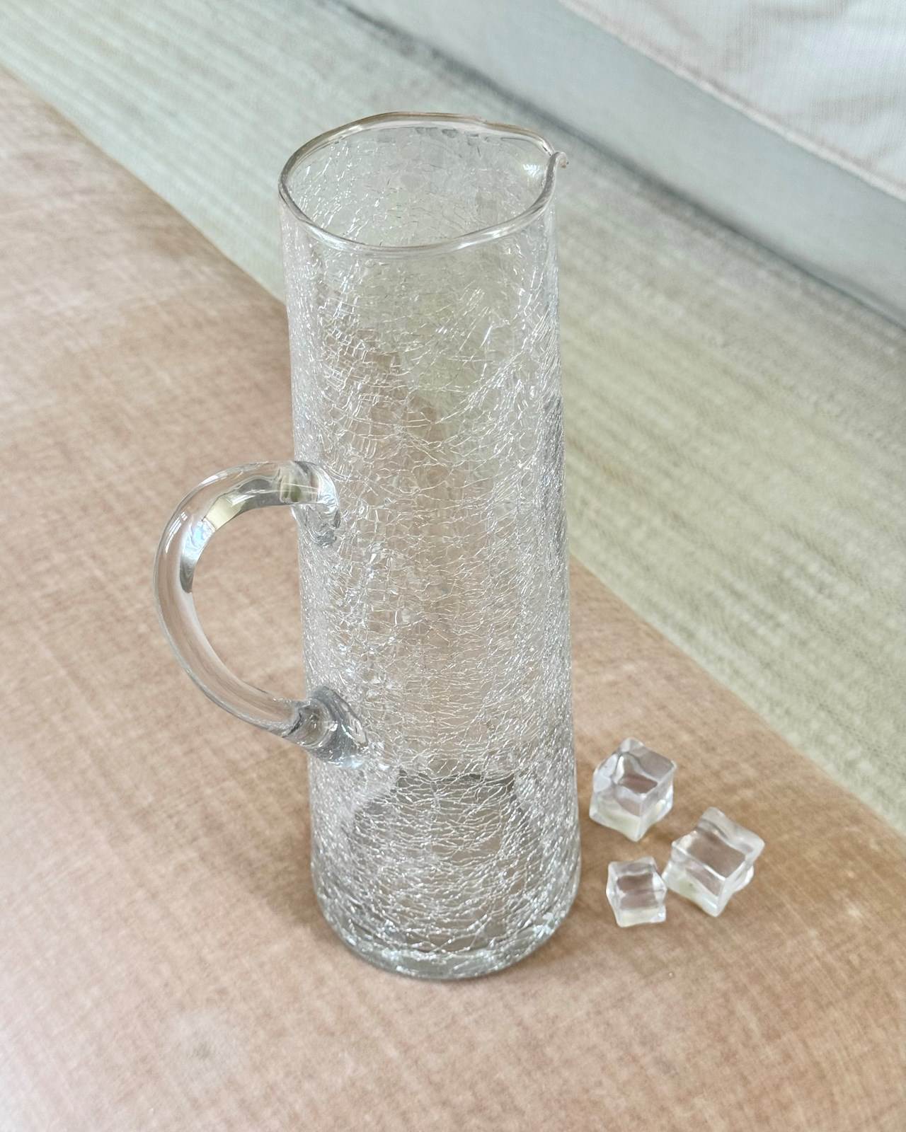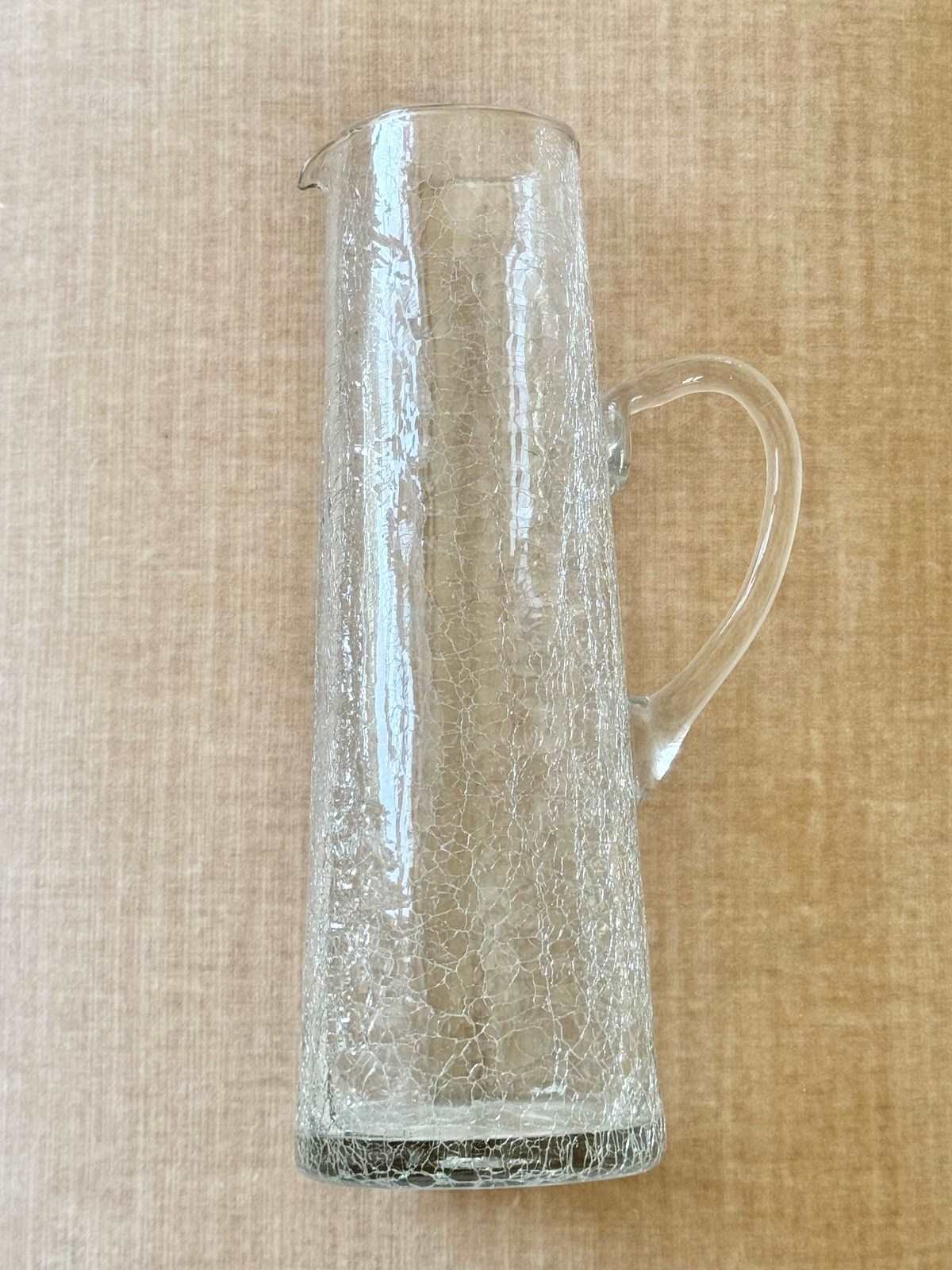 A soaringly tall Belgian crackled glass jug or pitcher with hand applied handle, Circa 1960s. This excellent vintage piece is perfect for everything from cocktails to water.