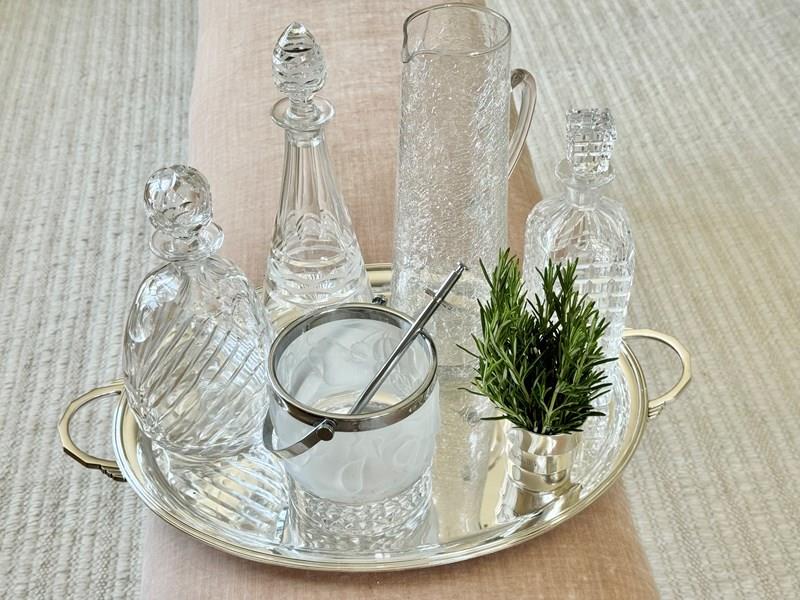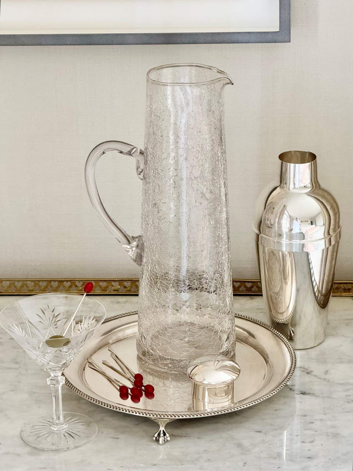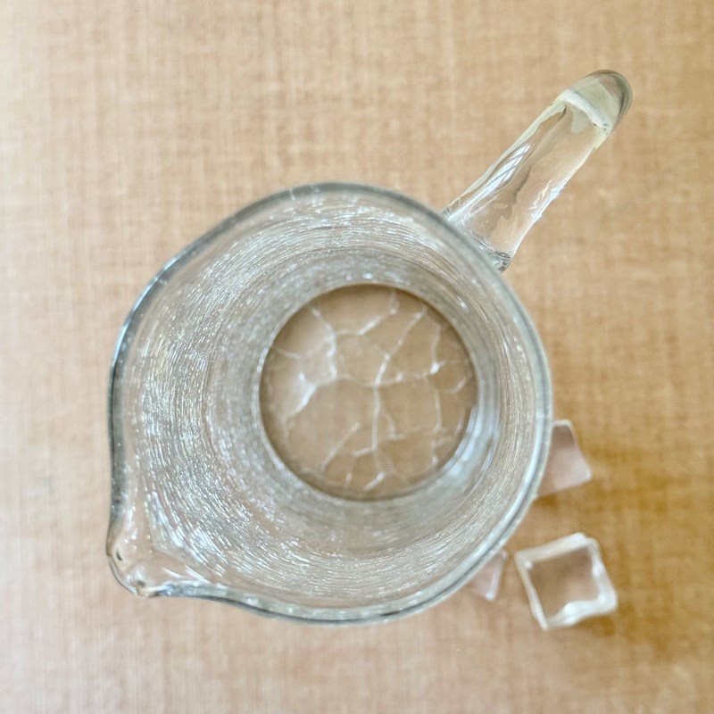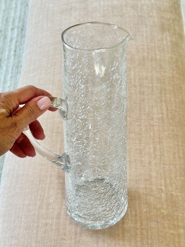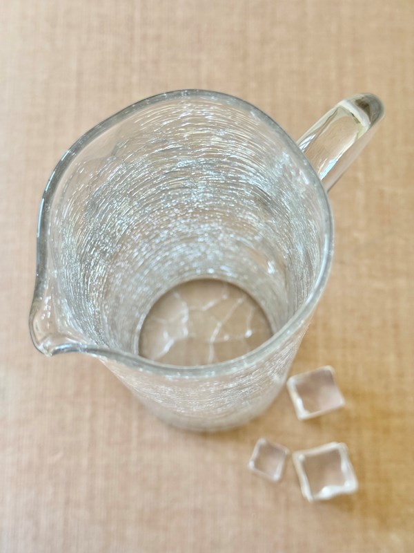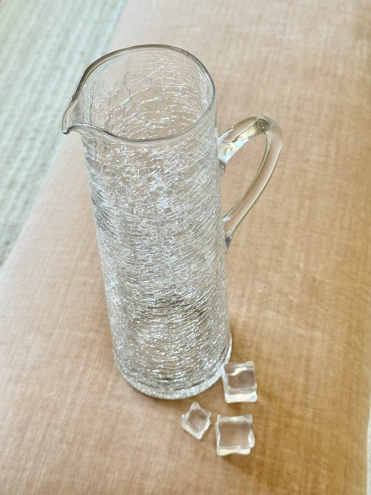 A soaringly tall Belgian crackled glass jug or pitcher with hand applied handle, Circa 1960s. This excellent vintage piece is perfect for everything from cocktails to water.