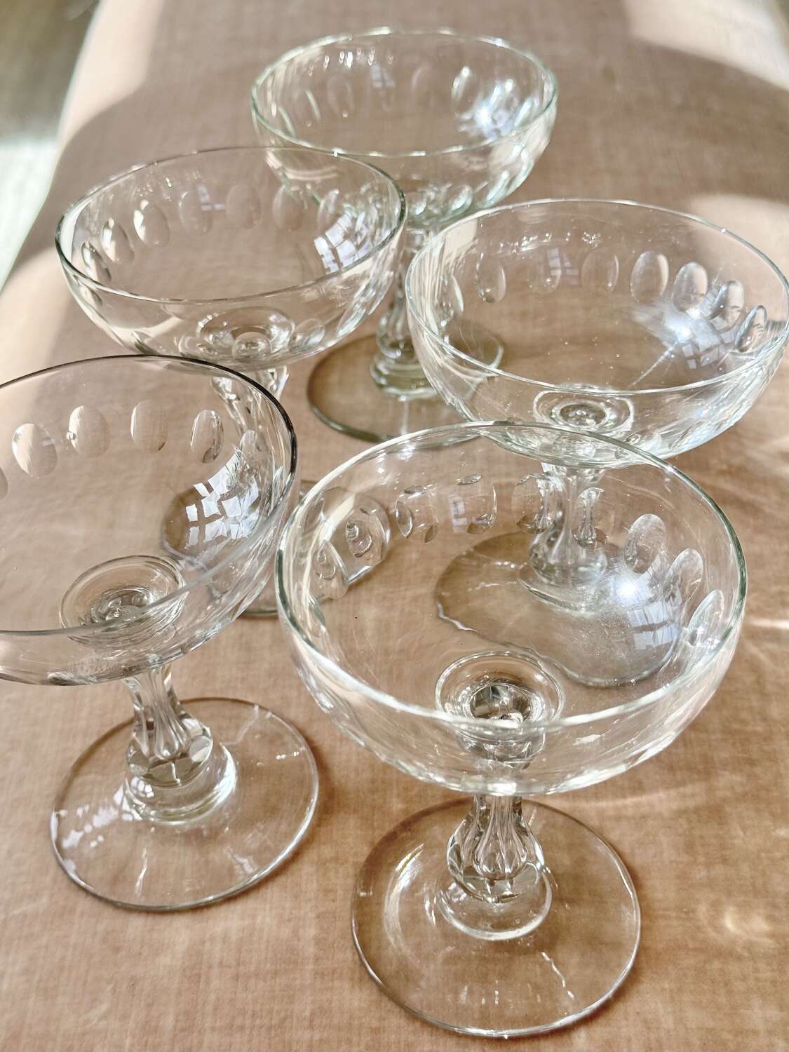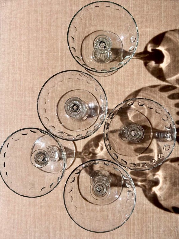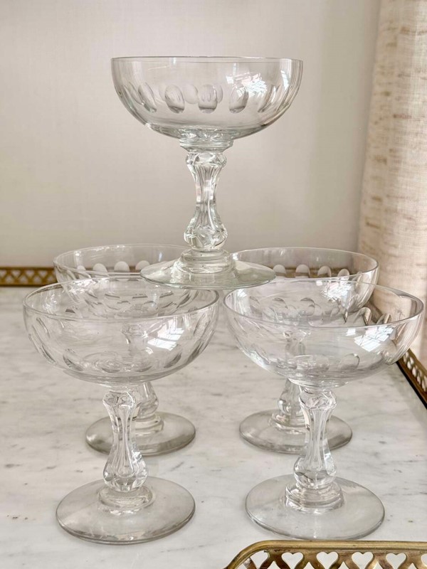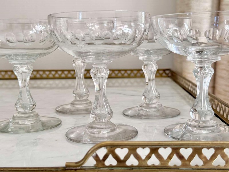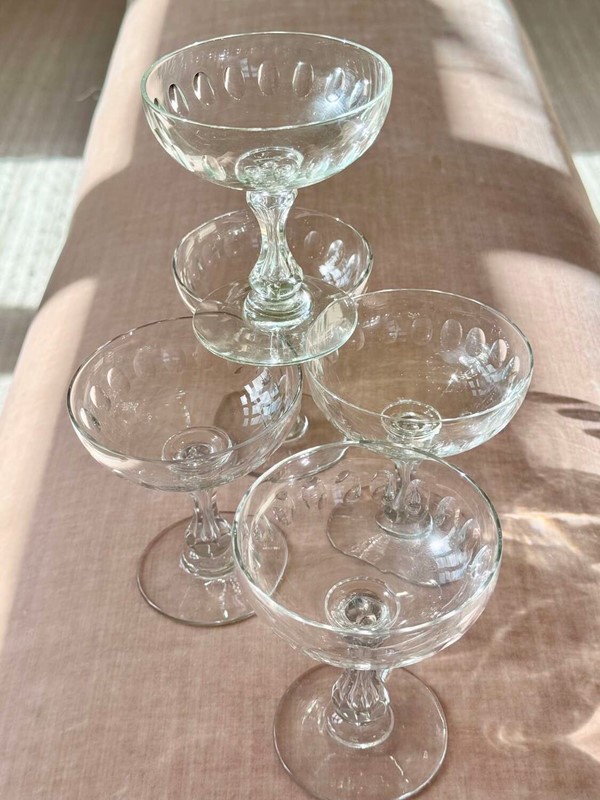 A versatile set of five Val Saint Lambert hand blown air bubble stem champagne or cocktail coupe glasses. These classic design saucers are perfect for everything from champagne to your favourite cocktails, or ever as dessert coupes. Max capacity 140ml.
