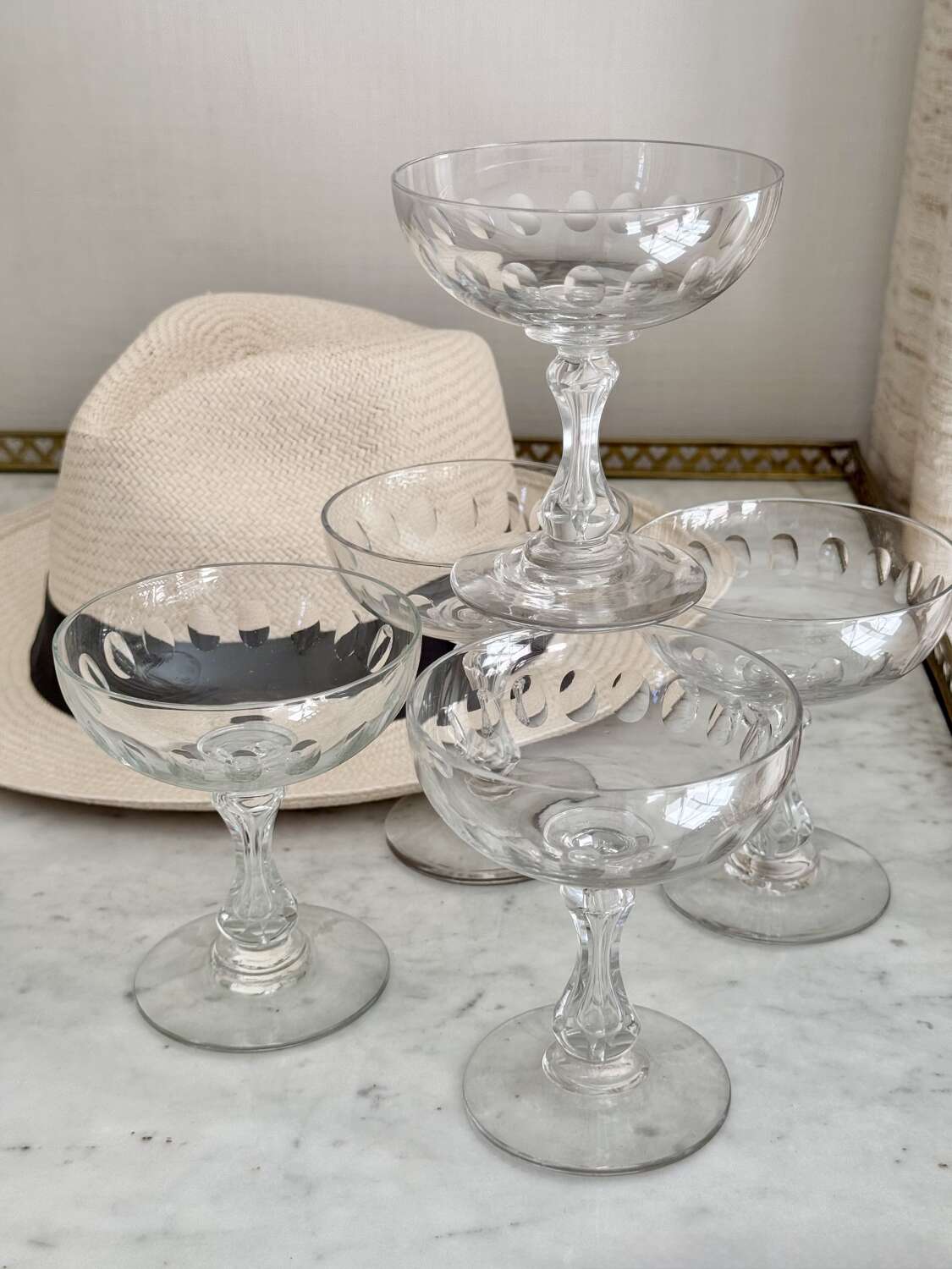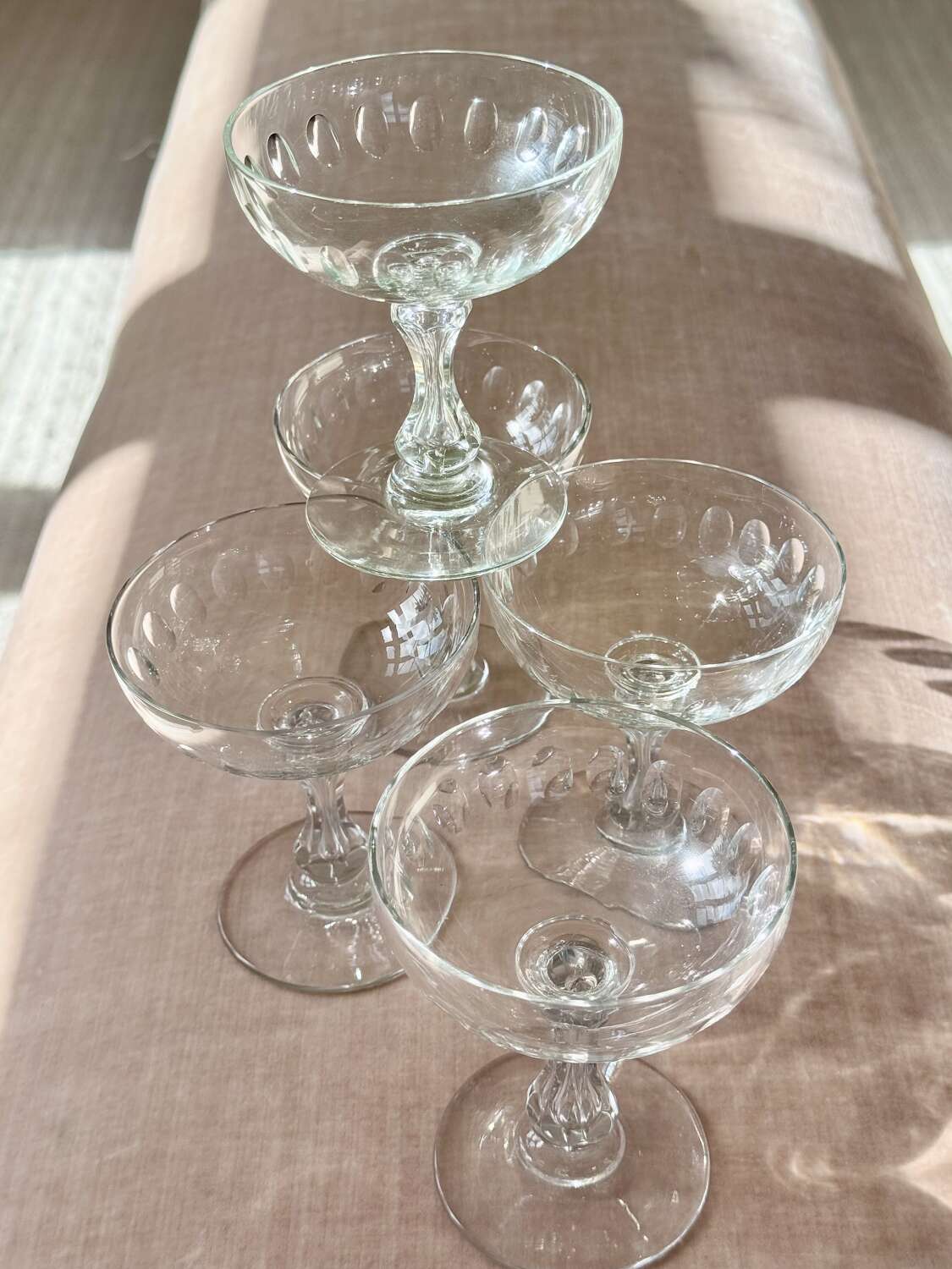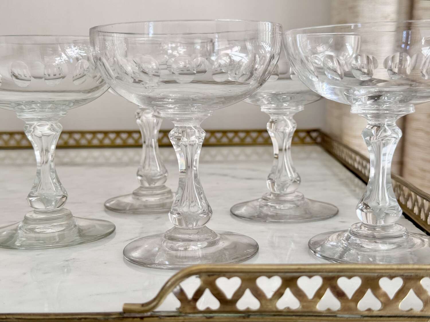 A versatile set of five Val Saint Lambert hand blown air bubble stem champagne or cocktail coupe glasses. These classic design saucers are perfect for everything from champagne to your favourite cocktails, or ever as dessert coupes. Max capacity 140ml.