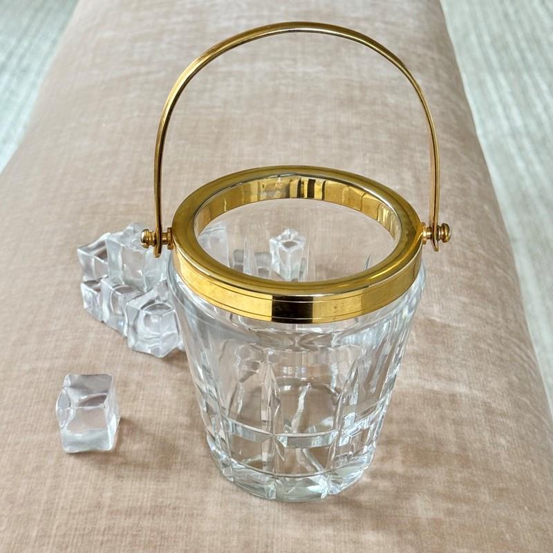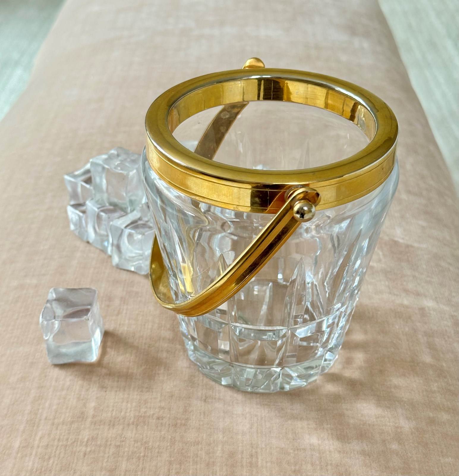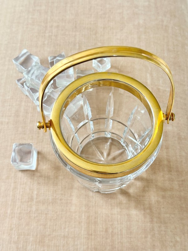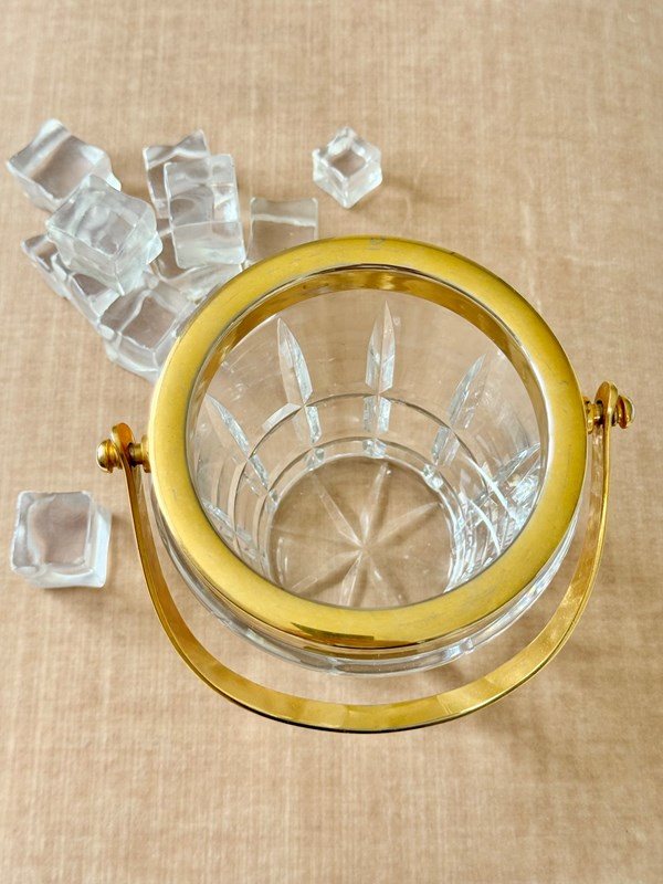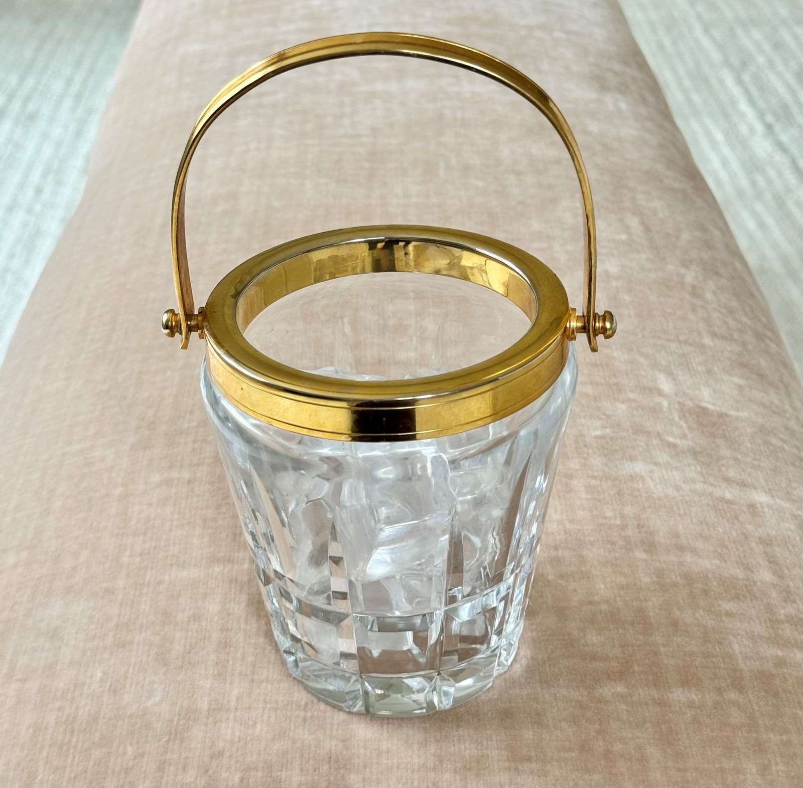 An exceedingly smart heavy cut crystal ice bucket with gold plated mount and swing handle, Circa 1960 by Val Saint Lambert. Superb quality as expected from this internationally recognised luxury maker, this excellent ice bucket is perfect for the home bar.