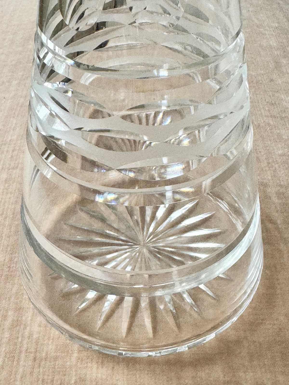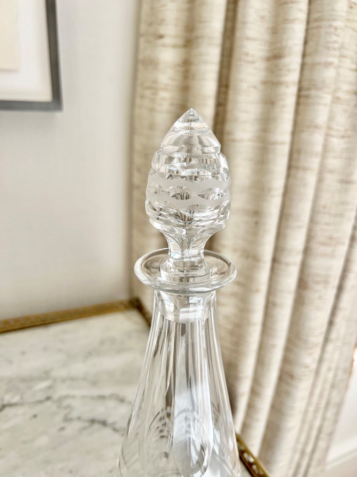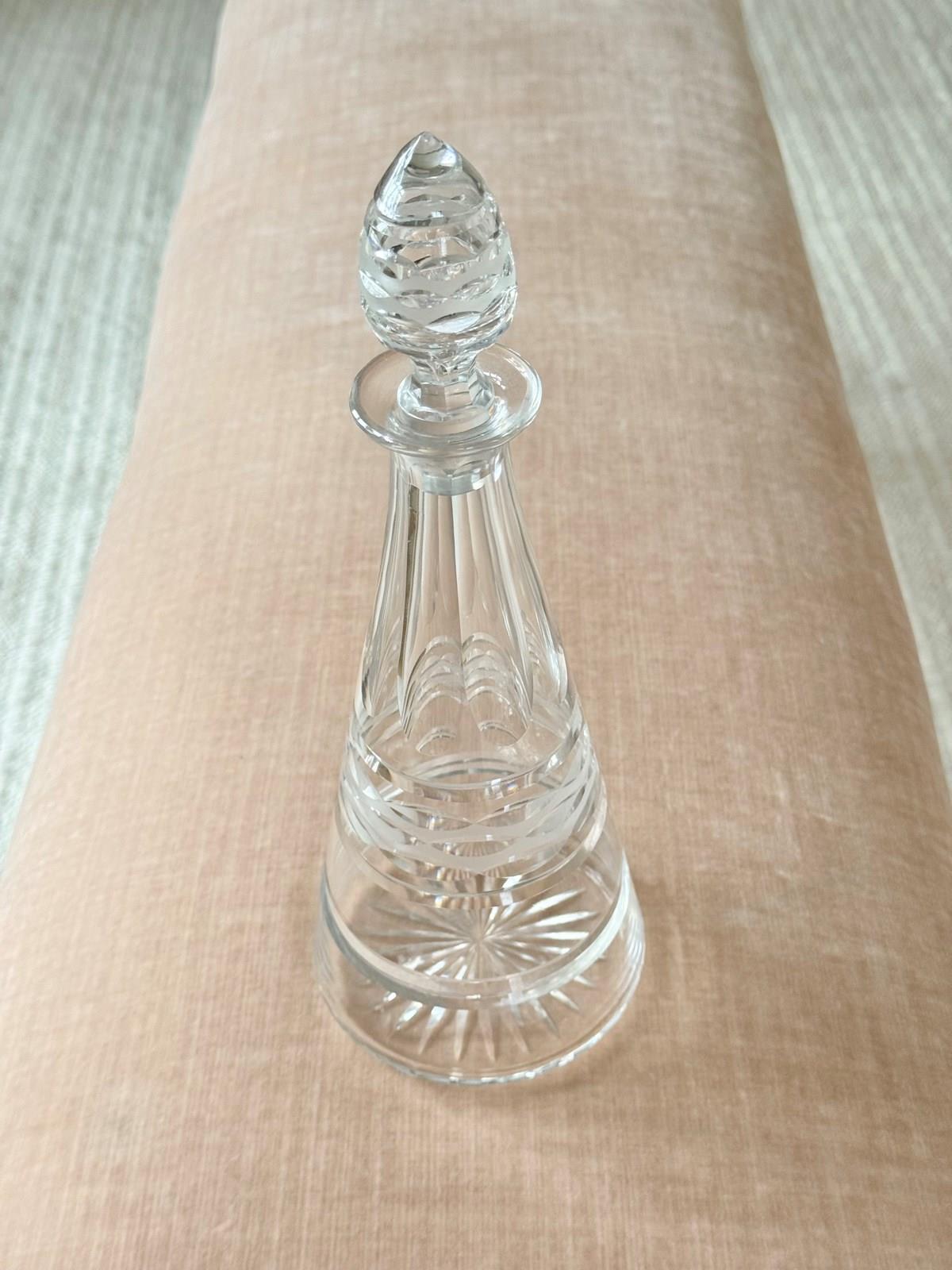 A fine vintage crystal decanter with etched makers mark to the base for Fortnum & Mason, Piccadilly London, Circa 1970s. This superb cut glass decanter has been beautifully hand cut and frosted, has a star cut base and is topped by an unusual Acorn design stopper.