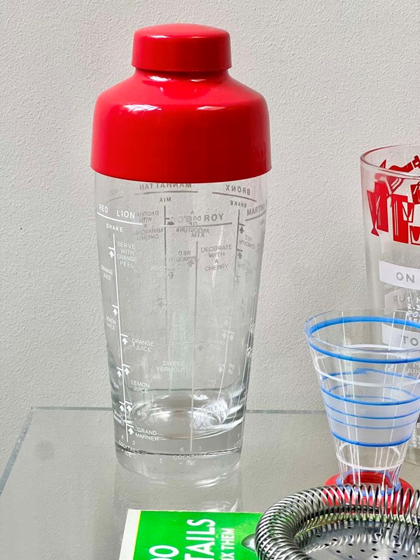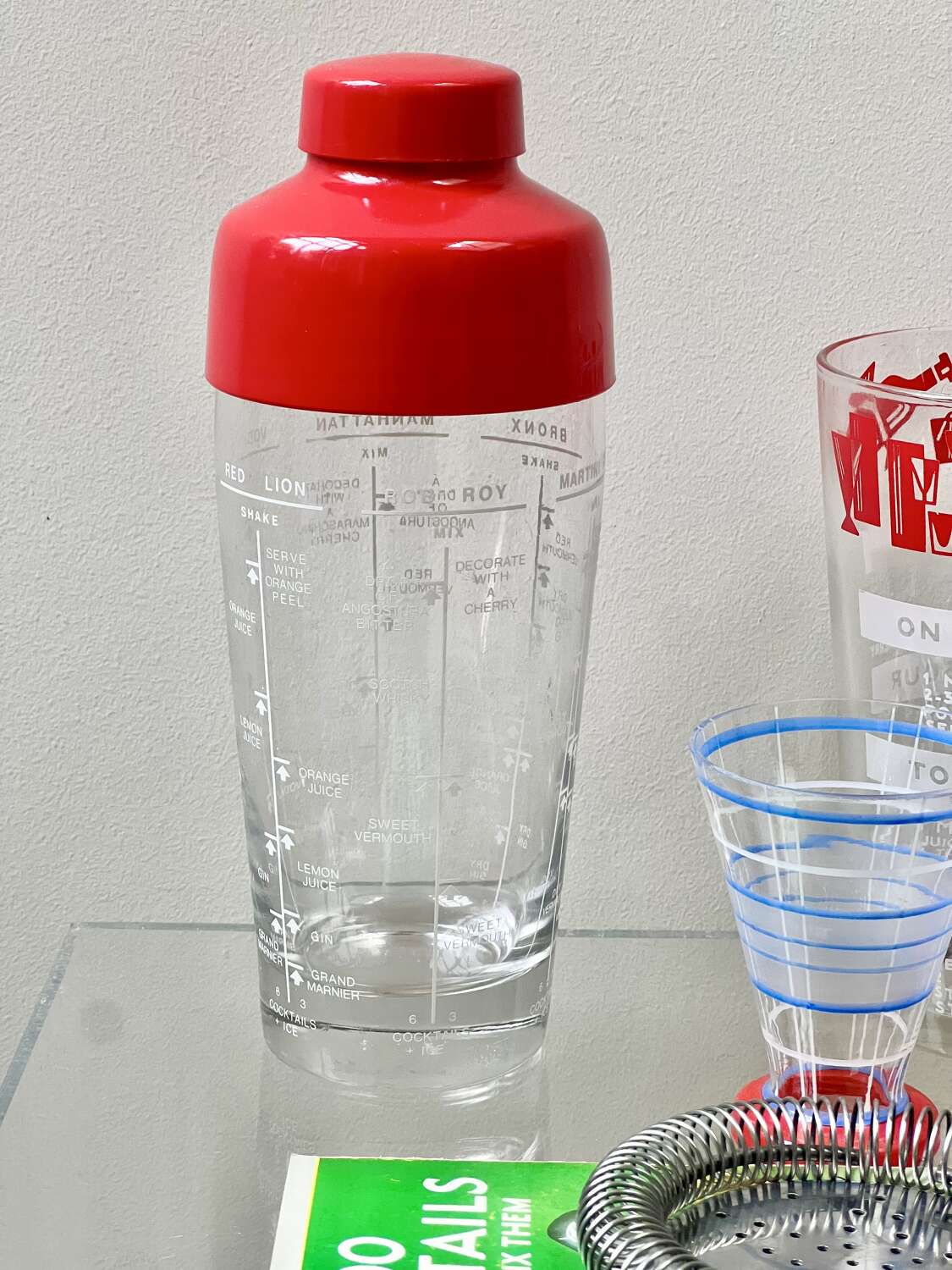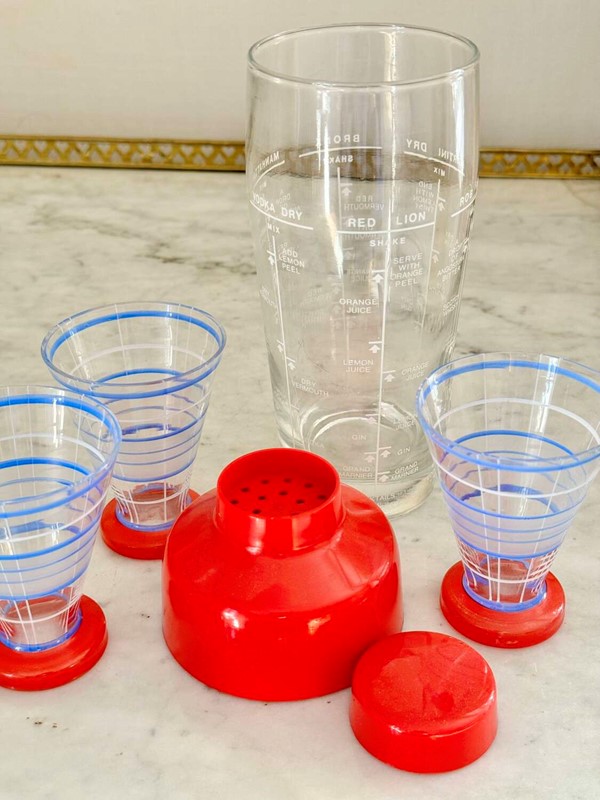 A fun vintage red lucite and glass cocktail shaker with white enamelled cocktail recipes around the side along with three original cocktail tumblers, all Circa 1960s