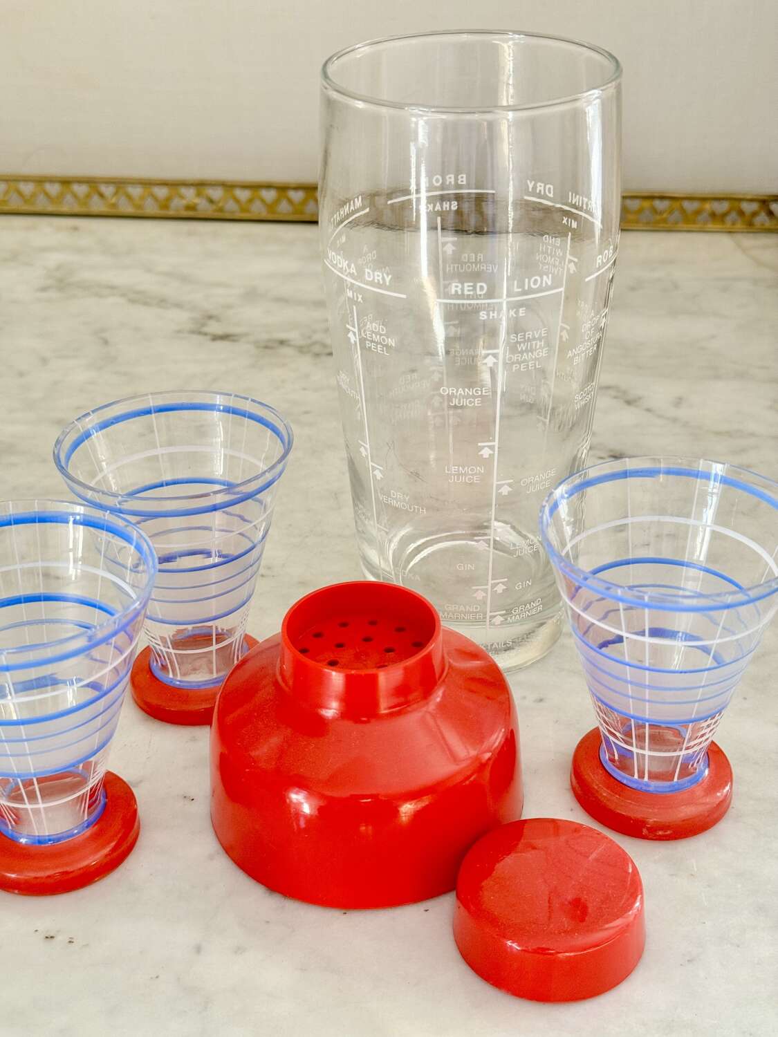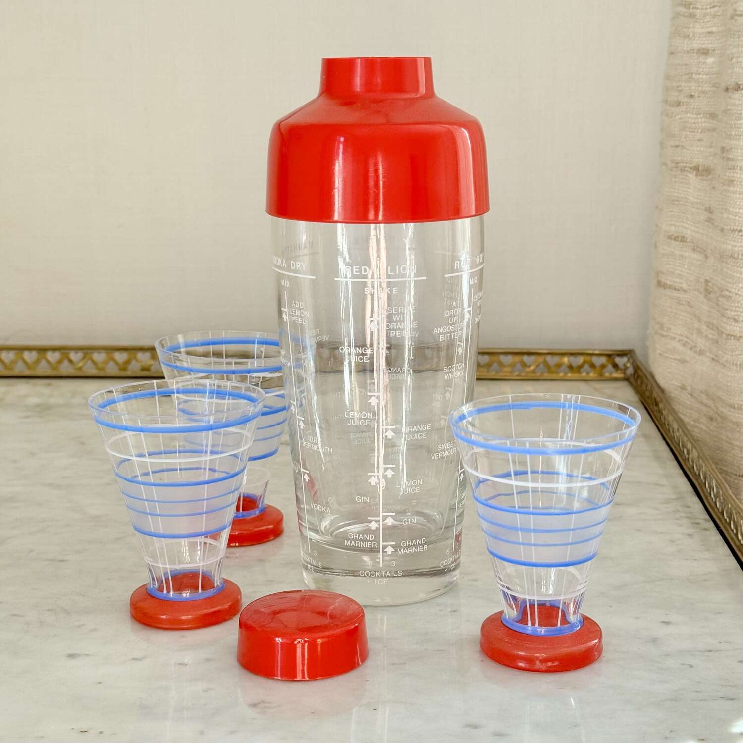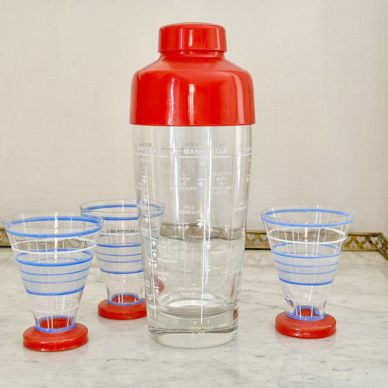 Vintage Red Lucite & Glass Recipe Cocktail Shaker & Tumblers Set
