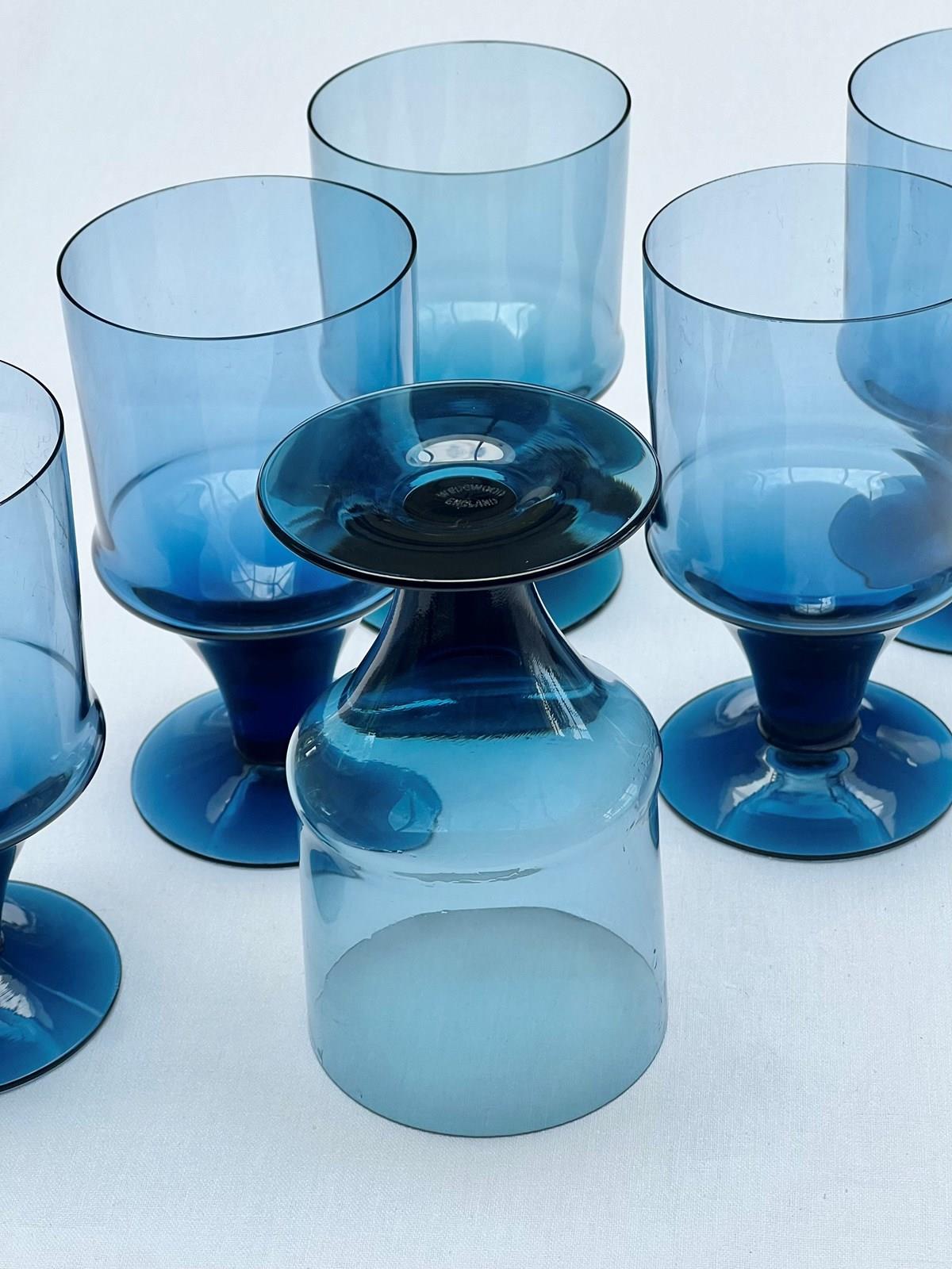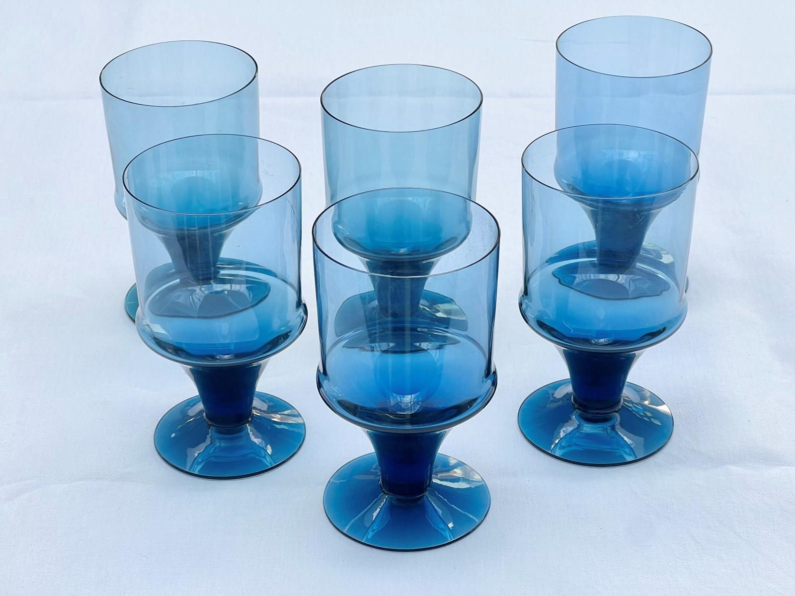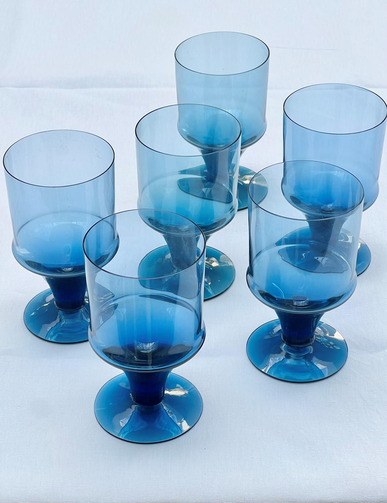 A stunning set of six extra large blue wine or water goblet glasses by Ronald Stennett-Wilson for Wedgewood, Circa 1970s. These versatile glasses are large enough to hold a max capacity of 385ml. Etched Wedgwood to base.
