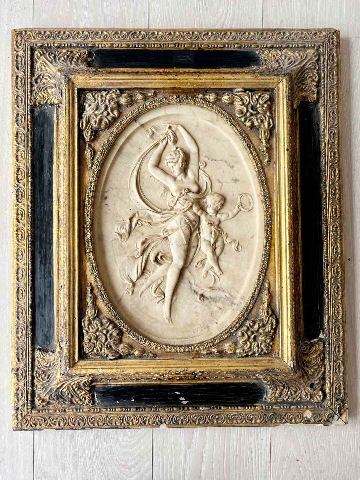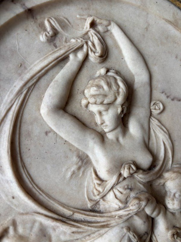 With a scene of a Classical maiden and cherub in billowing robes and holding harps