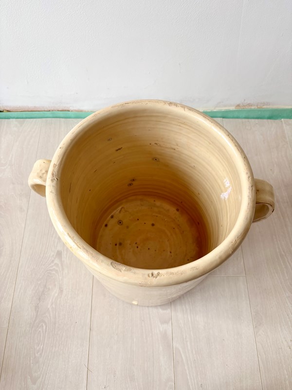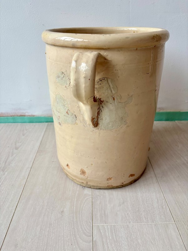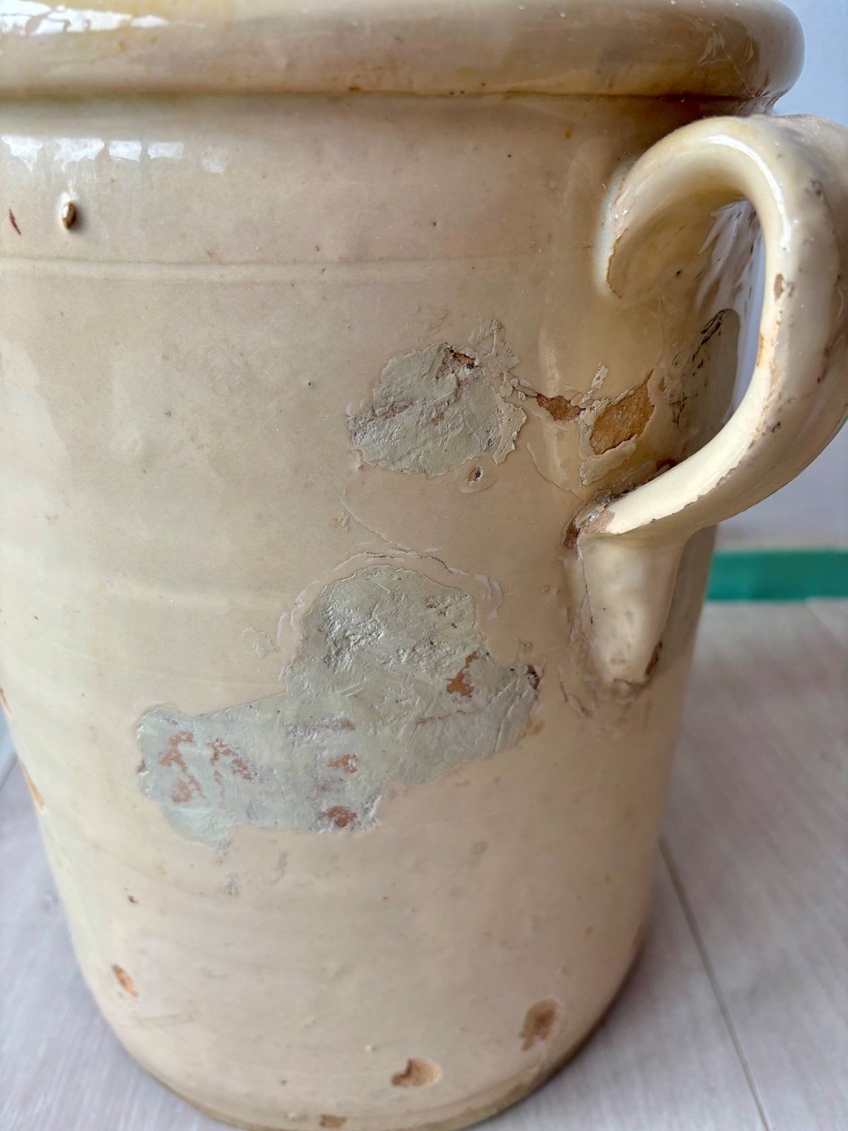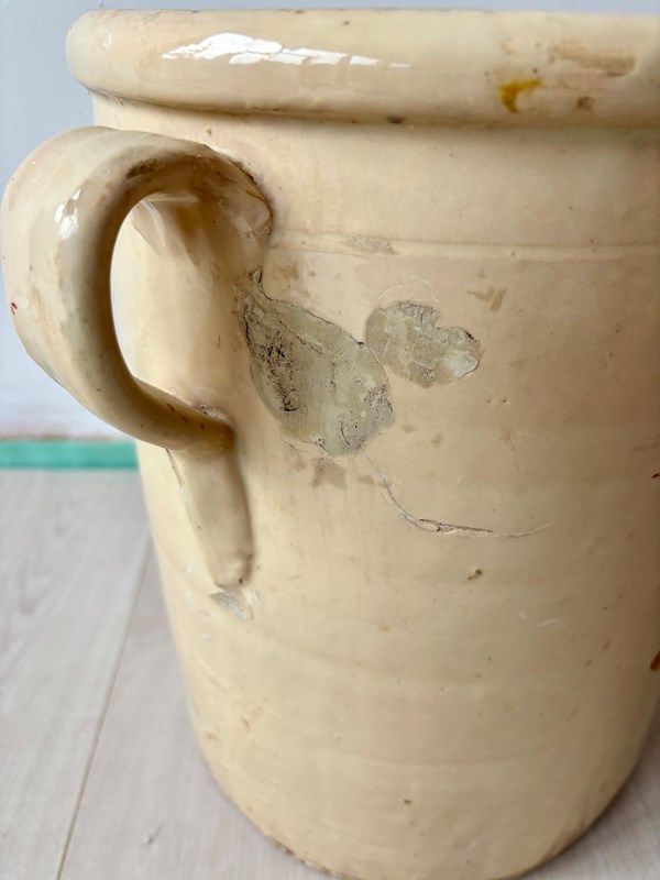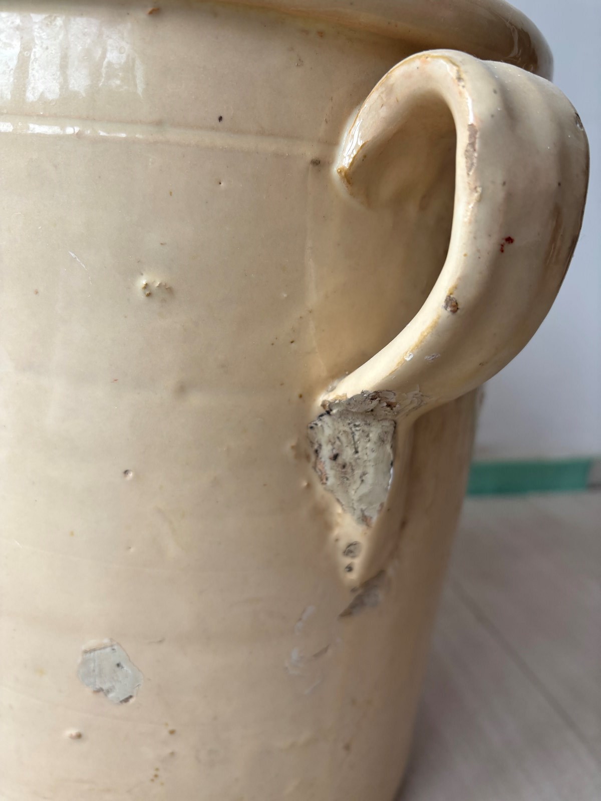 As large as they come, a beautiful 19th century creamy white Italian glazed confit pot from Puglia. Originally used for preserving foods including anchovies, sardines & olives in olive oil. Pictures taken from every angle to show the various markings and chippings on the glaze (in keeping with age and use!). Please note old repairs around the handles