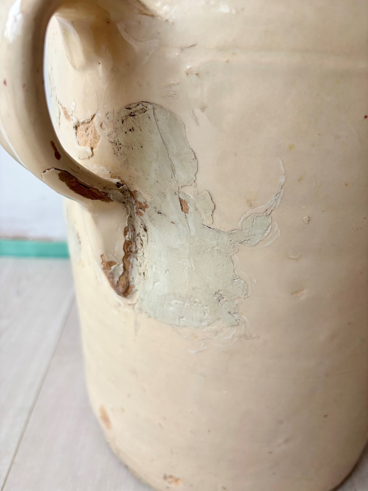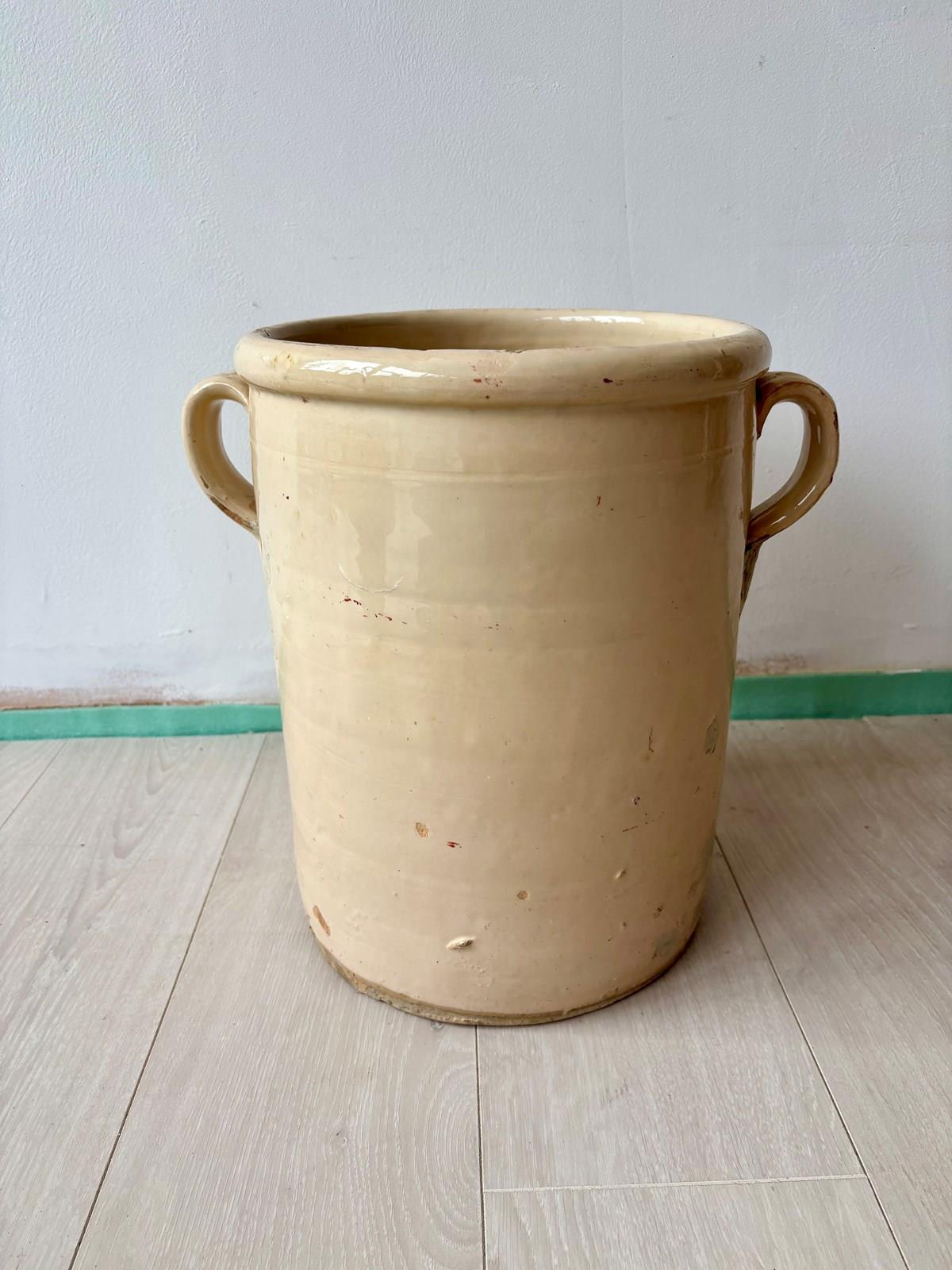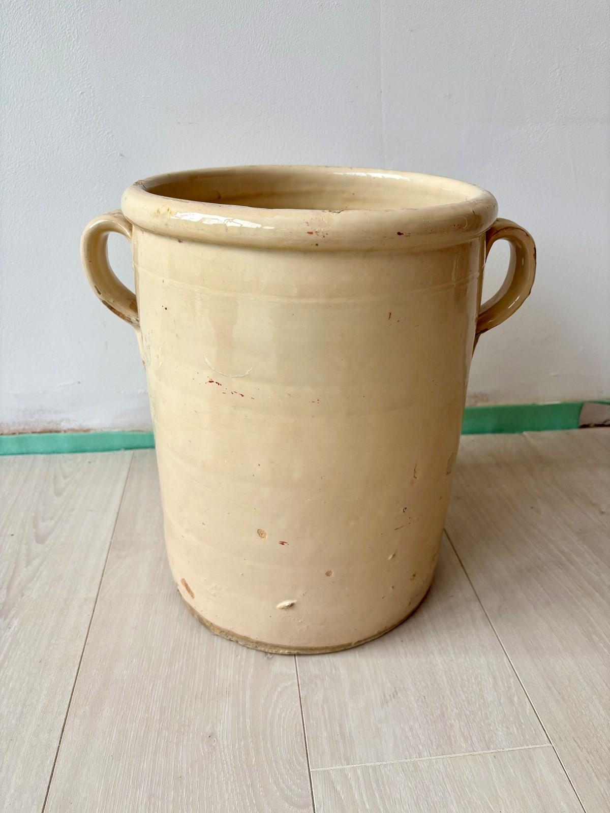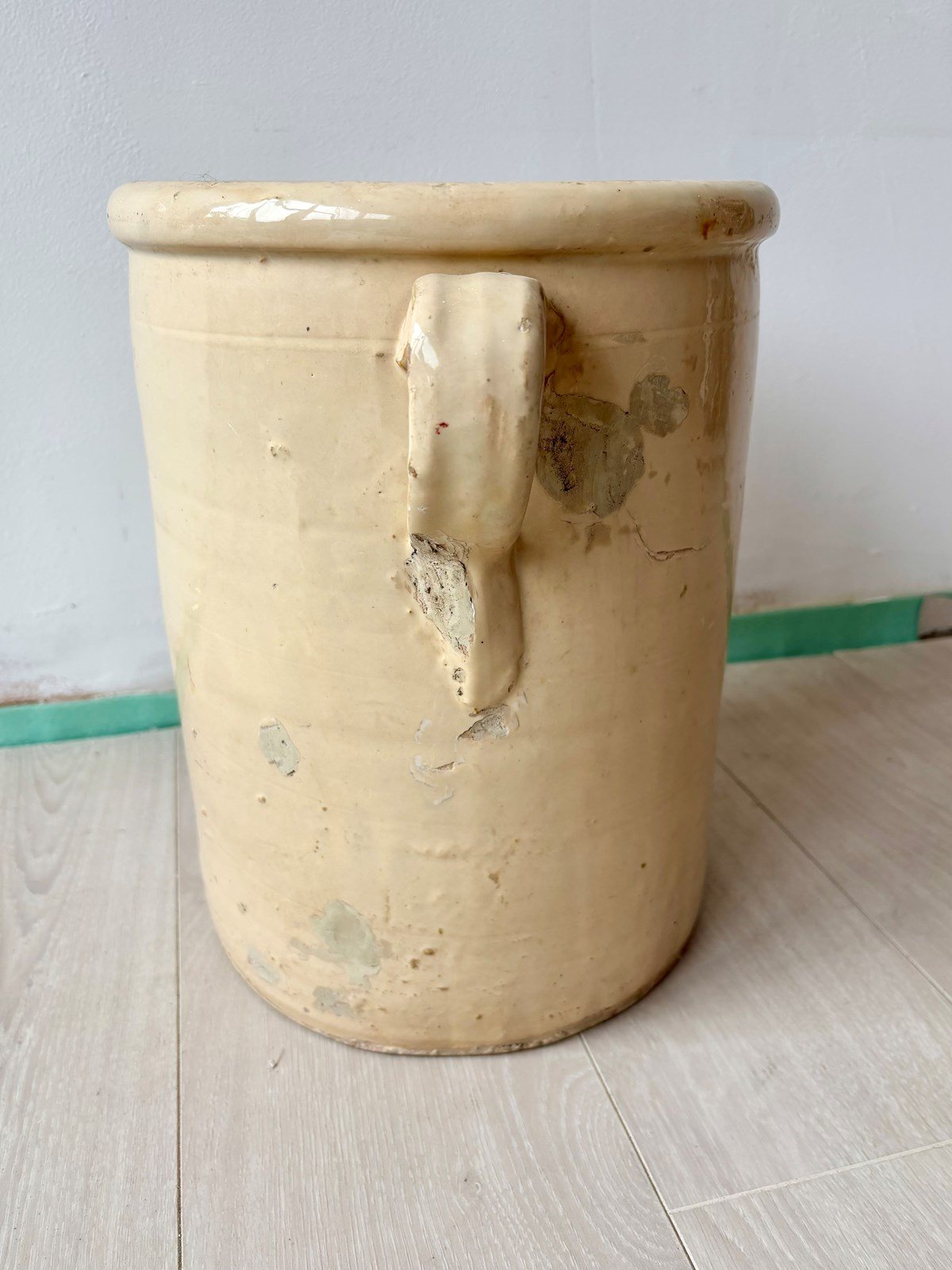 As large as they come, a beautiful 19th century creamy white Italian glazed confit pot from Puglia. Originally used for preserving foods including anchovies, sardines & olives in olive oil. Pictures taken from every angle to show the various markings and chippings on the glaze (in keeping with age and use!). Please note old repairs around the handles