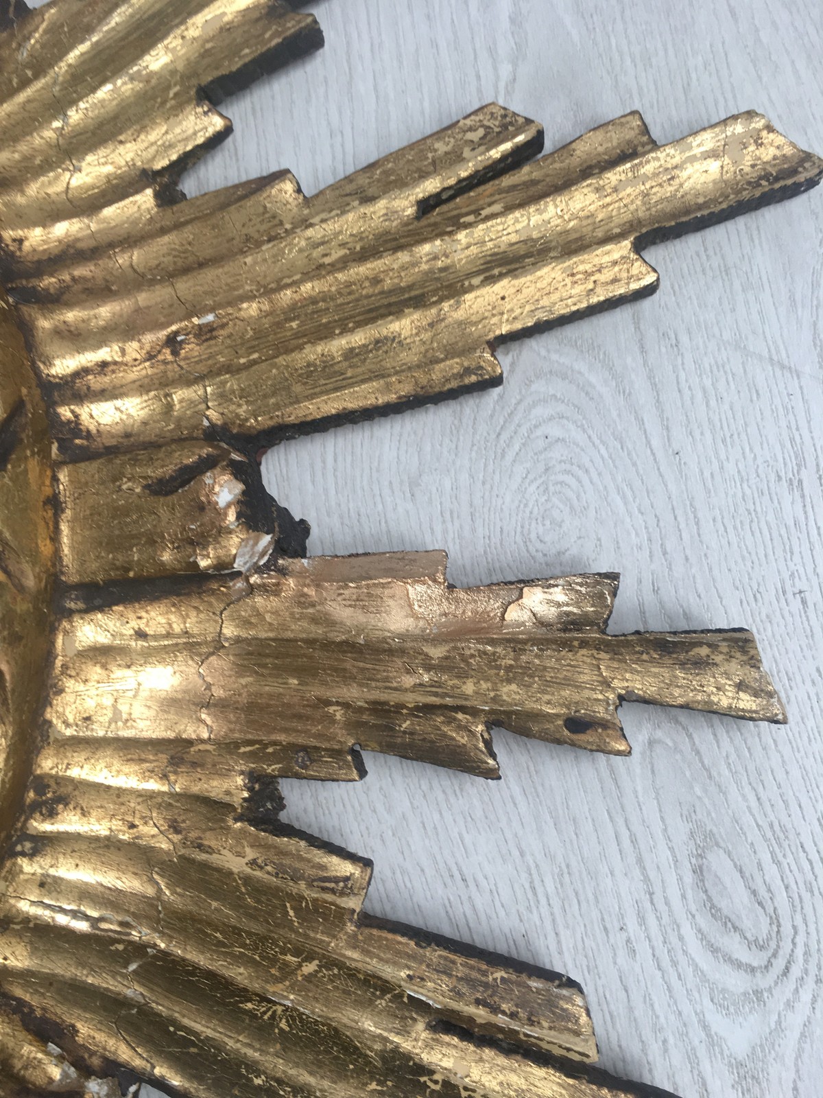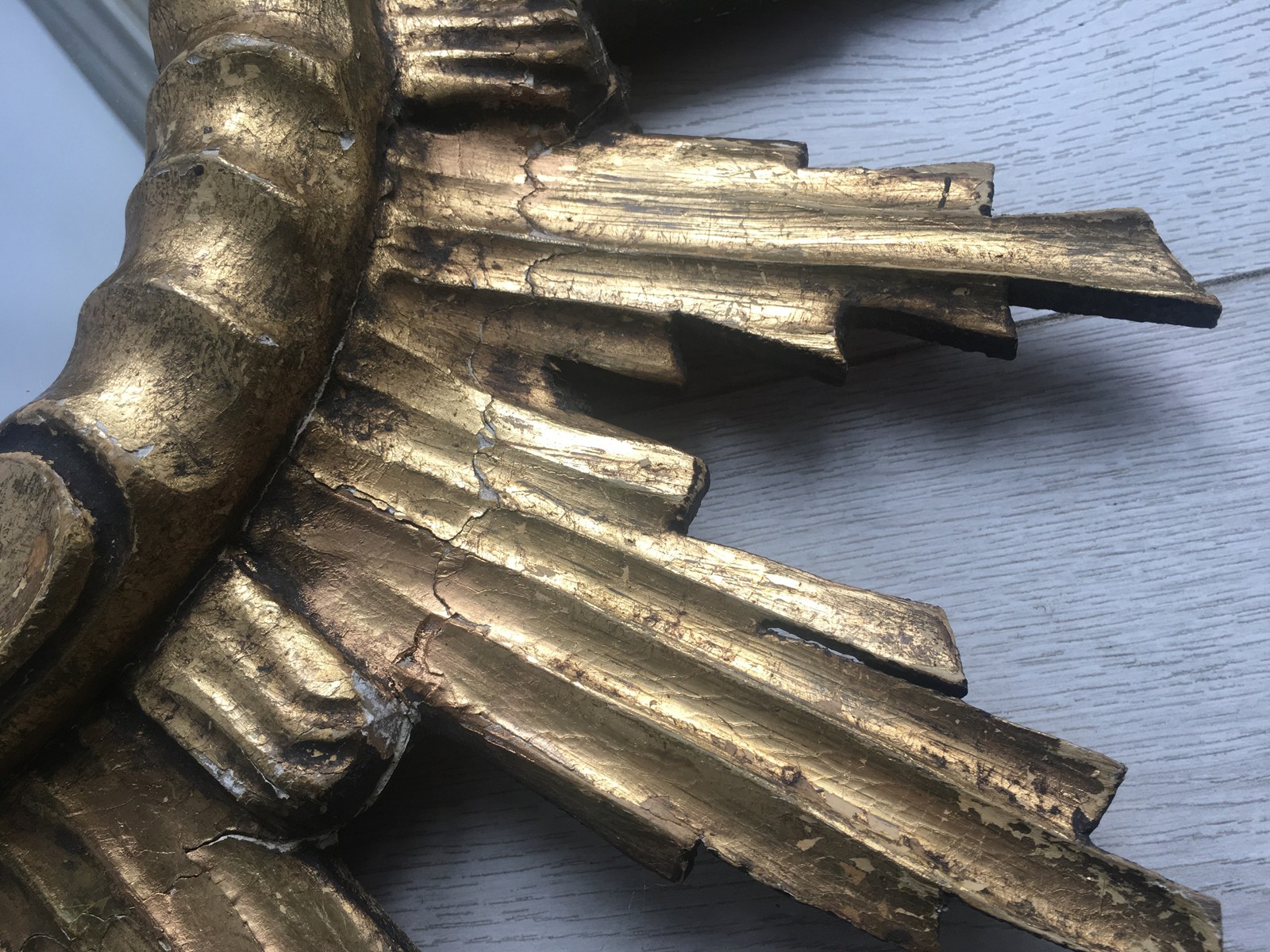 Lovely shape to this giltwood sunburst mirror c1950. Some cracking/repairs to the frame (please see close up images) but overall a lovely looking mirror.