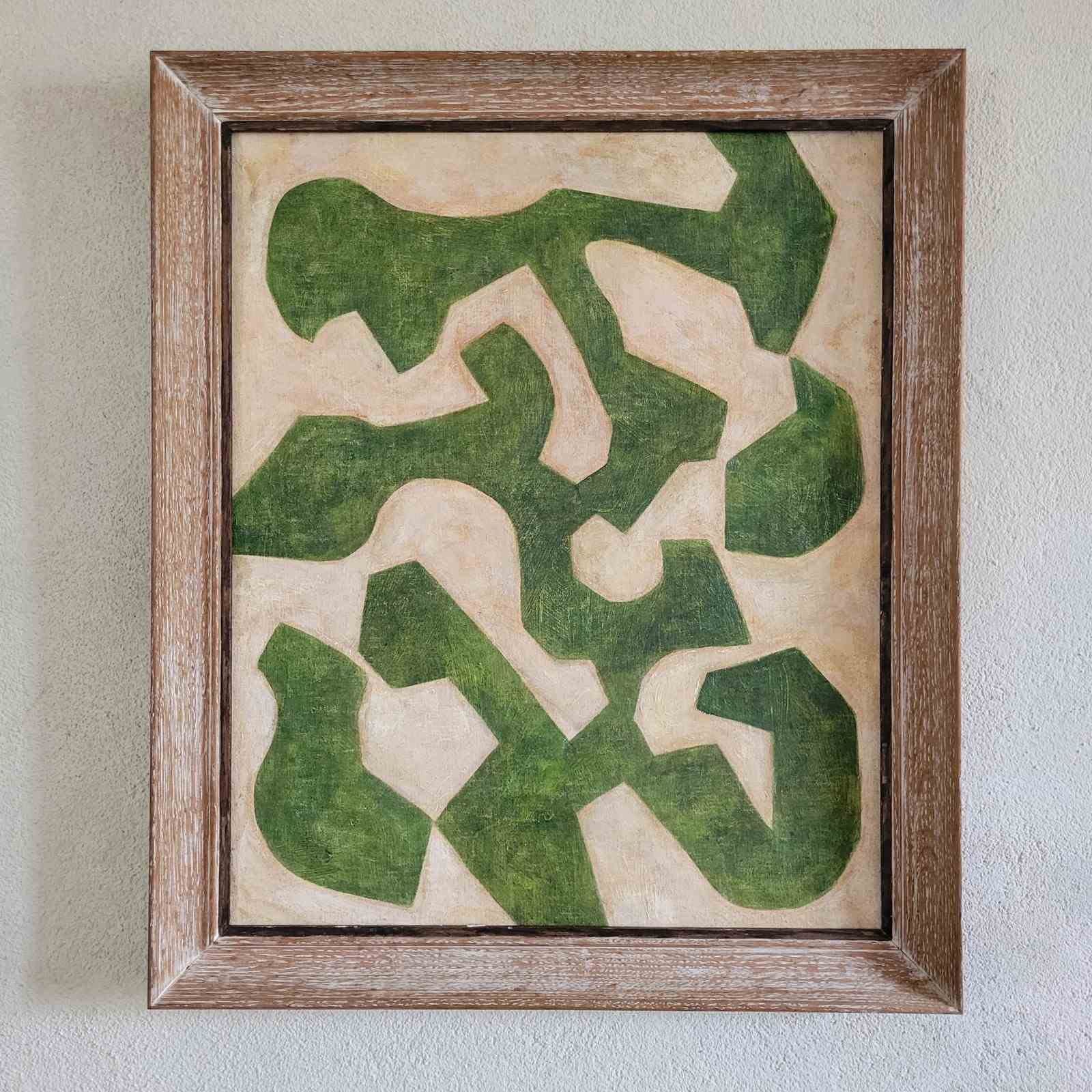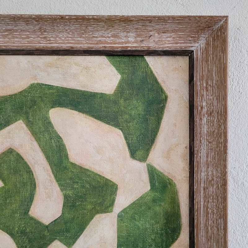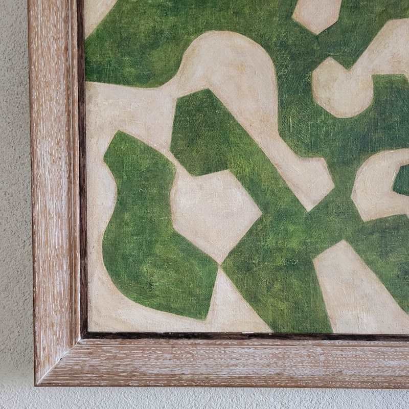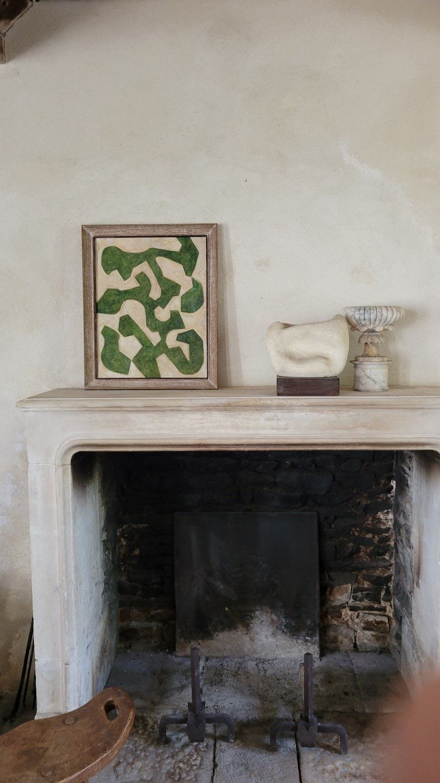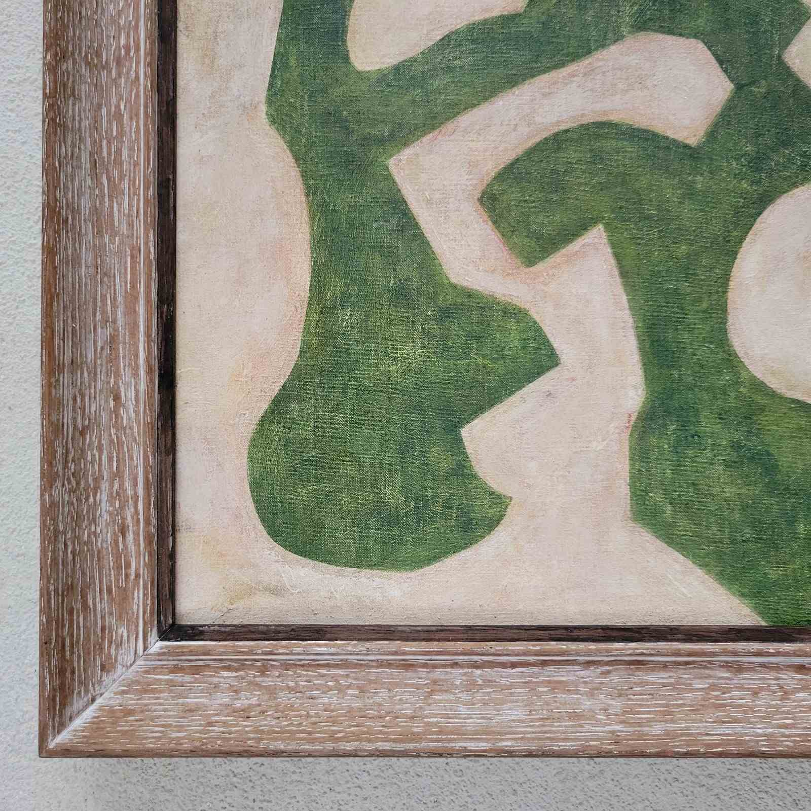 A contemporary painting dated 2025 by Stuart MacLeod, the creative behind tour de source. Painted on reclaimed French linen, using inks, paints and stains, the works feature a connectivity between architectural and organic form. Painted in his Normandy studio, and presented in a vintage French frame. Size 57 x 47cm including frame.