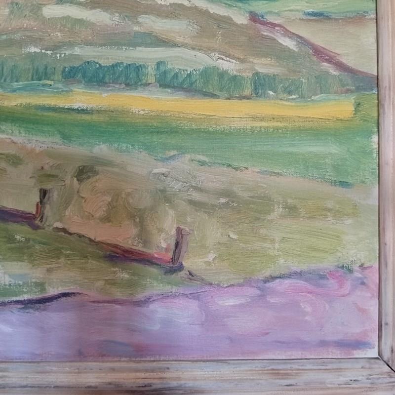 A lovely expressionist landscape from Denmark, signed EM and dated 1951. Painted in oil on carvas, with loose and dramatic use of colour and brushwork, showing fields, farm buildings, trees, and a moody sky. With a distressed original vintage frame, the painting is well coloured and perfect for either a traditional or eclectic interior.