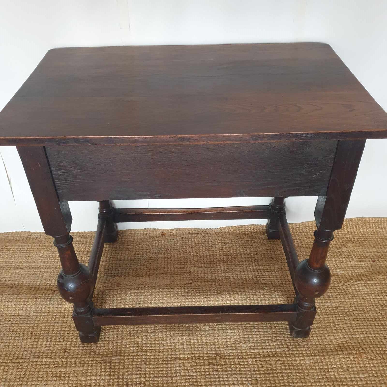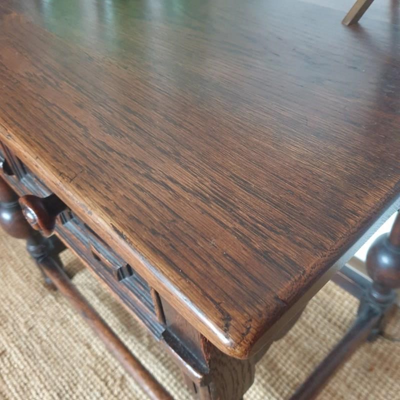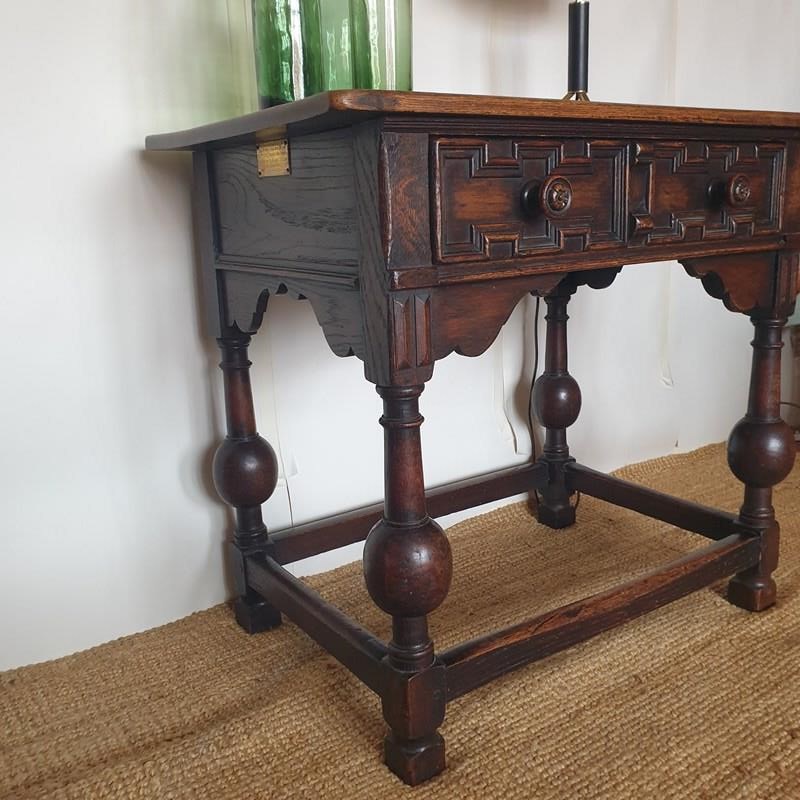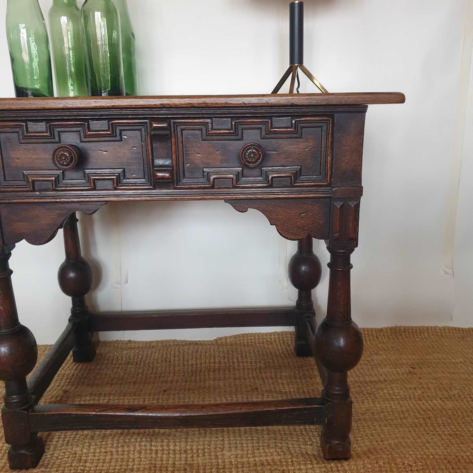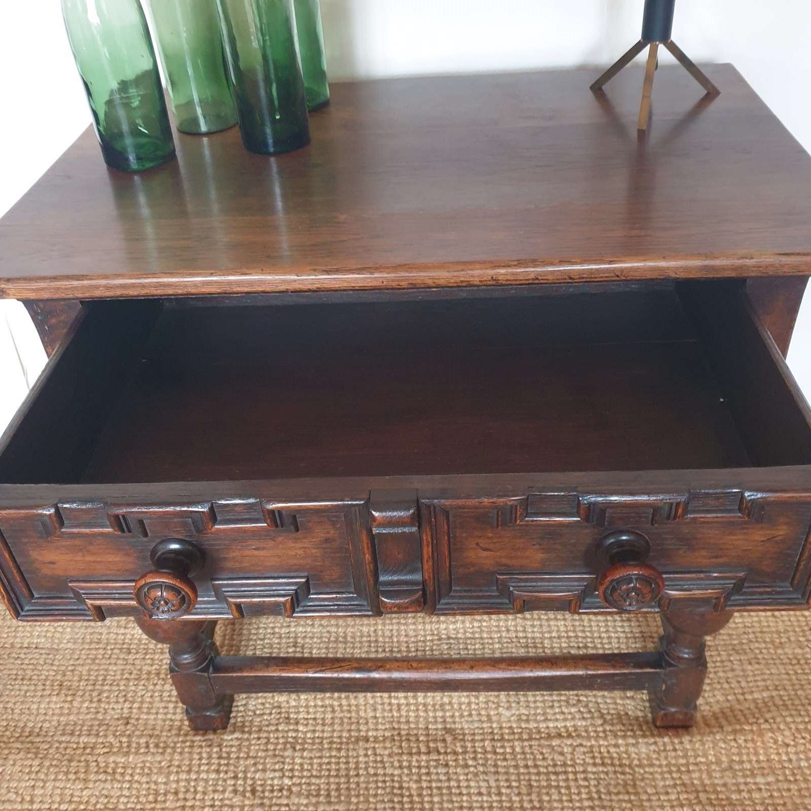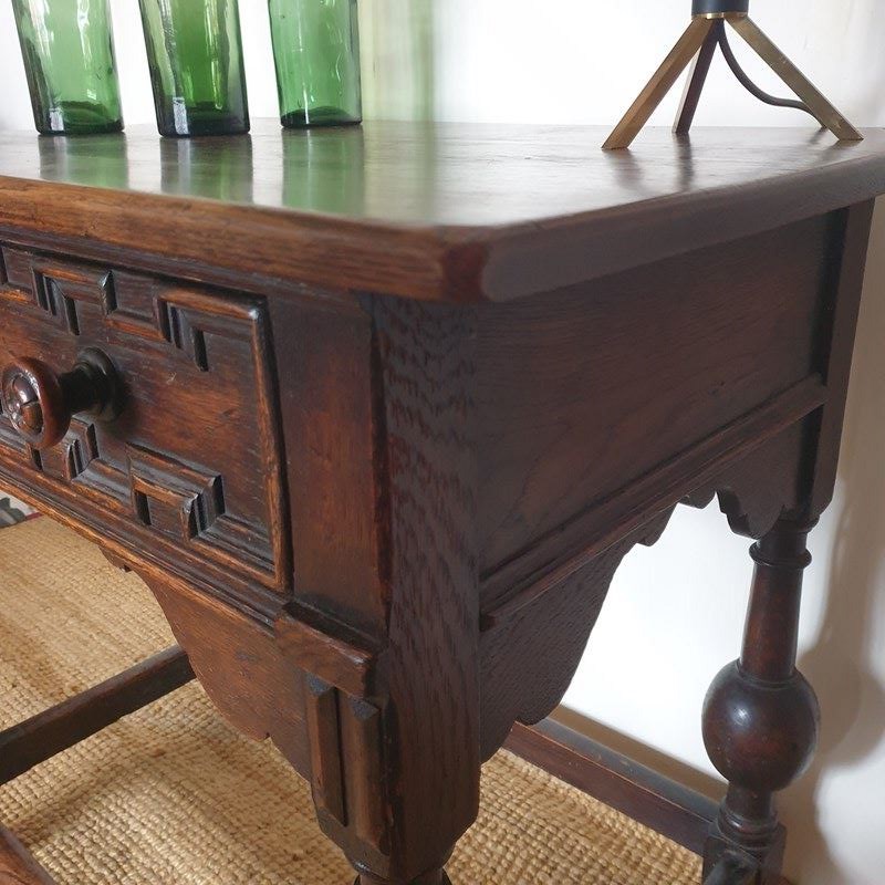 A great proportioned and detailed, decorative console table in a Baroque Flemish 17th century style. The table was probably made in the early 20th century , and has a wonderful raised graphic design to the drawer, and fabulous bulbous turned banister legs. With a very good patina and colour, this would be amazing in a hallway or living / bedroom, with the design complementing a traditional or eclectic home. In very good condition.