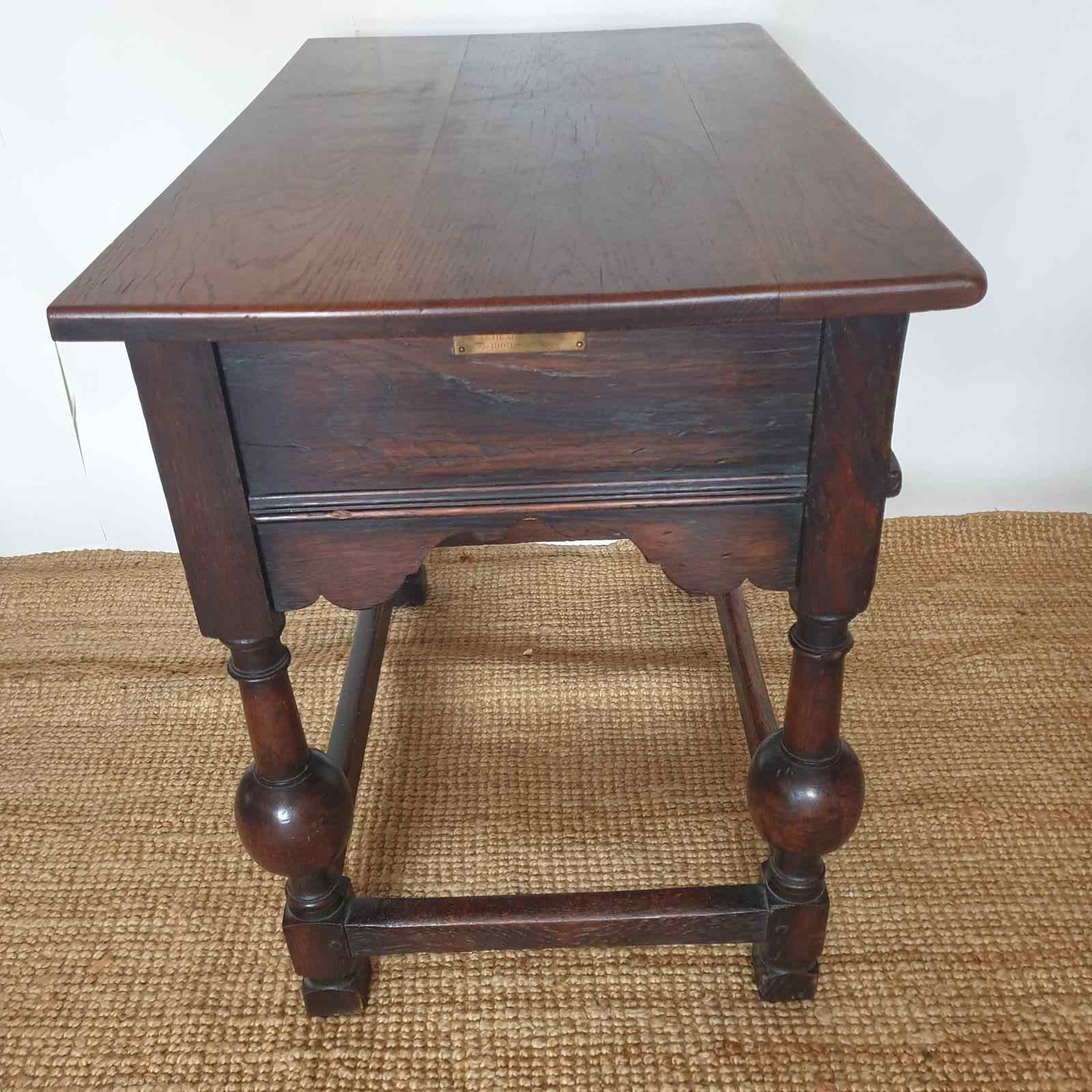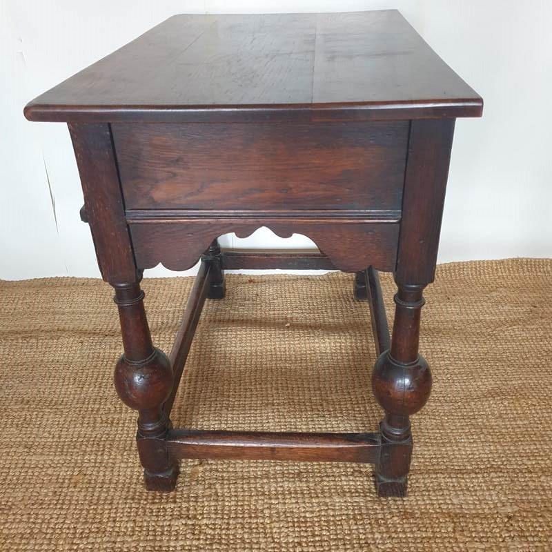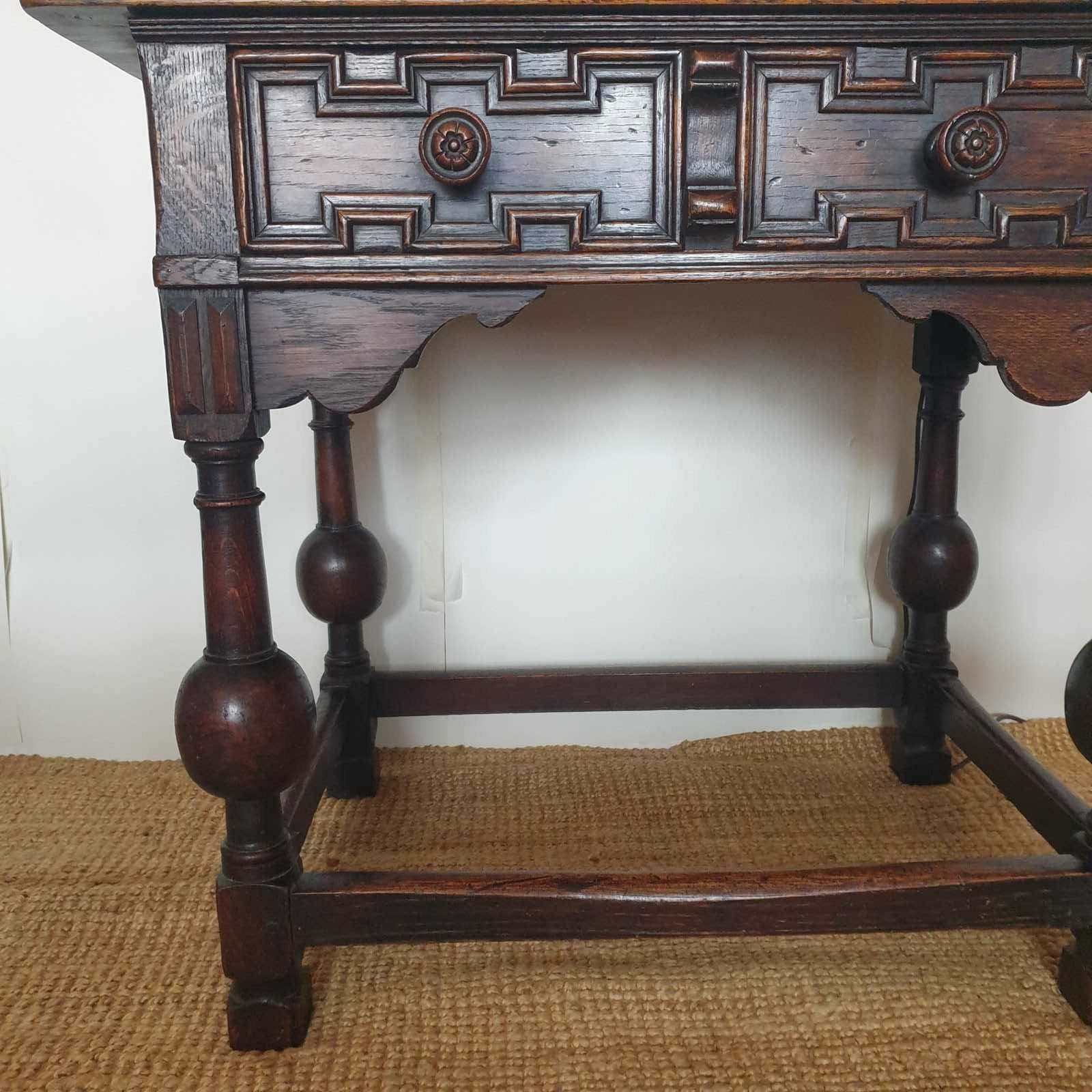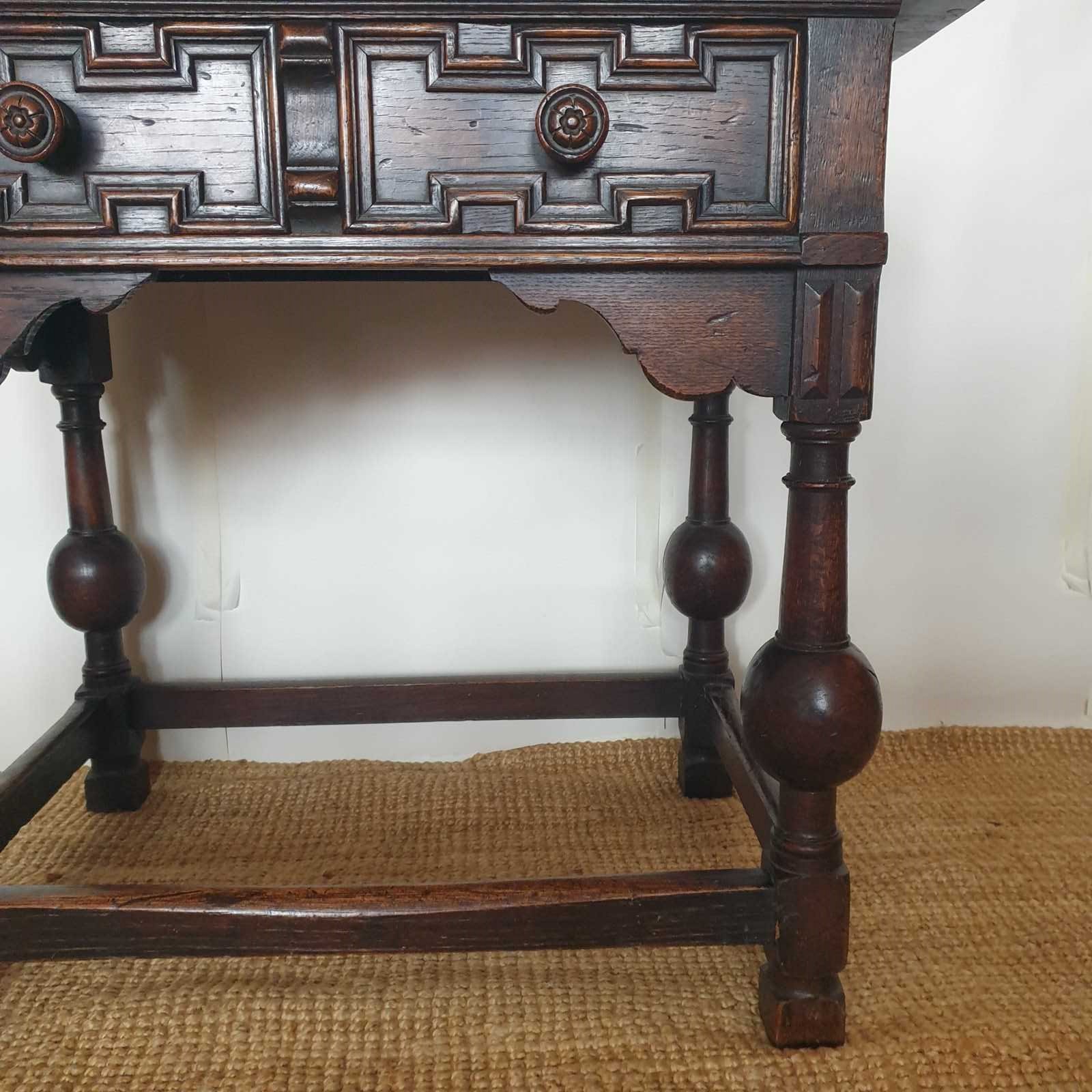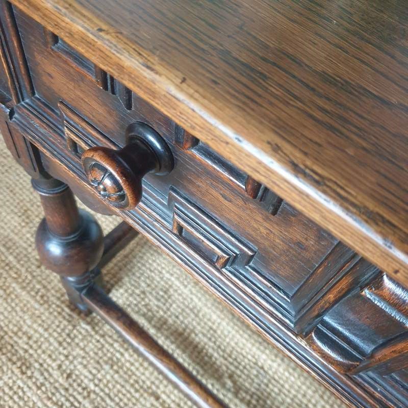 A great proportioned and detailed, decorative console table in a Baroque Flemish 17th century style. The table was probably made in the early 20th century , and has a wonderful raised graphic design to the drawer, and fabulous bulbous turned banister legs. With a very good patina and colour, this would be amazing in a hallway or living / bedroom, with the design complementing a traditional or eclectic home. In very good condition.