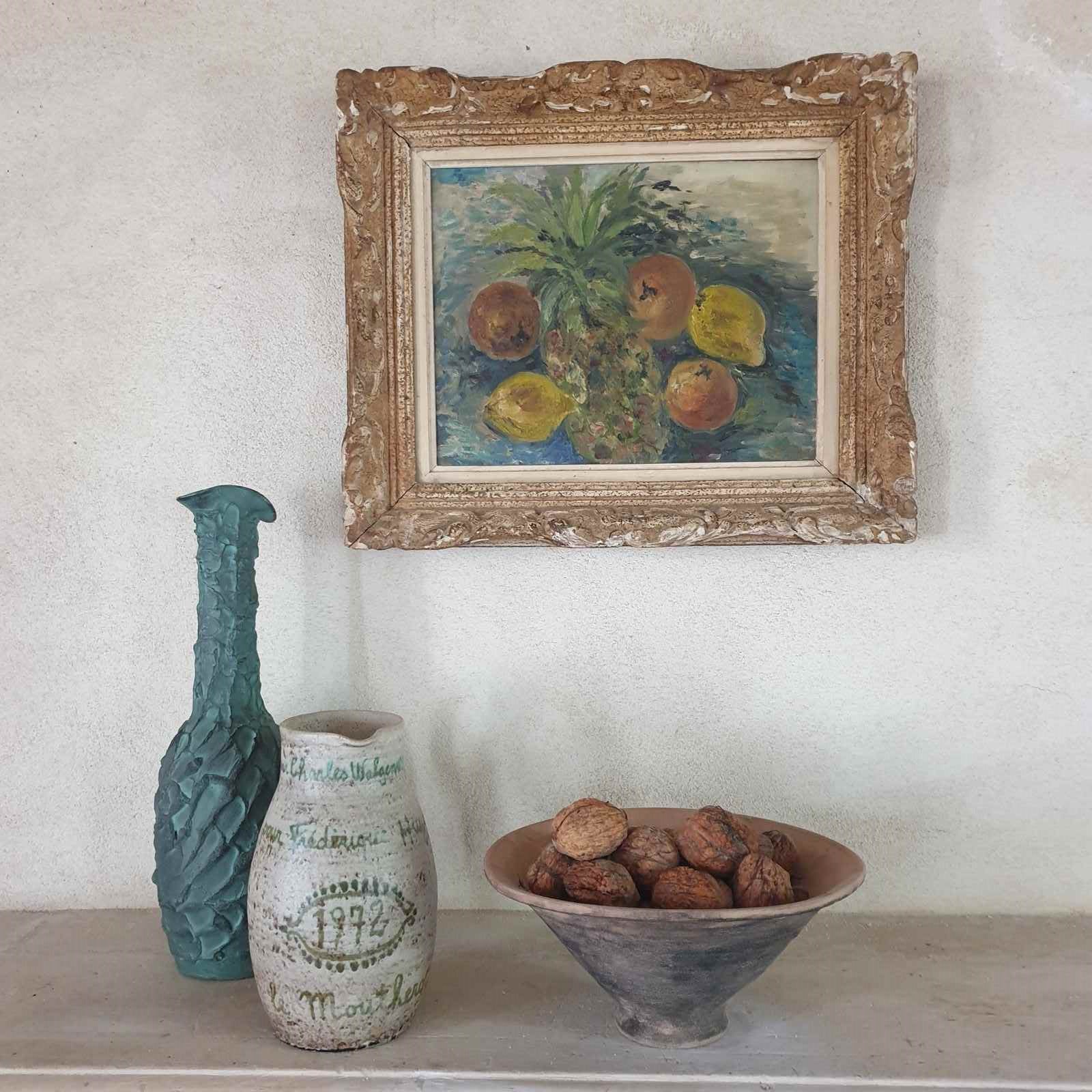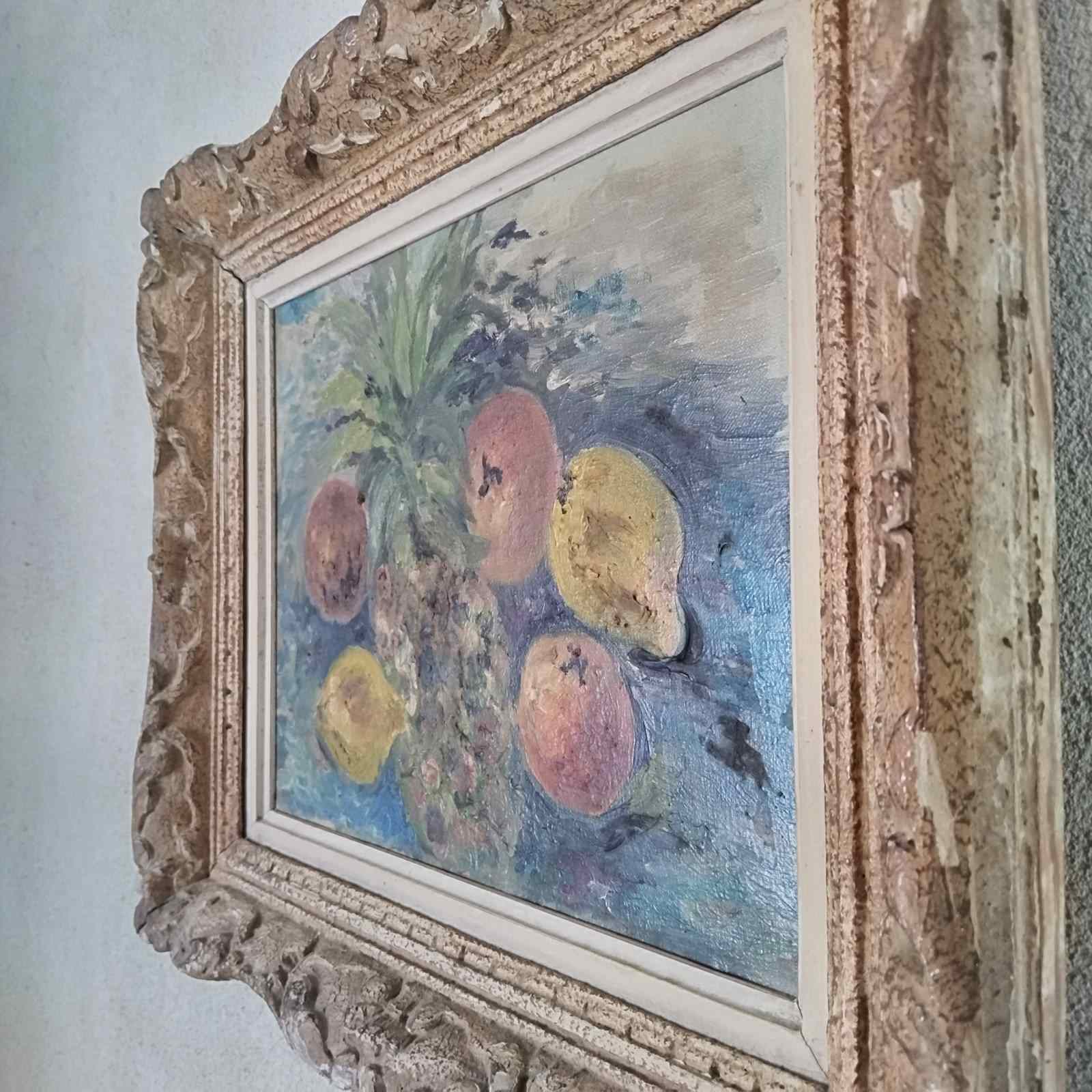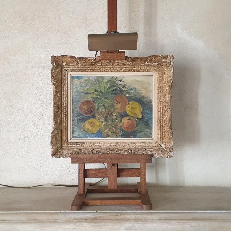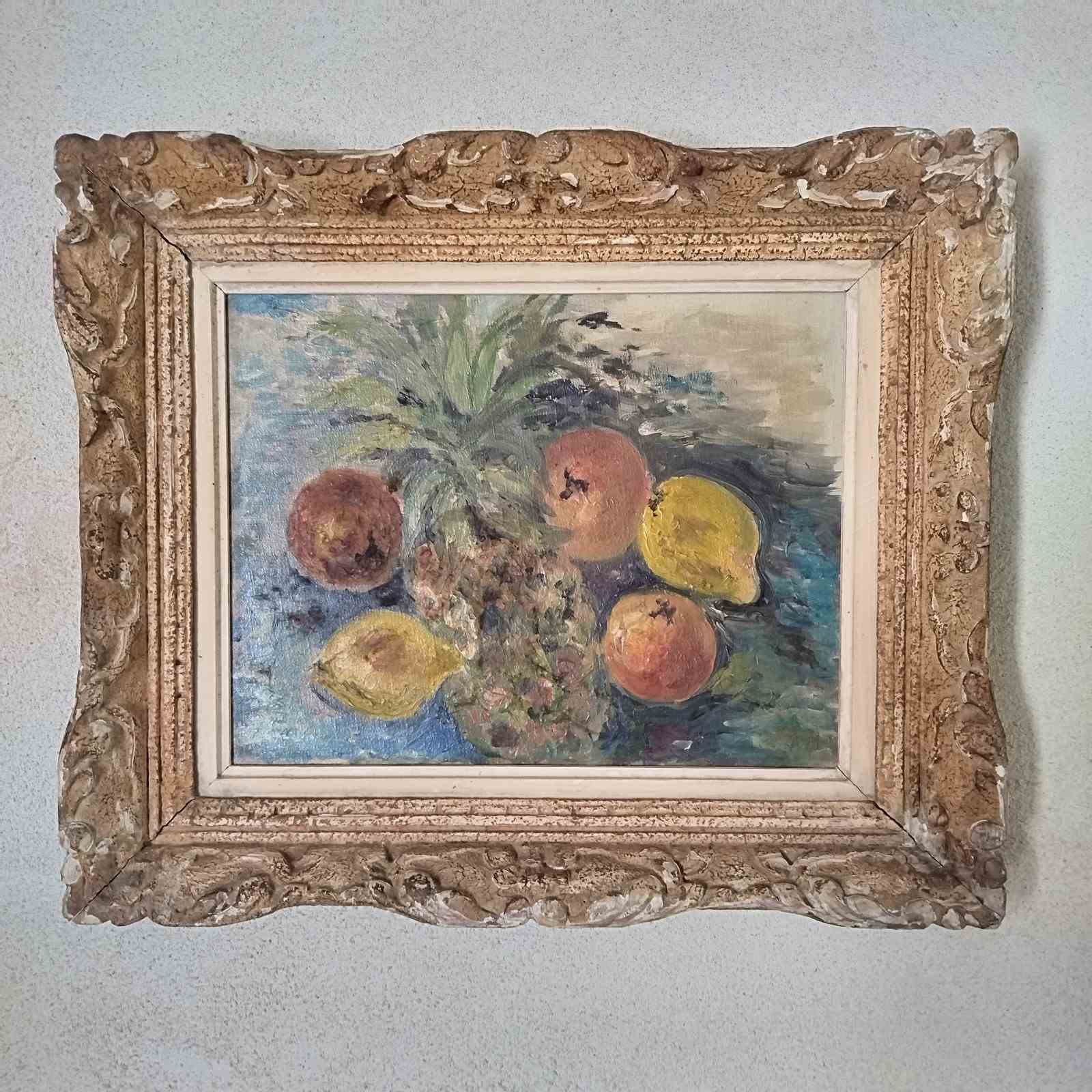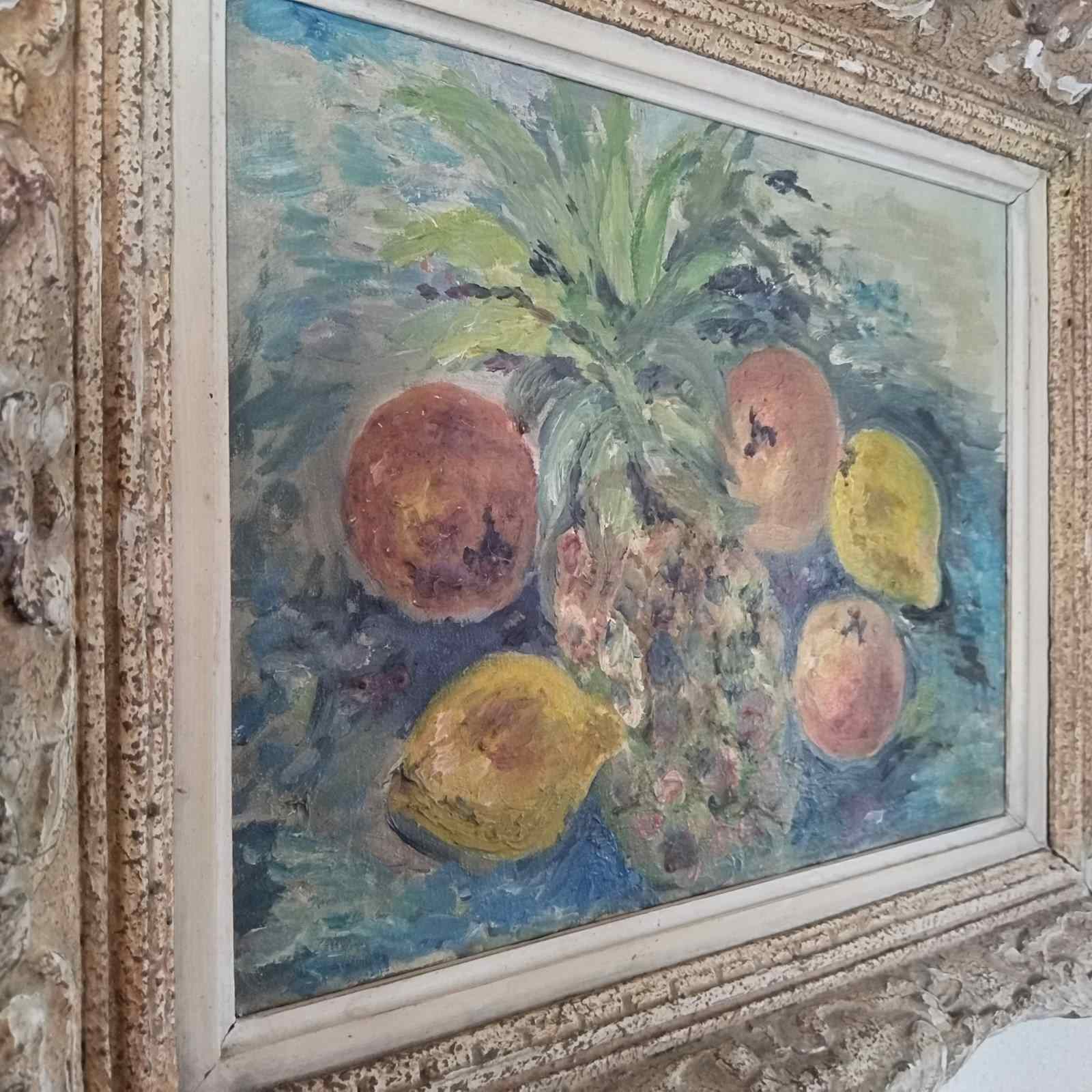 A good expressionist painting by French artist Augustine Merlier, possibly from the 1950's. Showing expressive brushstrokes and good use of colour, the painting is titled as "Still life with pineapple". It was entered into an exhibition of independent artists "Salon des Independantes" in Paris in 1967, and depicts citrus fruits and a pineapple, on a blue background. With its original Montparnasse frame, and complete with its exhibition past on the reverse side of the painting. A good sized painting with a bold frame which is sized 48cm x 41cm inc frame.